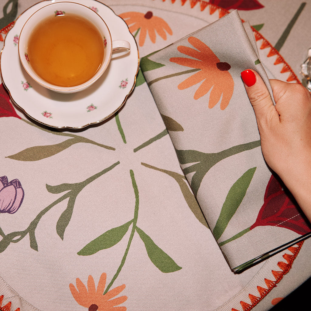 Six Napkins printed with our Picnic on the Meadow pattern. Elegant and unique, this gorgeous print elevates every table. Pair them with the tablecloth and placemats in the same print.