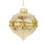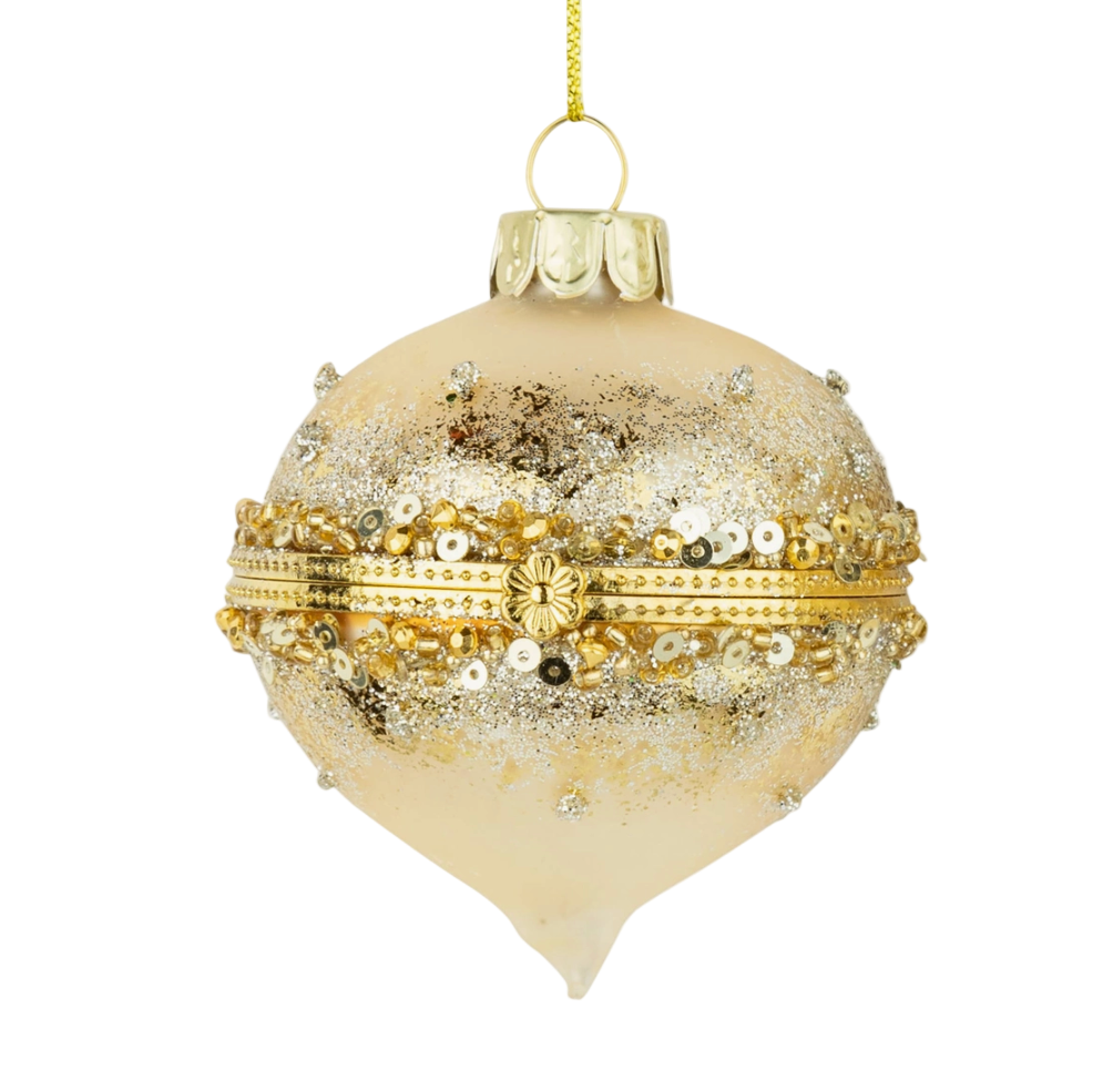 Glass keepsake ornament in a matte gold finish with a gold beaded center band. Measures 2.4". Due to the nature of the materials, slight color variations may occur between individual pieces and compared to images. These subtle differences do not affect the overall appearance.