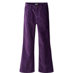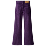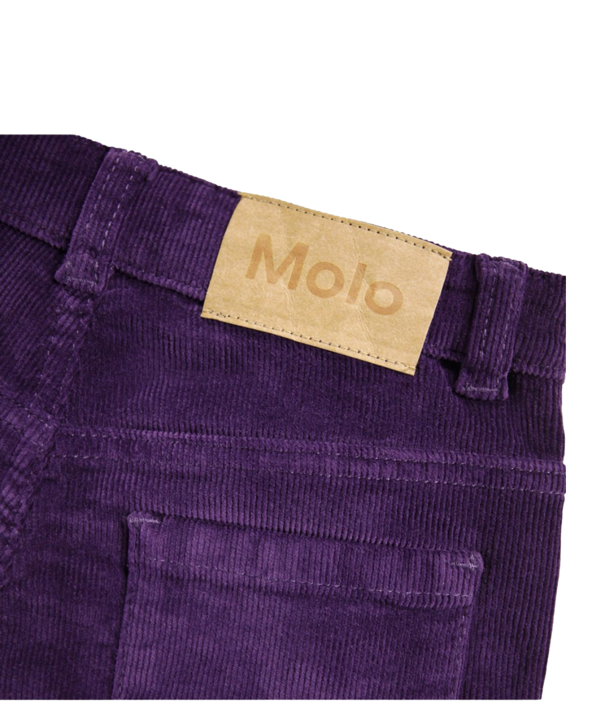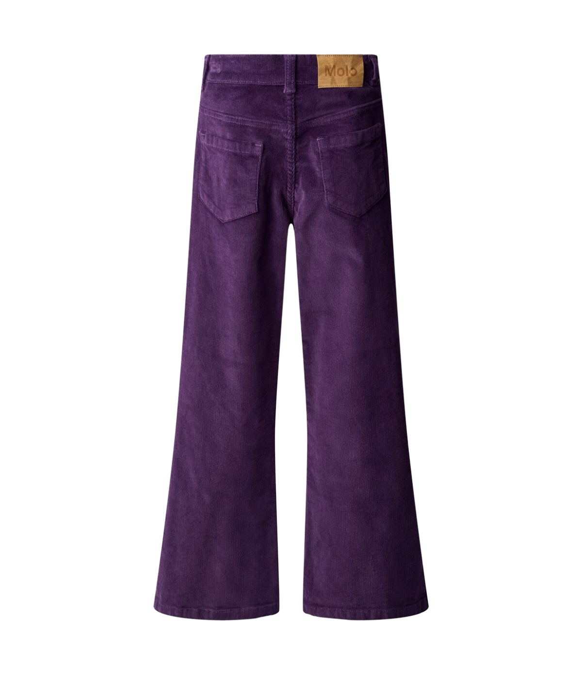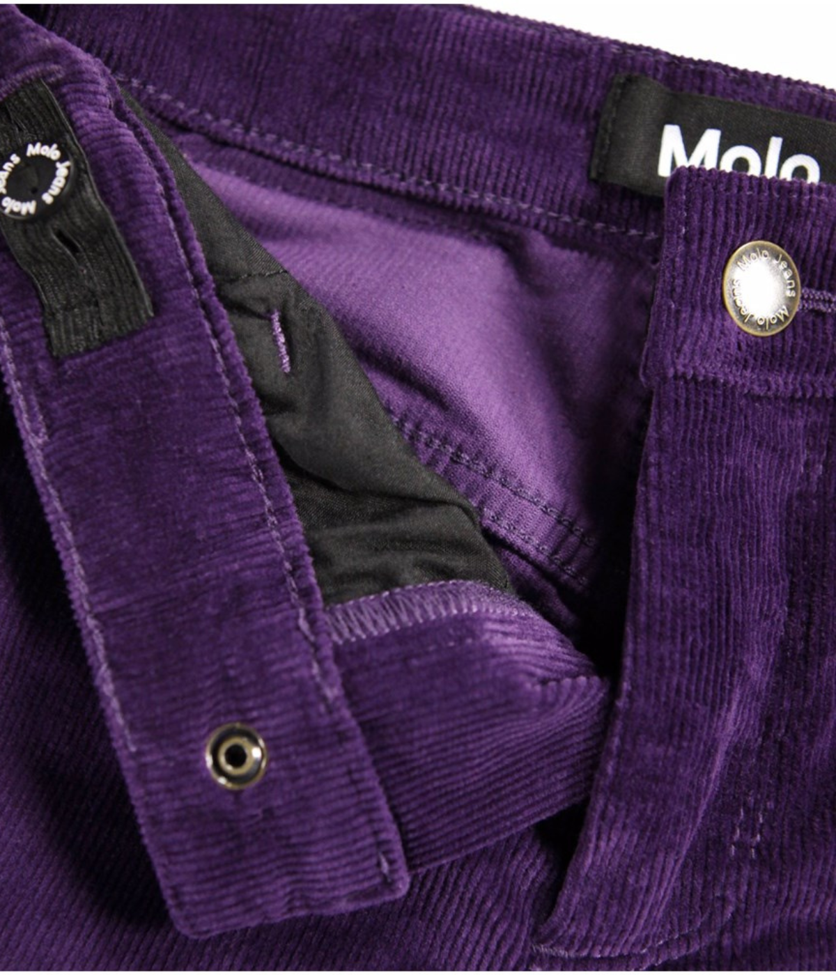 Purple pants made of soft cotton velvet in a trumpet-shaped silhouette. The pants have front and back pockets. The waist has a button and zip closure as well as an internal adjustable elastic for a good fit. Durable and easy to care for, they’re ideal for playtime or casual outings.