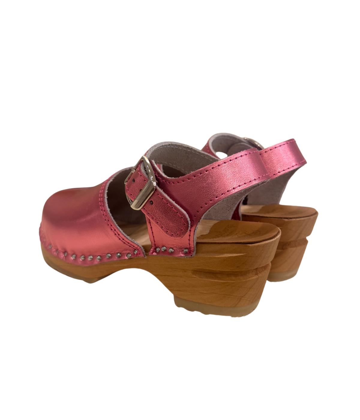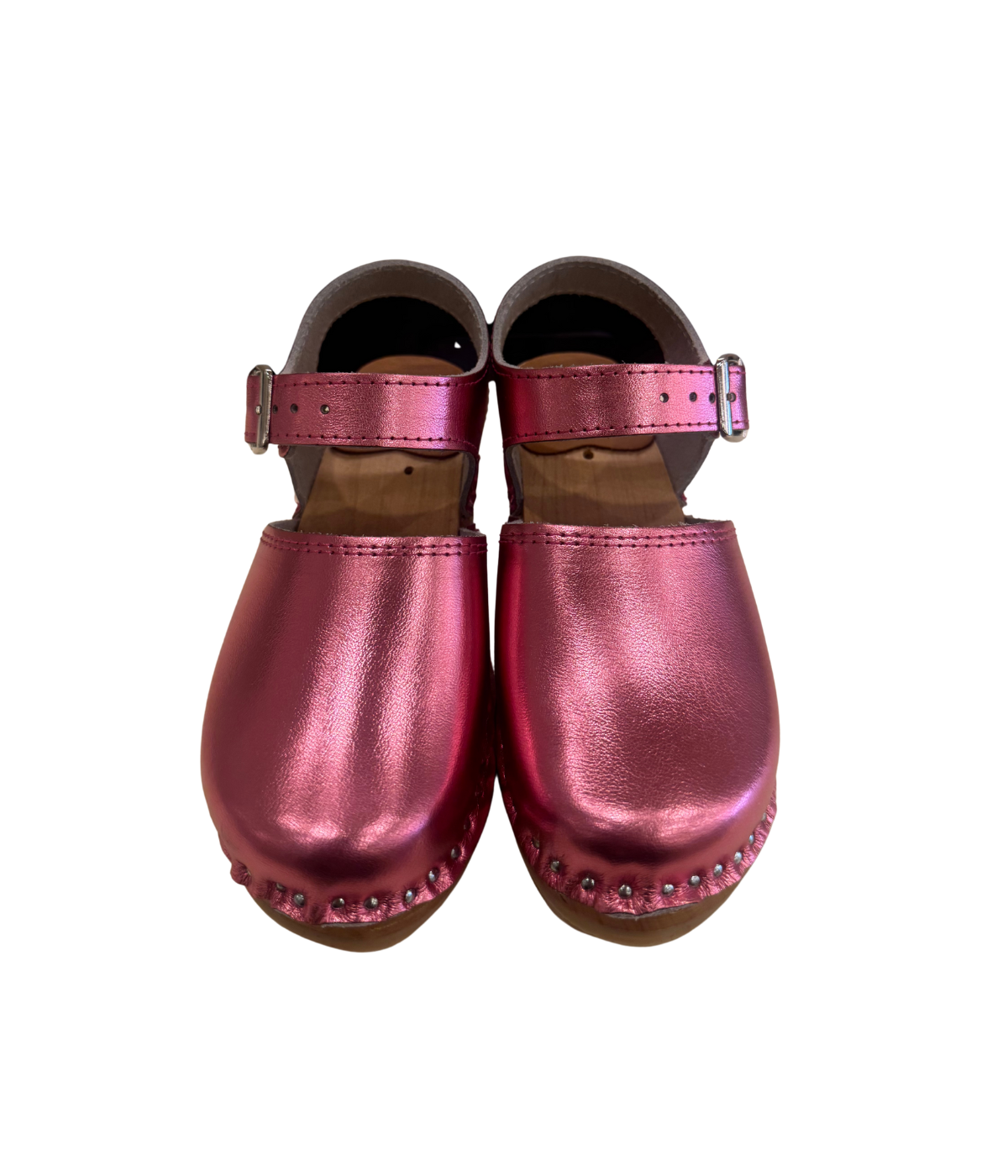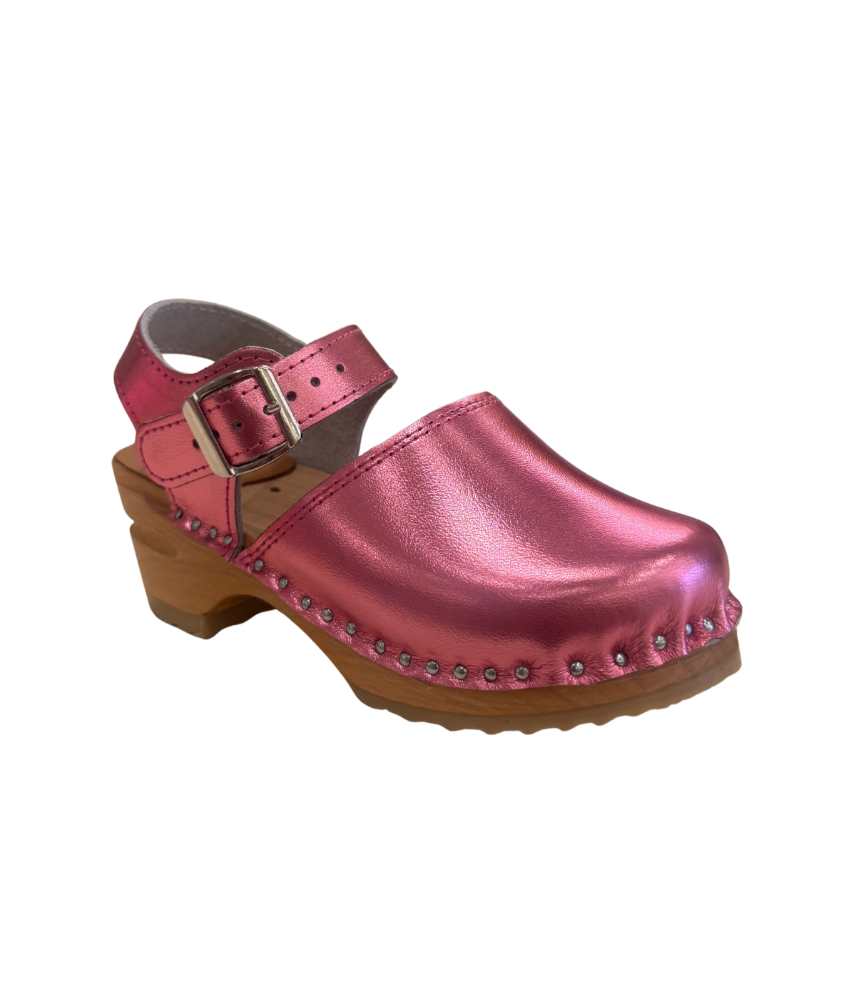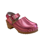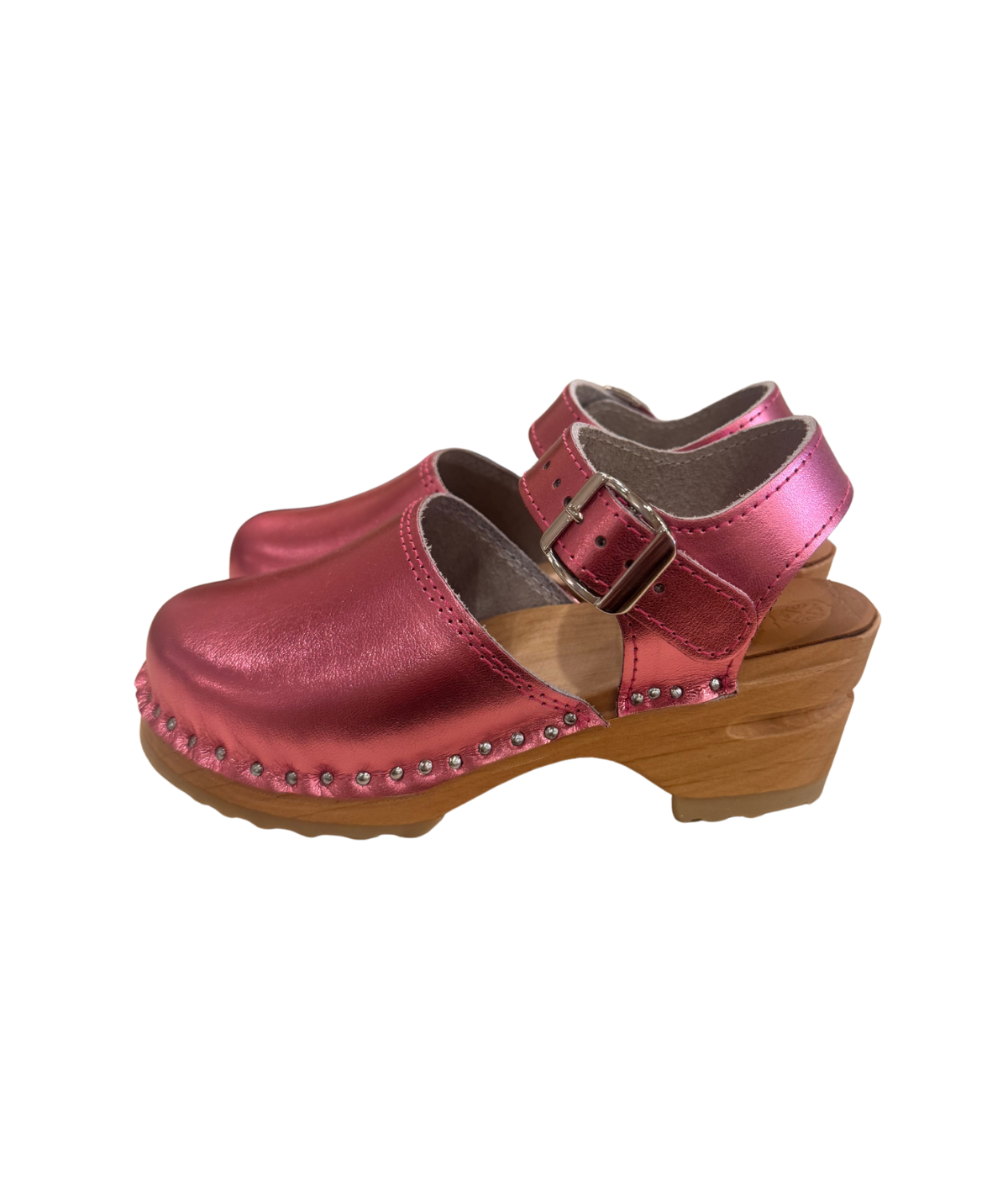Behold, the perfect clog for your little one! Made with a lovely pink leather, these sandals feature an adjustable ankle strap and a closed toe. And let's not forget about the varnished wooden bottoms - a delightful touch that will surely make your child stand out in style!