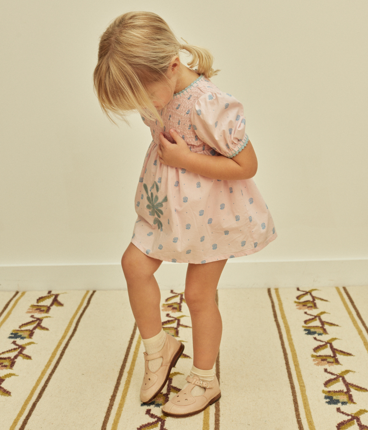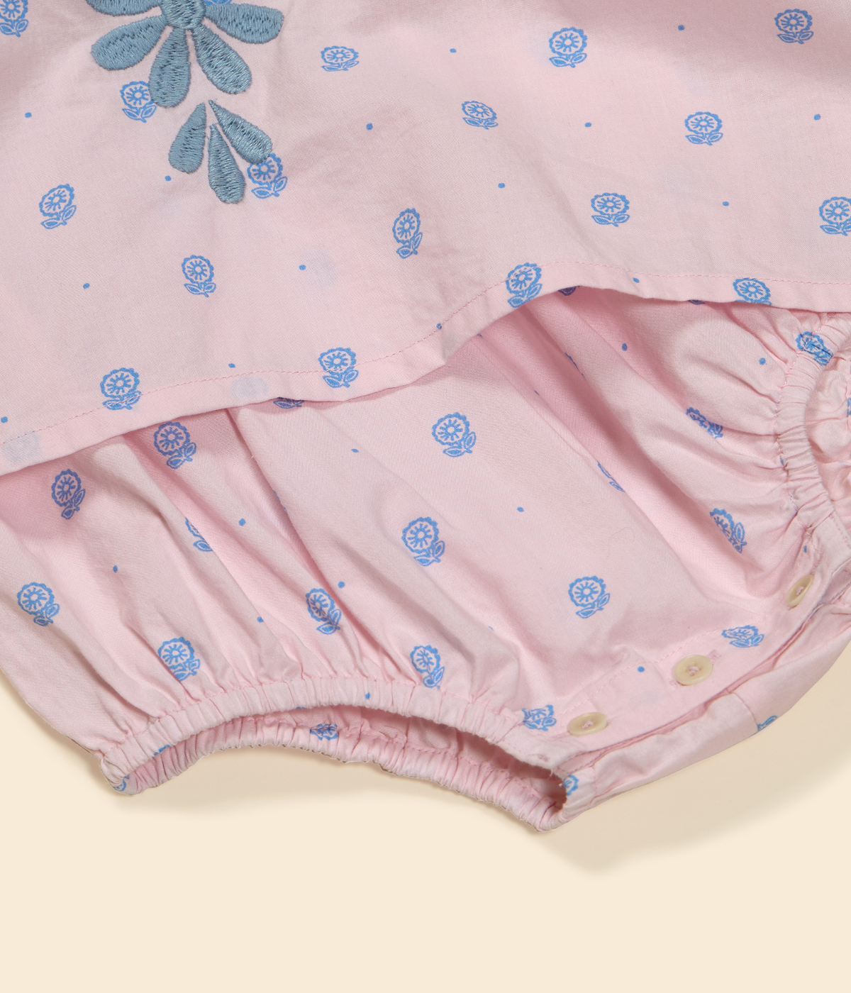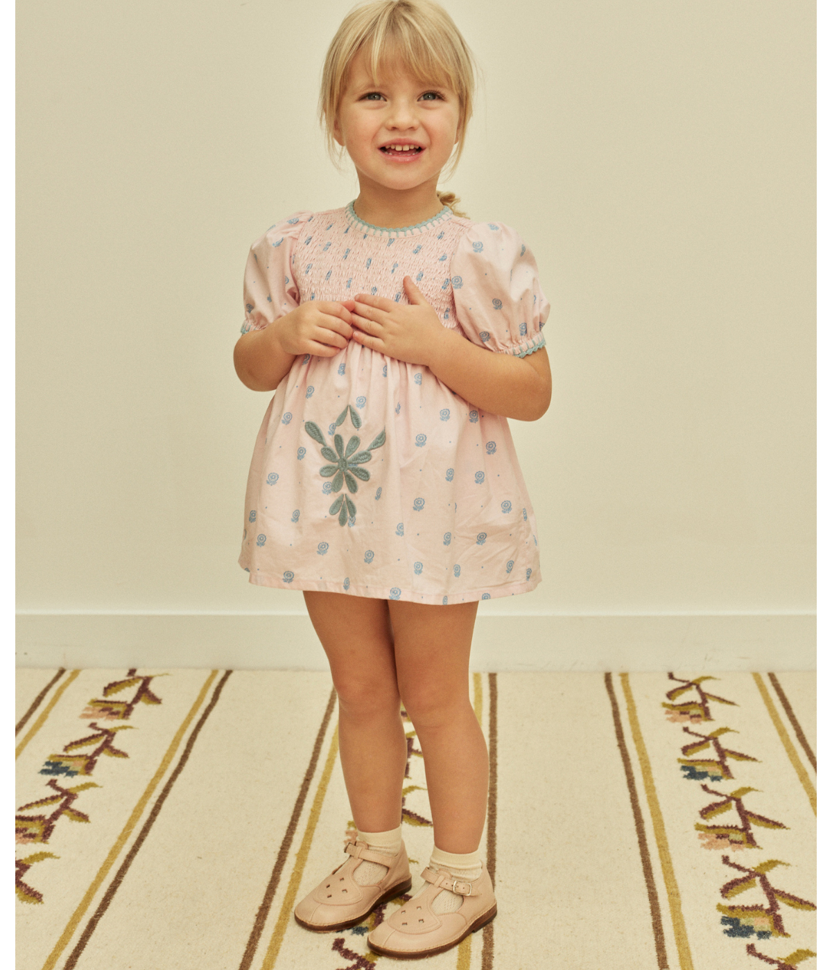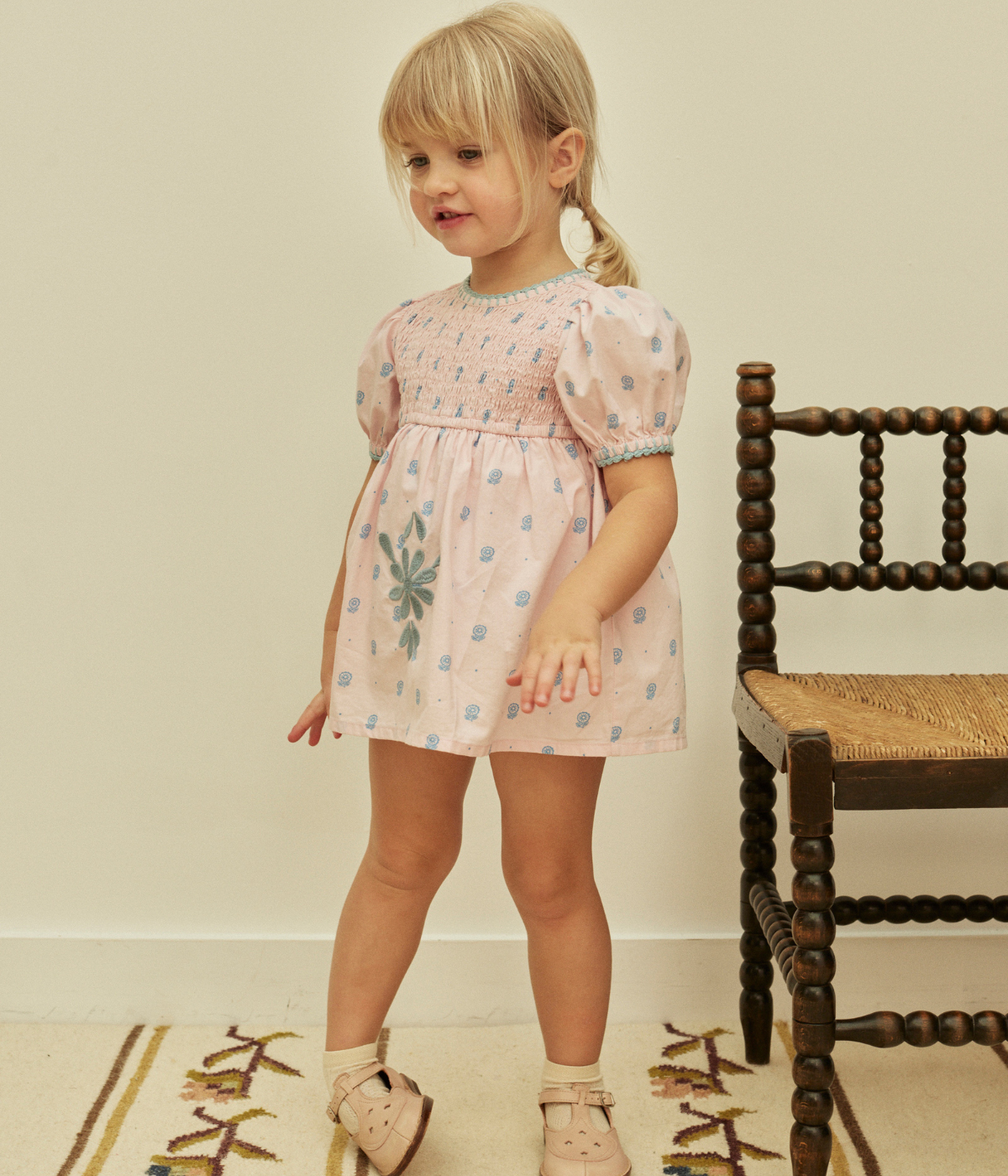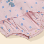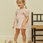 The pretty Noemie dress comes in the season’s ‘studio calico’ print cotton, with sweetly puffed sleeves, shirring at chest, contrast crochet at neckline and armholes, and Apolina’s signature contrast embroidery at skirt. Her inner romper features an elasticated legline and three buttons at crotch for easy changing. Invisible zip closure at back. We love Noemie’s sweet vintage mood.
