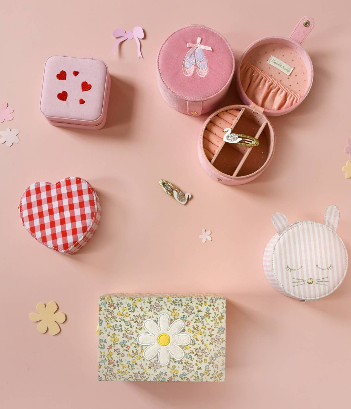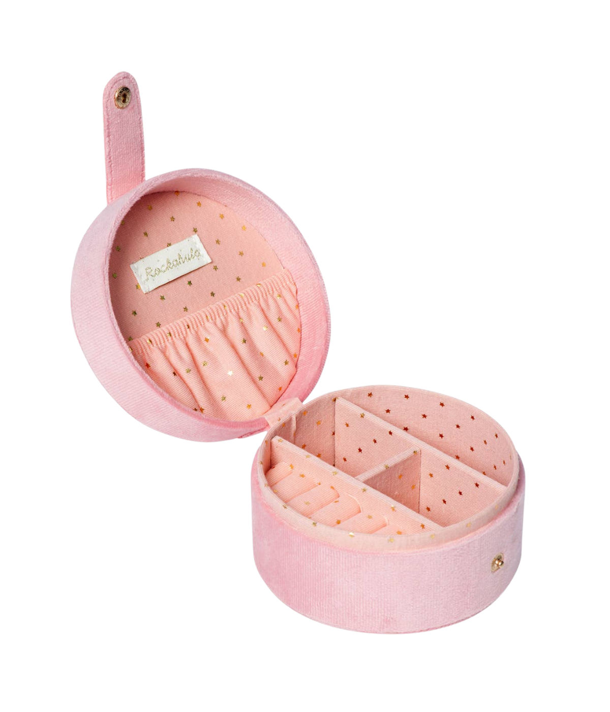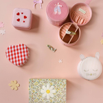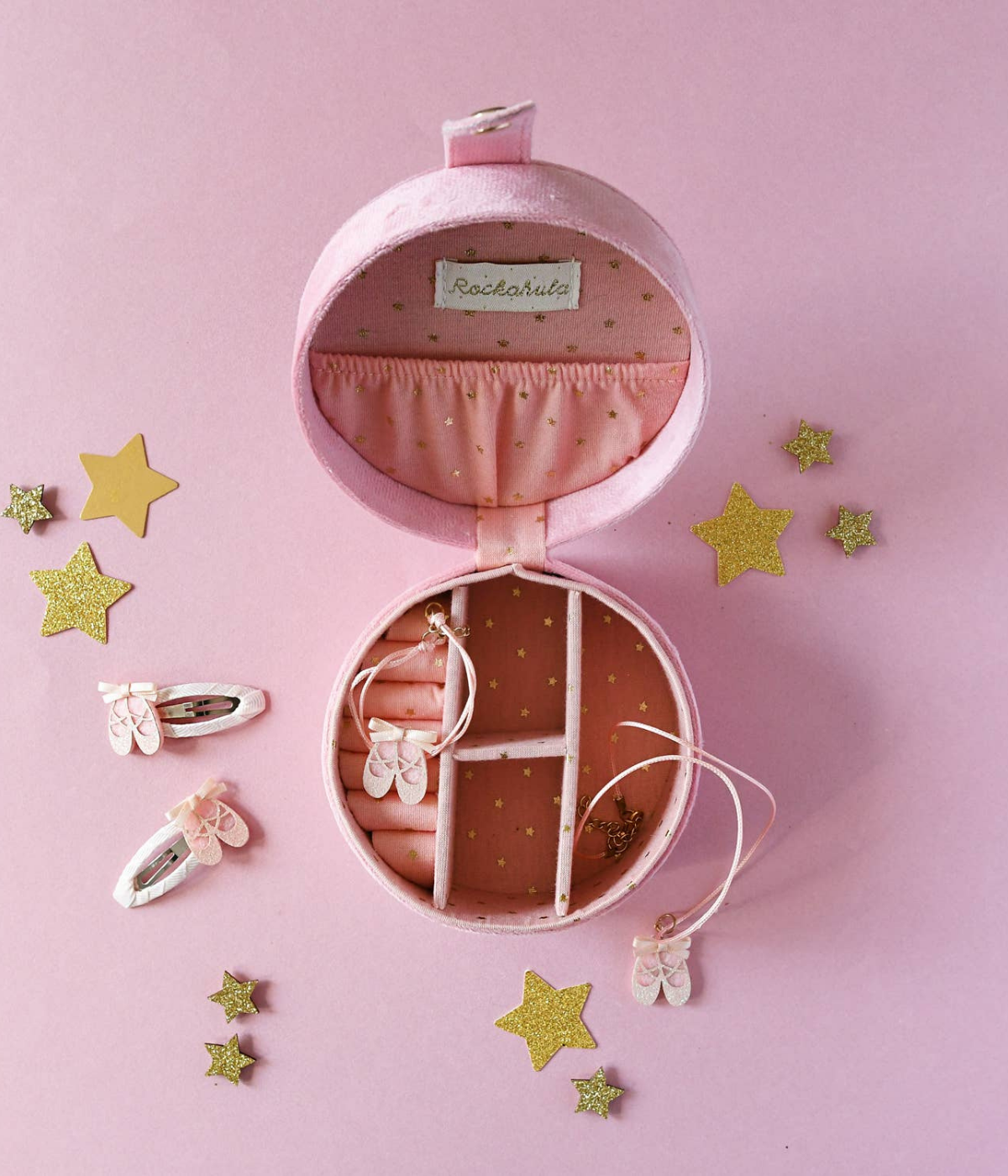 This lovely velvet jewellery box is the perfect place to keep all your Rockahula jewellery and favourite treasures safe! Featuring an embroidered pair of pink ballet slippers with satin ribbon detail, this jewellery box opens to reveal three compartments, a slip pocket and a dedicated space to slot earrings and rings. Lined with our starry fabric.