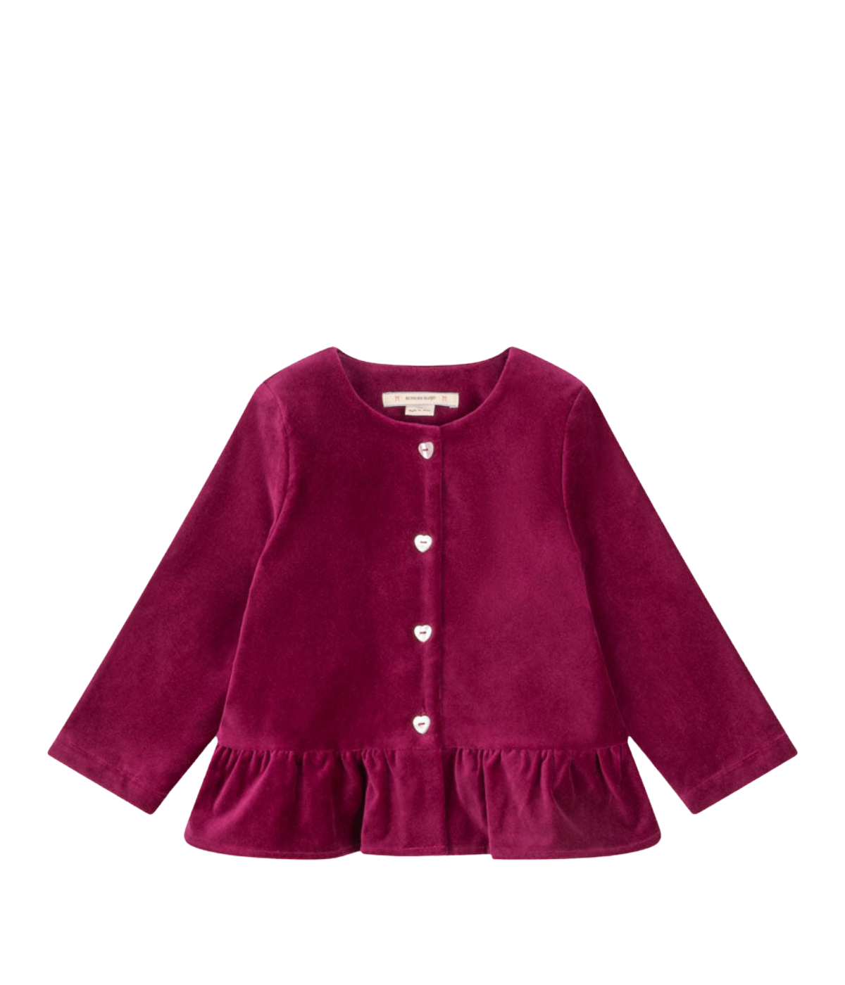 Soft shirt in a heavy velvet fabric that adds a sharp silhouette. Designed with heart shaped front buttons and a decorative peplum skirt.