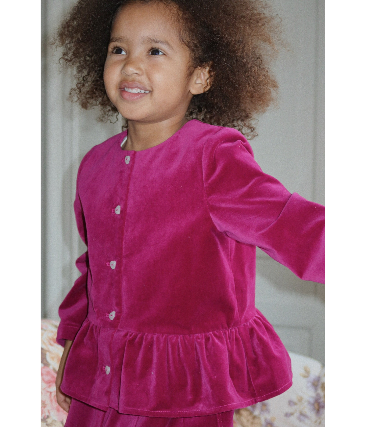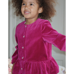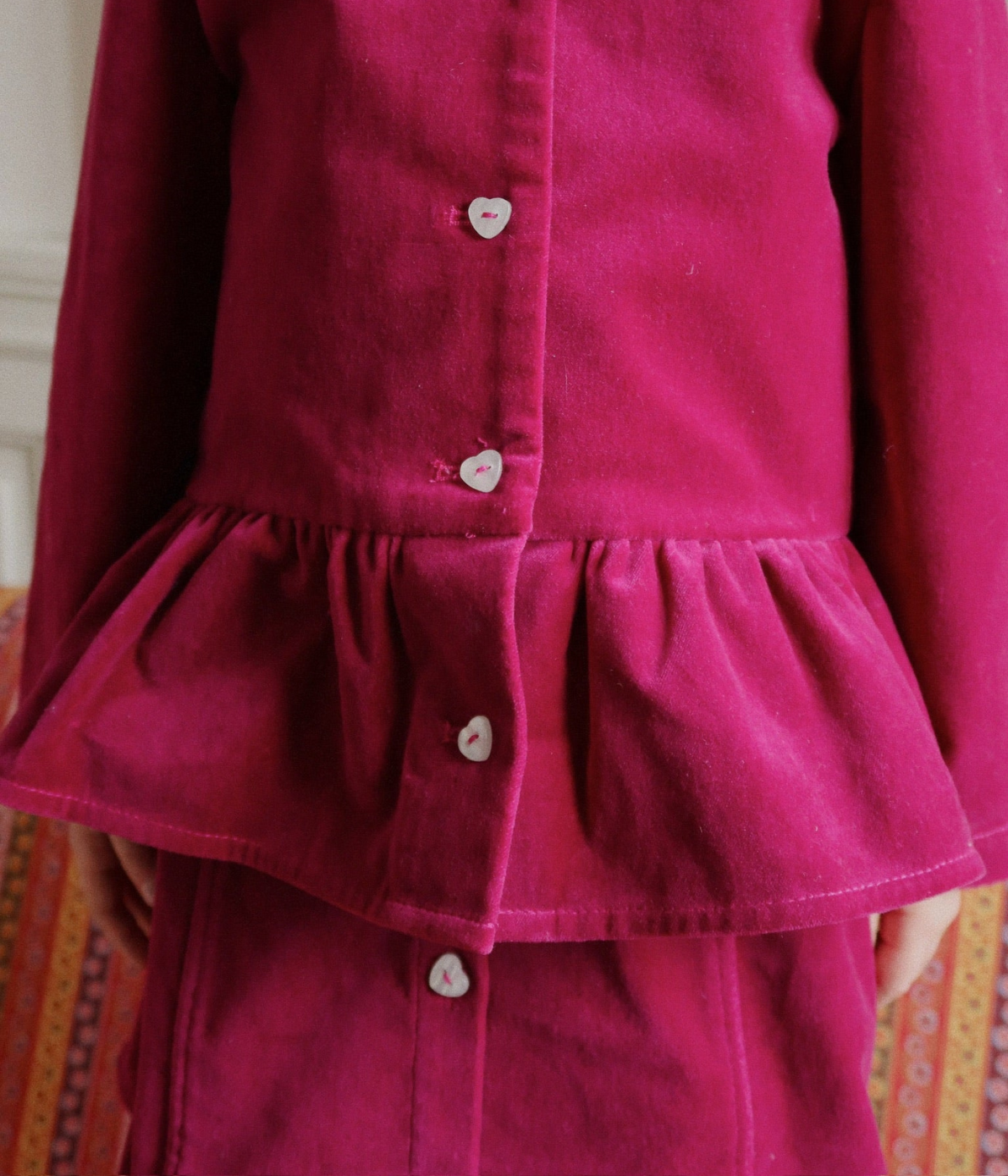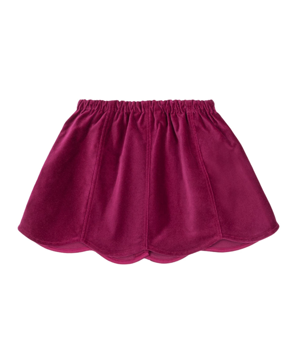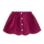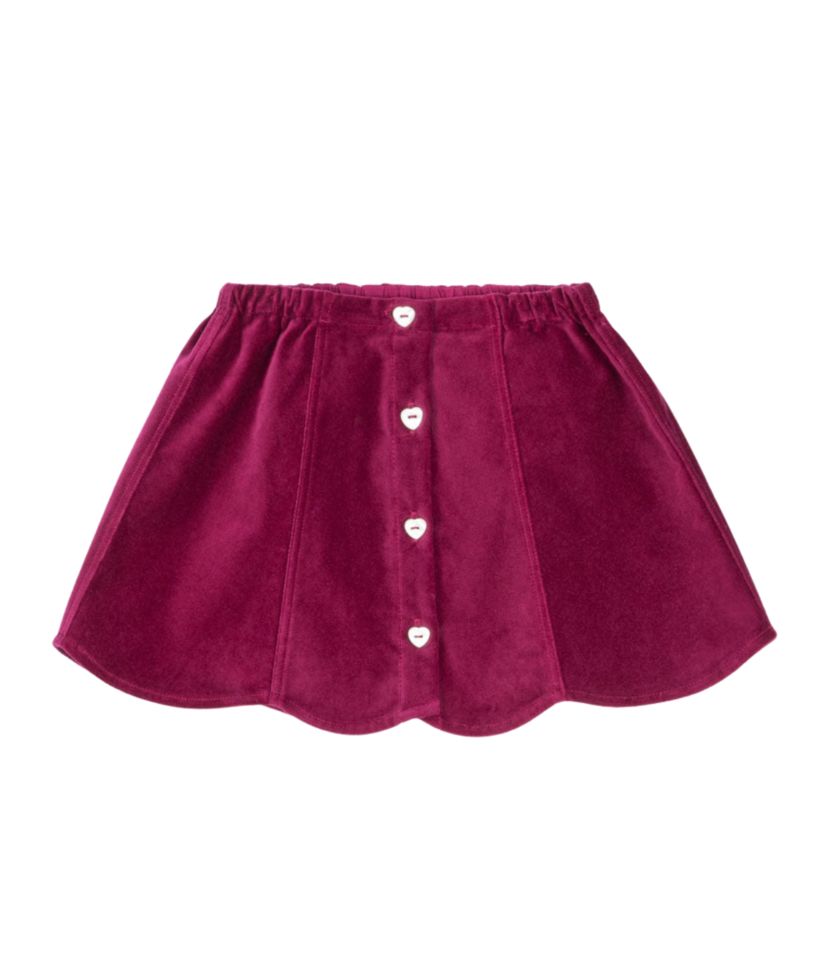 Soft skirt in a heavy velvet fabric that adds a sharp silhouette. Designed with heart shaped front buttons and decorative scallop edges.