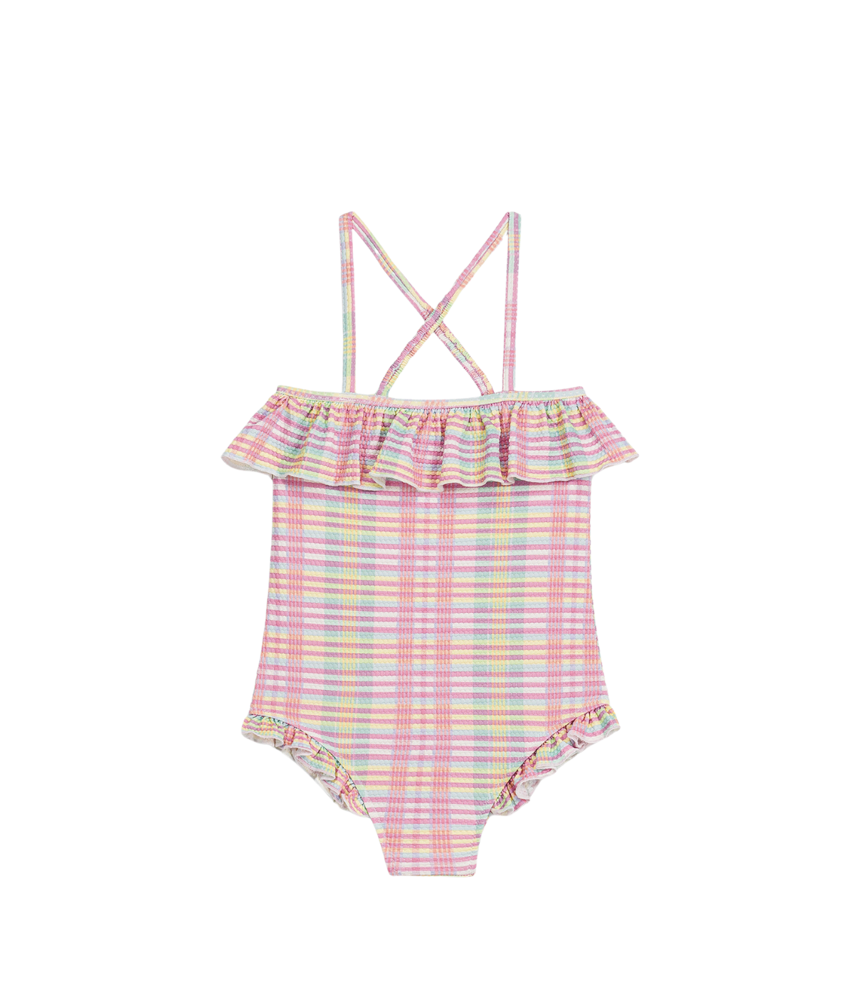 Experience the perfect blend of style and comfort with the Bathing Suit Jovana crafted from waffle swimwear fabric in charming Pink Island Checks. This breathable, textured fabric offers a flattering fit that moves with you, making every swim or sun-soaked day effortlessly chic.