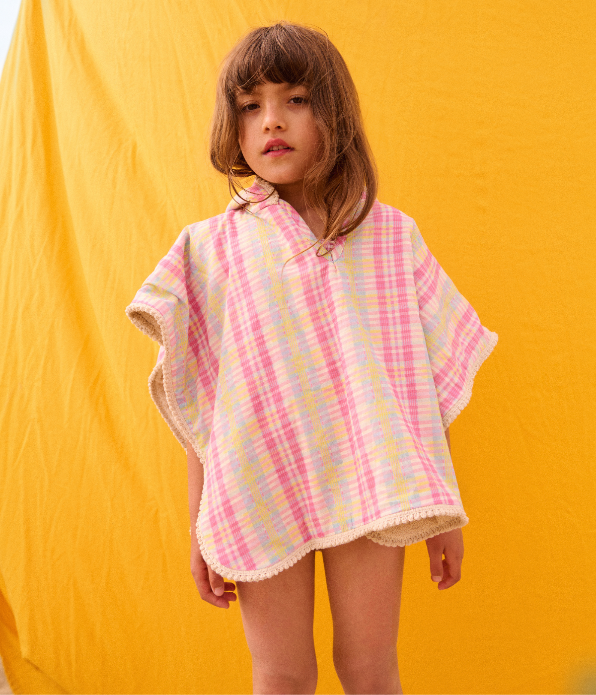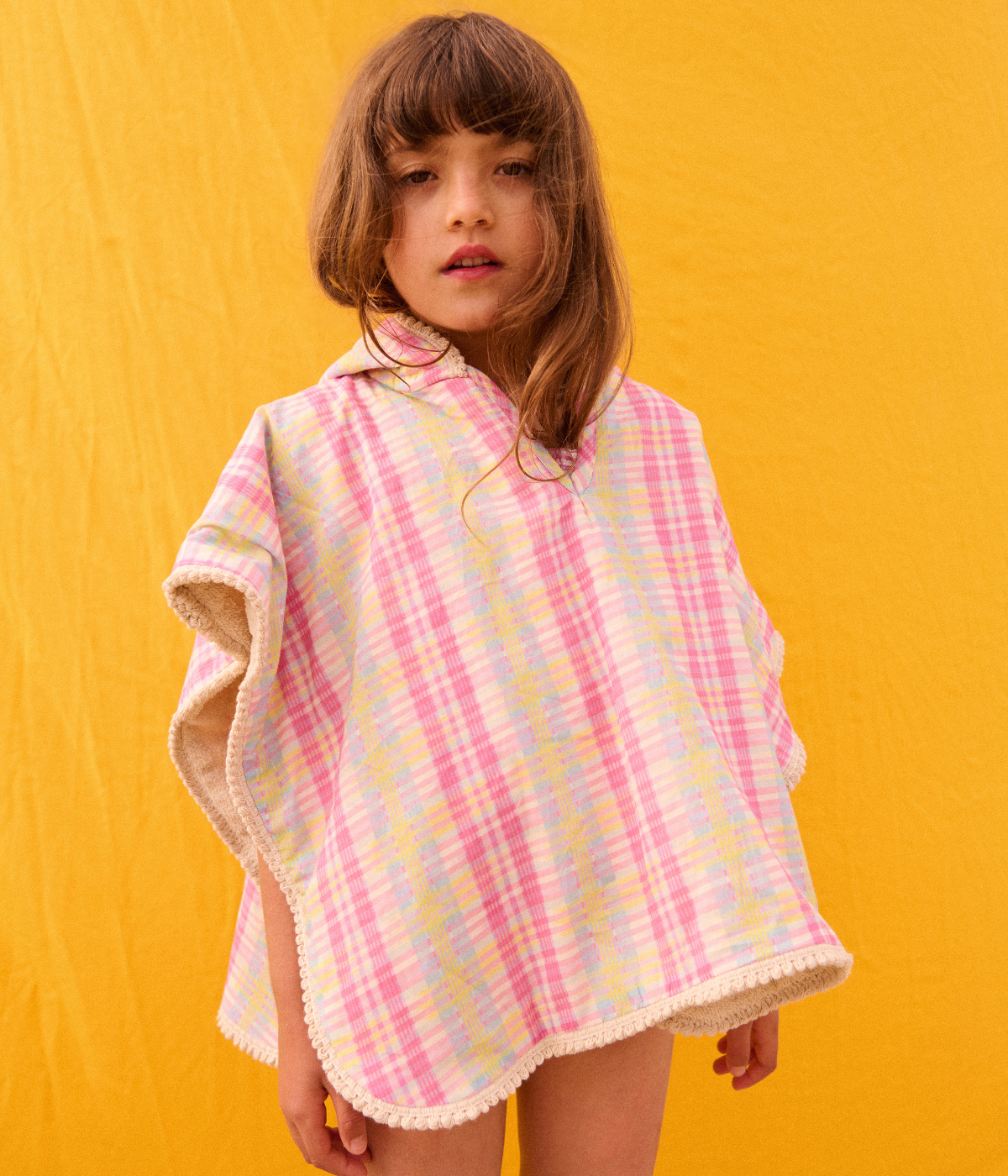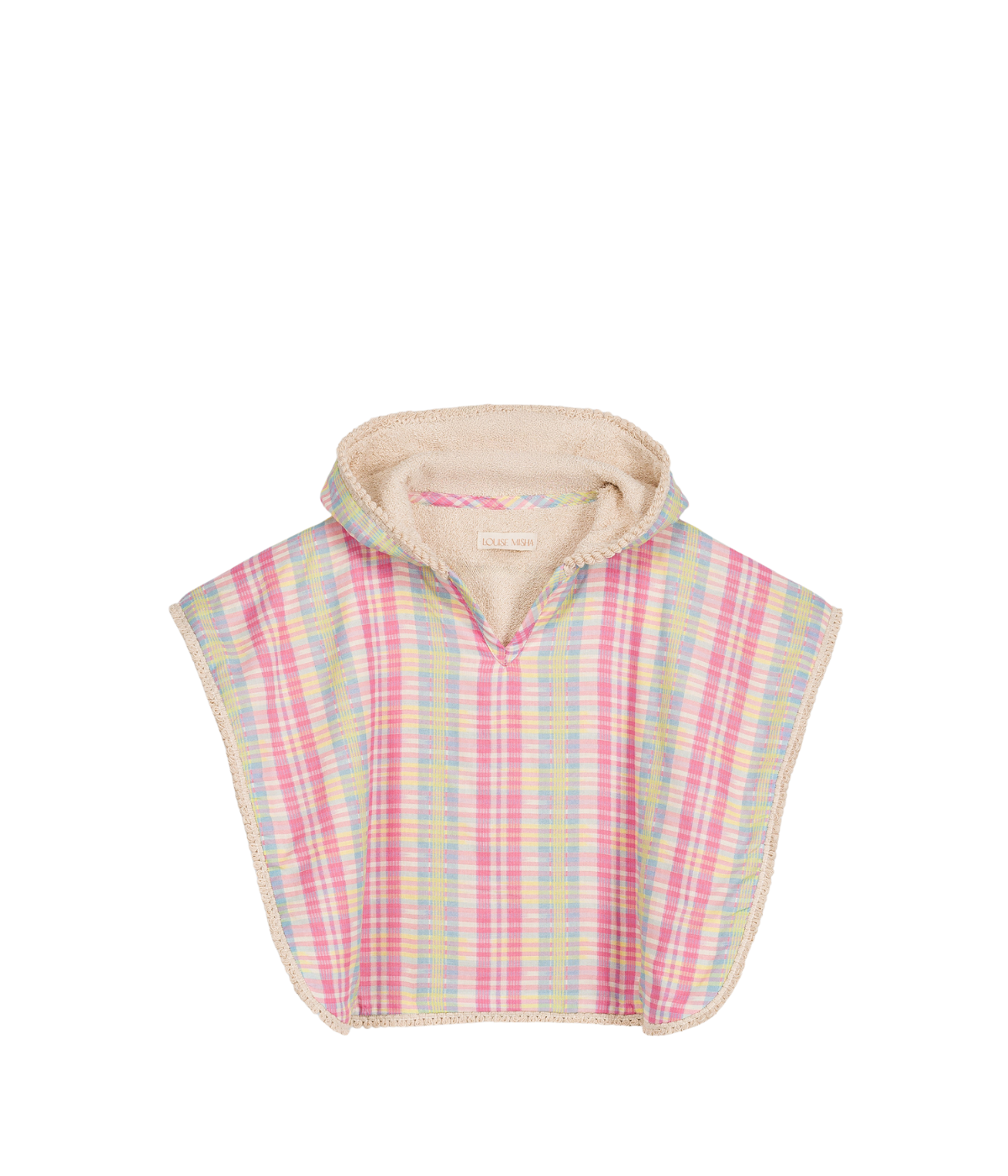 Elevate your beachwear with the Beach Cape Mael, crafted from lightweight cotton voile in a vibrant Pink Island Checks pattern. This airy cape offers comfortable coverage while enhancing your seaside style.