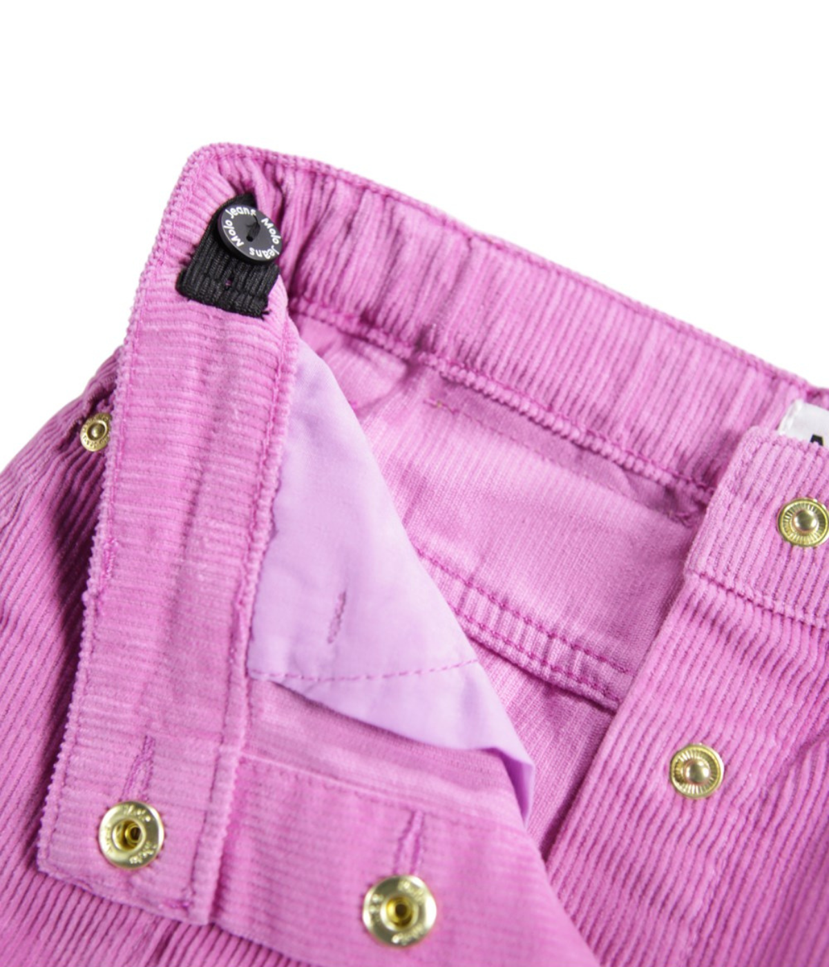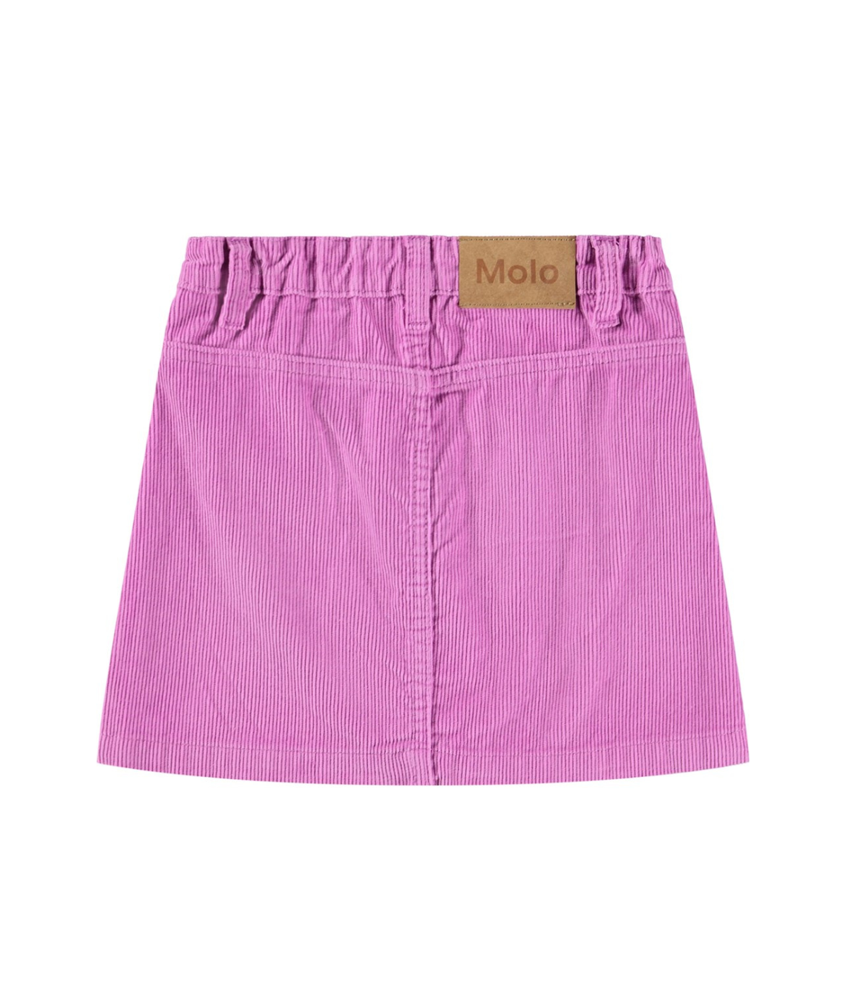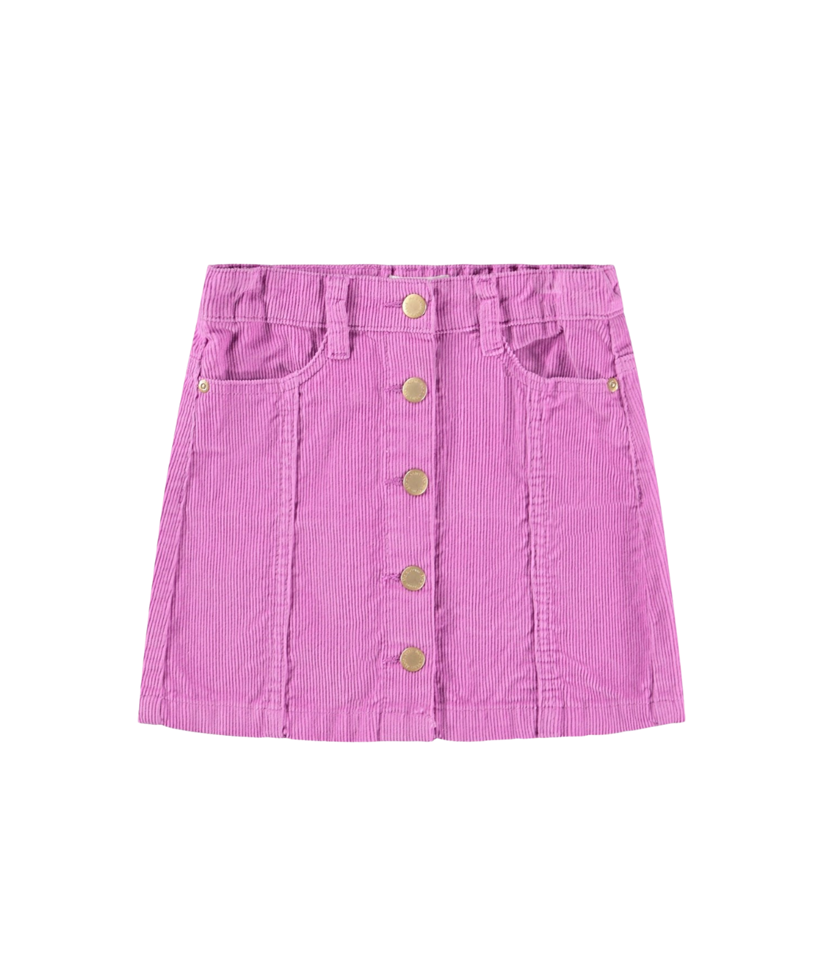 Corduroy skirt with buttons for fastening. The skirt reaches mid-thigh and has a waist with belt loops and front pockets. The beautiful cut includes detailed stitching that runs from the pockets down.