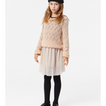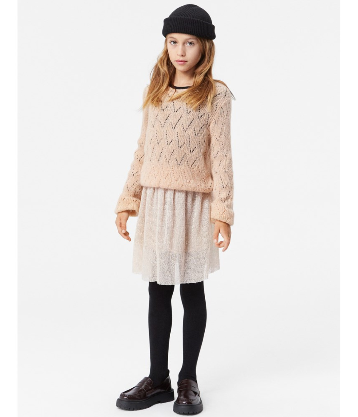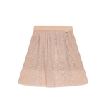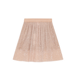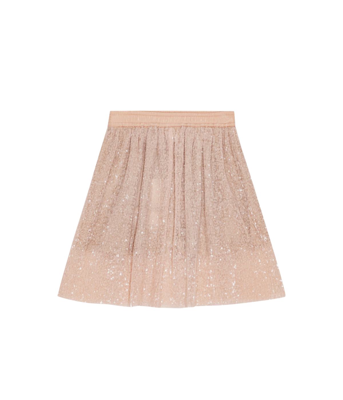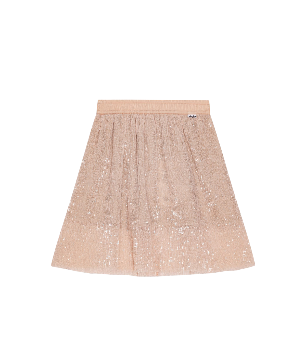 Knee-length powder-colored sequined skirt. The skirt has elastic at the waist and an underskirt, so the sequin skirt falls nicely and smoothly over it.