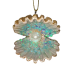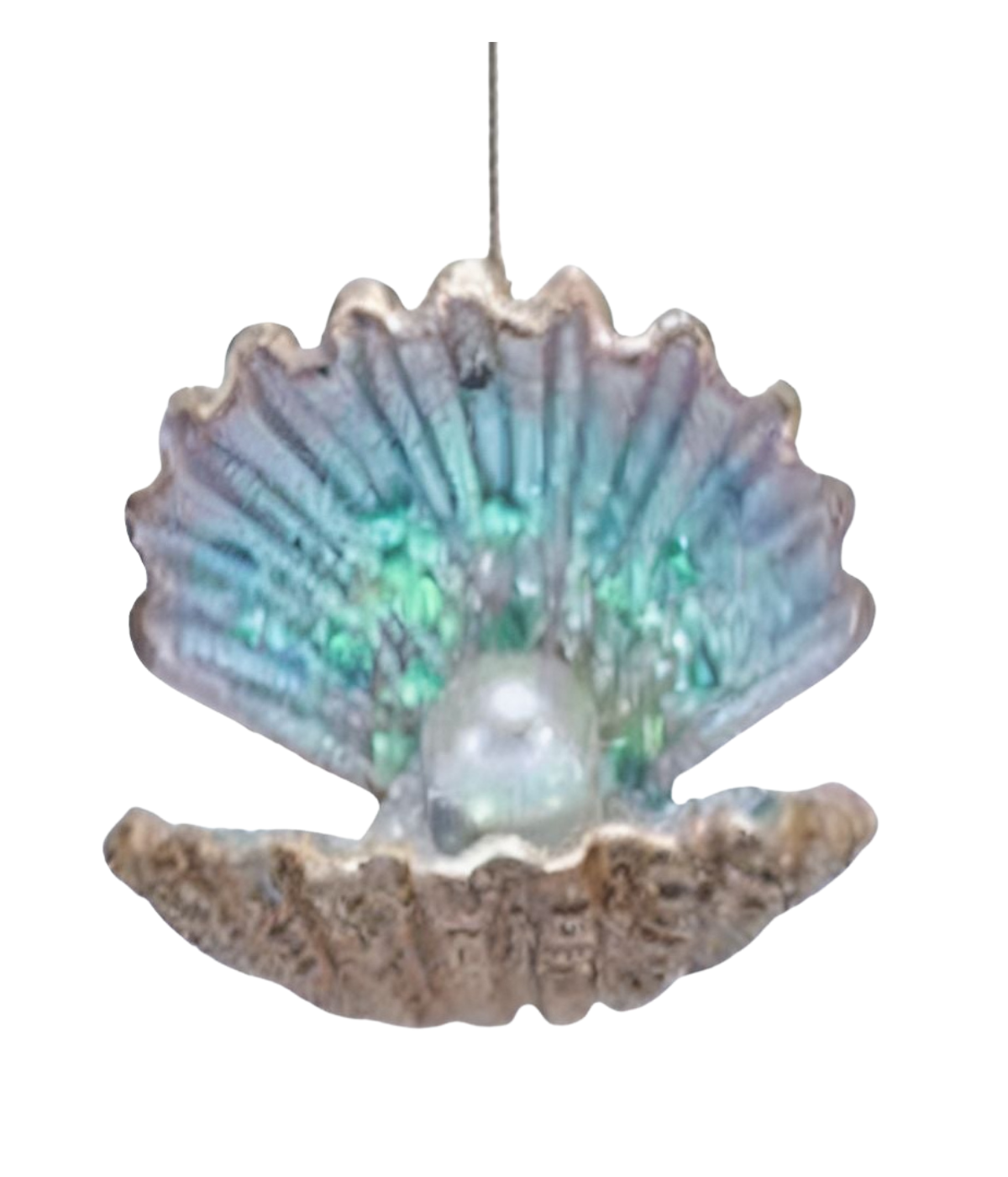 Painted resin clam shell ornament featuring a pearl accent. Measures 2.75". Please note: due to the nature of the materials and hand-finishing details, slight color variations may occur from piece to piece and from what is shown online. These subtle differences do not affect the overall appearance.
