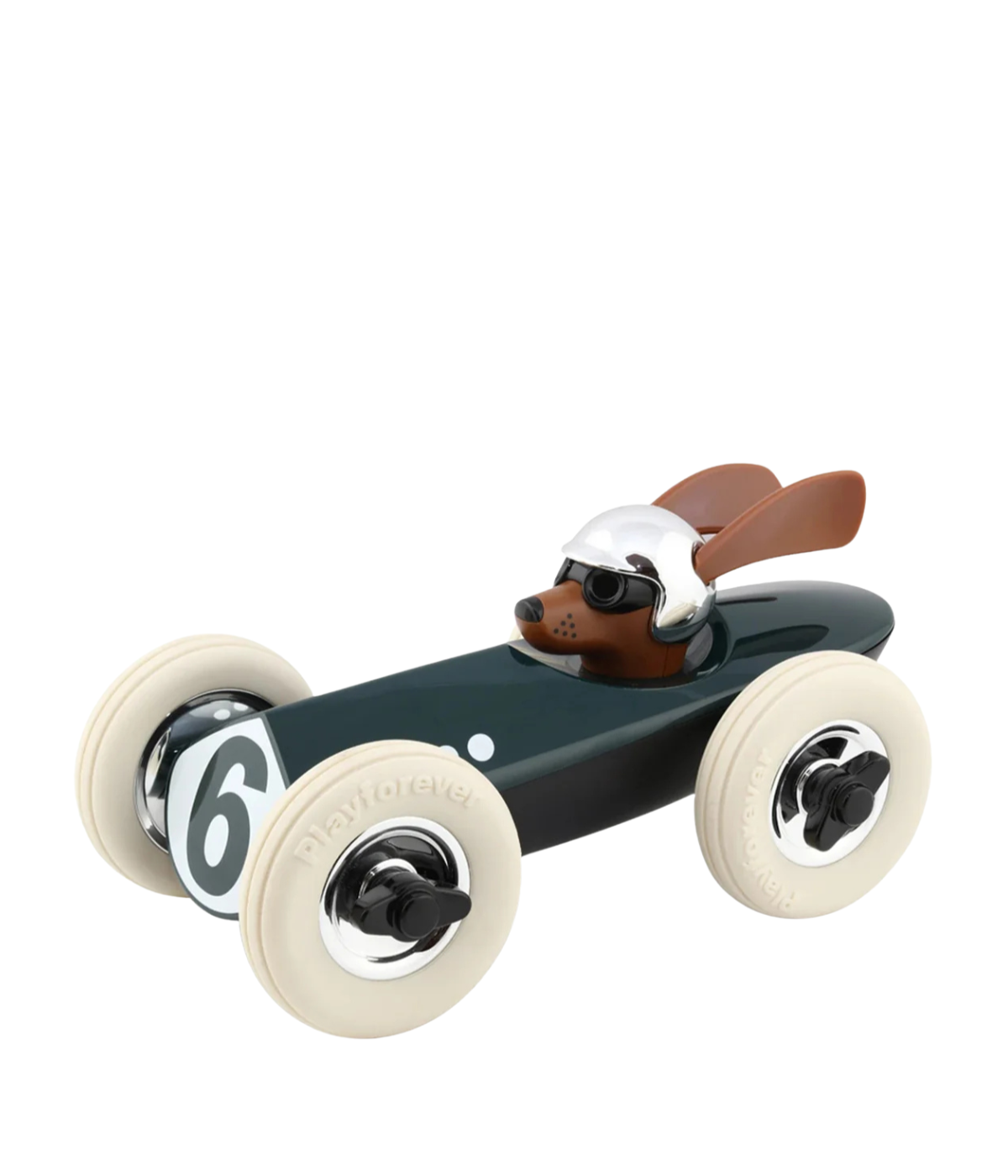 Playforever's collaboration with Hugo Boss resulted in the Rufus collection. The Rufus car, with its cool canine driver and dynamic dog ears, has a streamlined shape: a geometric front and pointed 'ridge' on the bonnet top, smoothing out to a rounded form at the back.