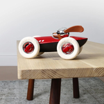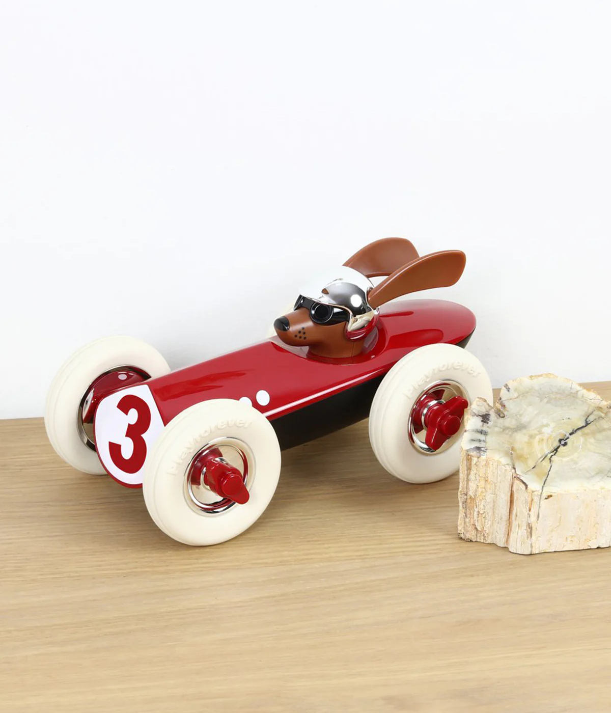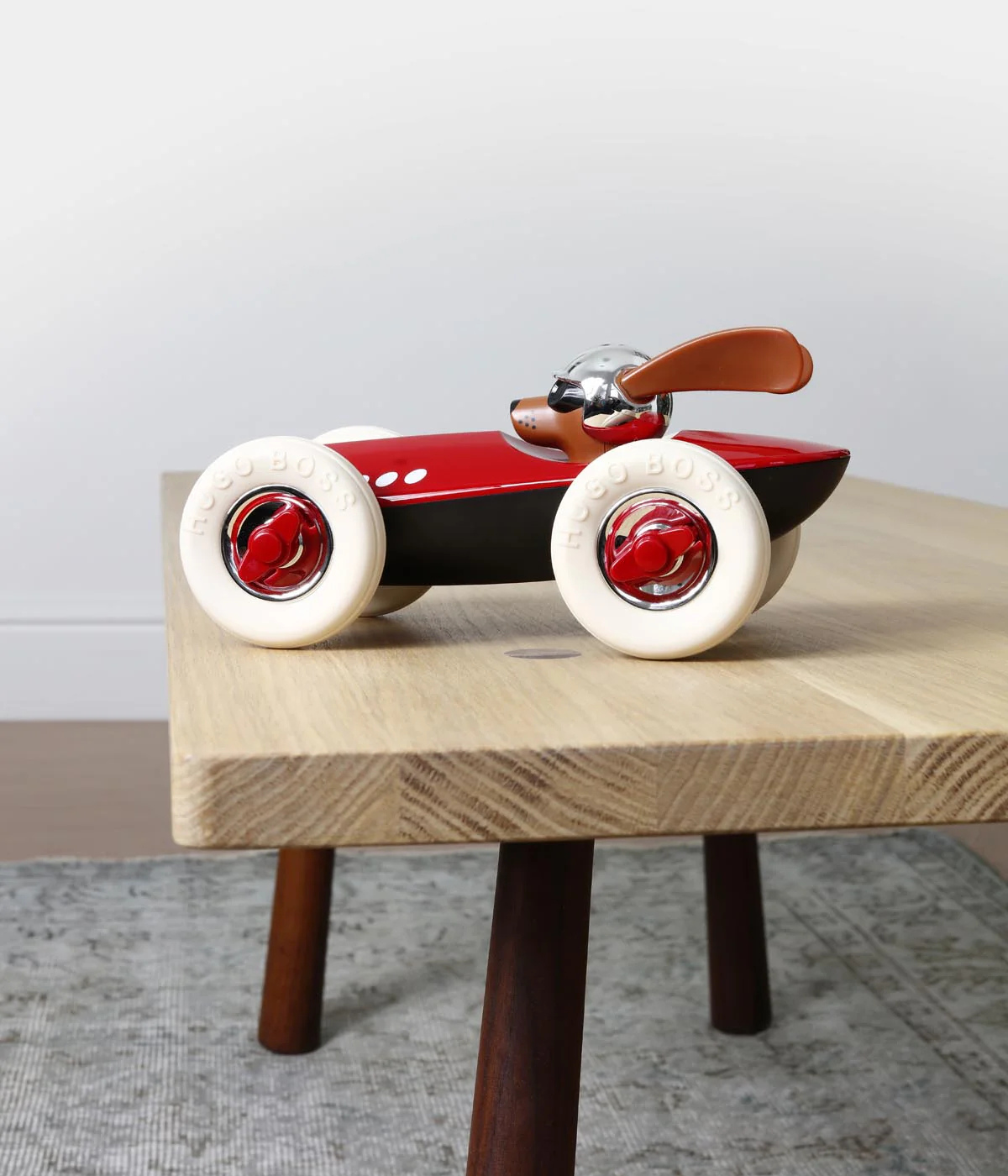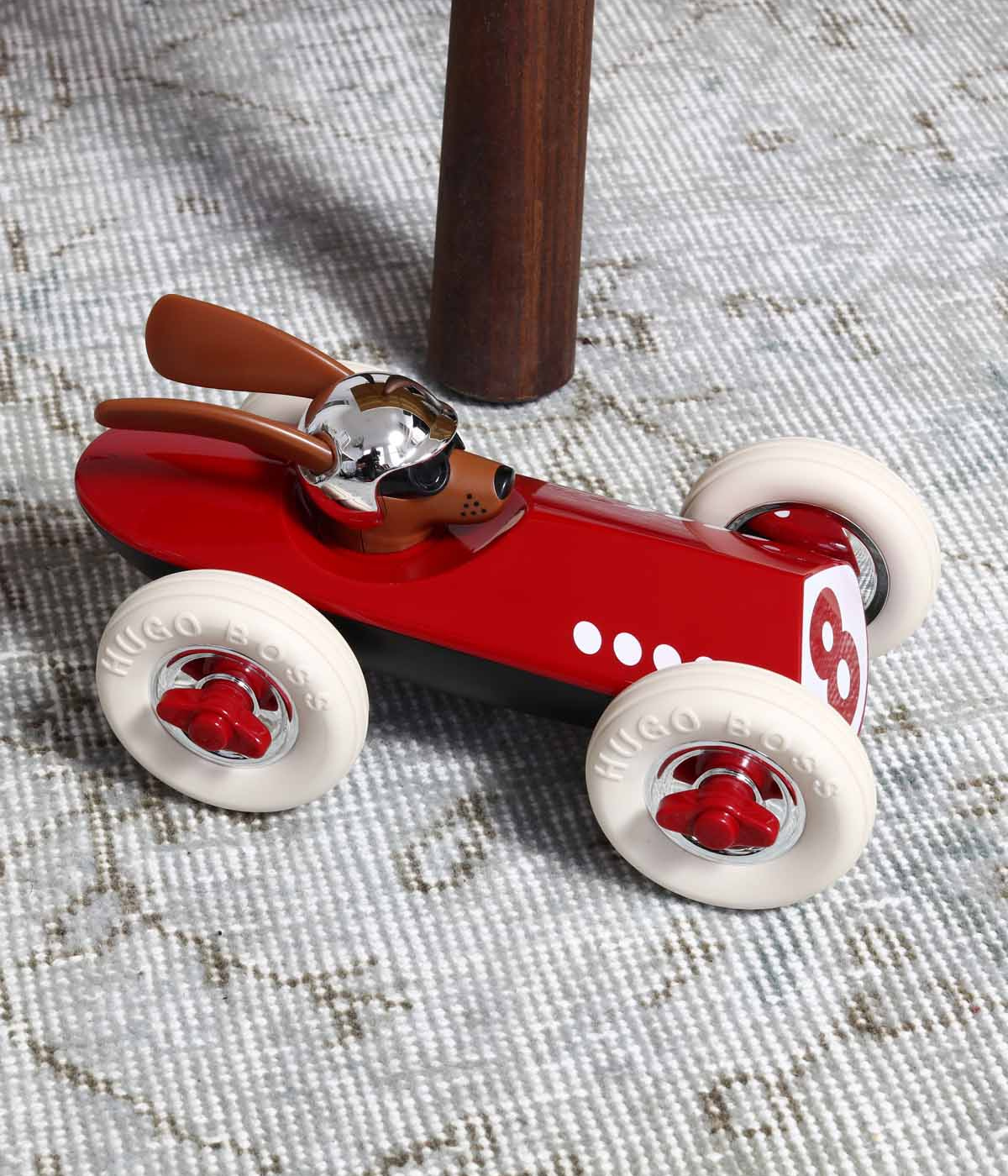 Playforever's collaboration with Hugo Boss resulted in the Rufus collection. The Rufus car, with its cool canine driver and dynamic dog ears, has a streamlined shape: a geometric front and pointed 'ridge' on the bonnet top, smoothing out to a rounded form at the back.