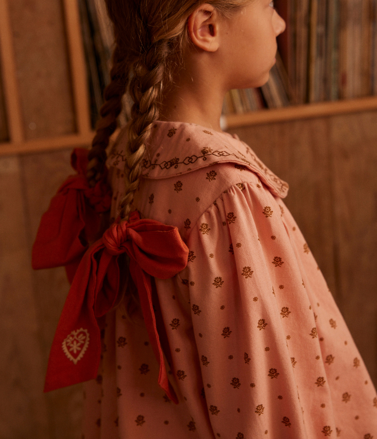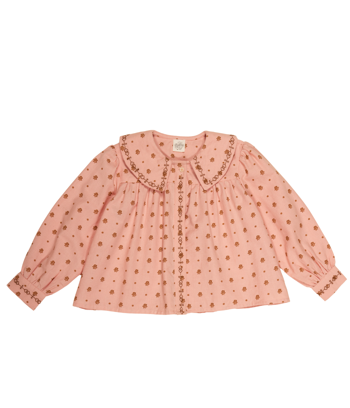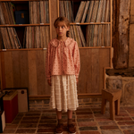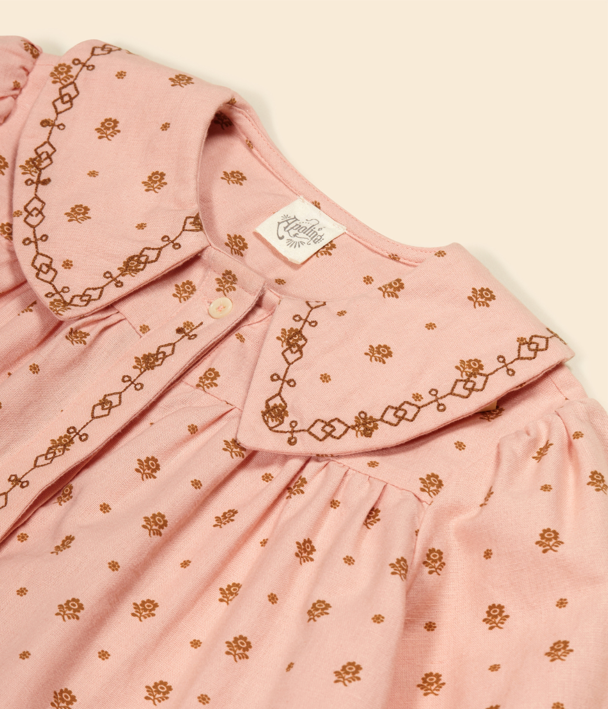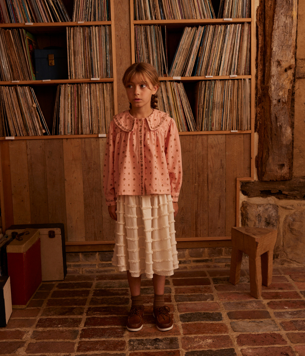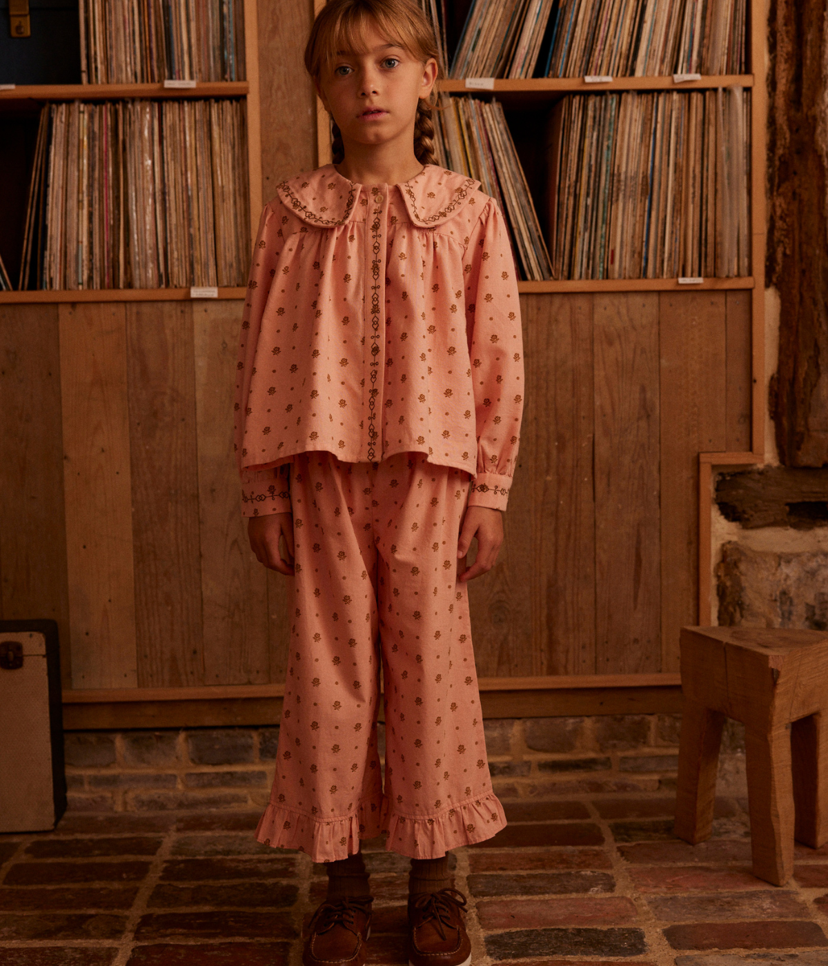 The Carlotta shirt, inspired by traditional English smocks, is crafted from ‘meadow calico’ cotton-linen. It features a dramatic collar with contrast linear embroidery at the collar, cuffs, and placket. With its swingy silhouette, Carlotta pairs sweetly with the Molly trousers or styles effortlessly with leggings. Add this charming blouse to your little one’s wardrobe for everyday vintage flair.