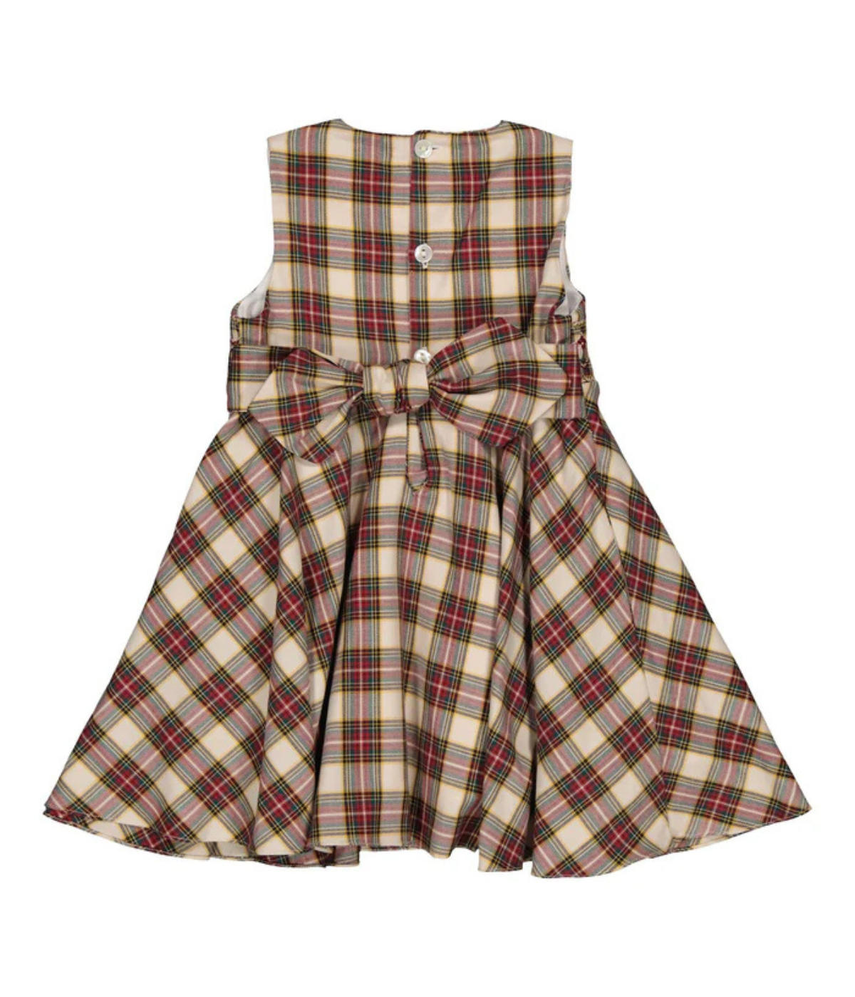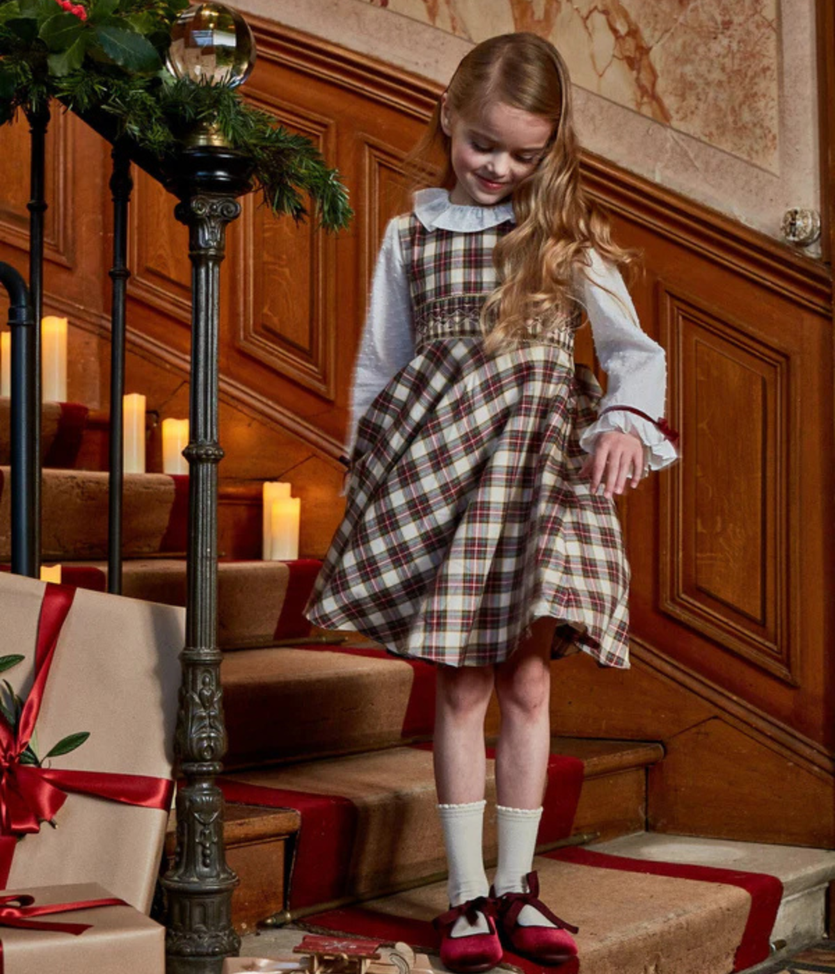 Discover the timeless elegance of Carmine, a beautifully smocked dress in red tartan.