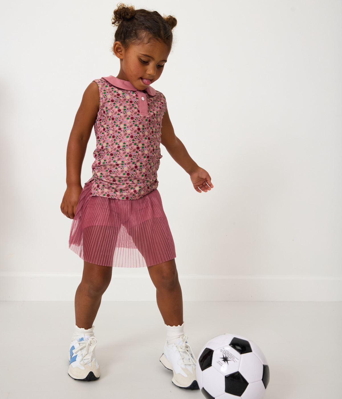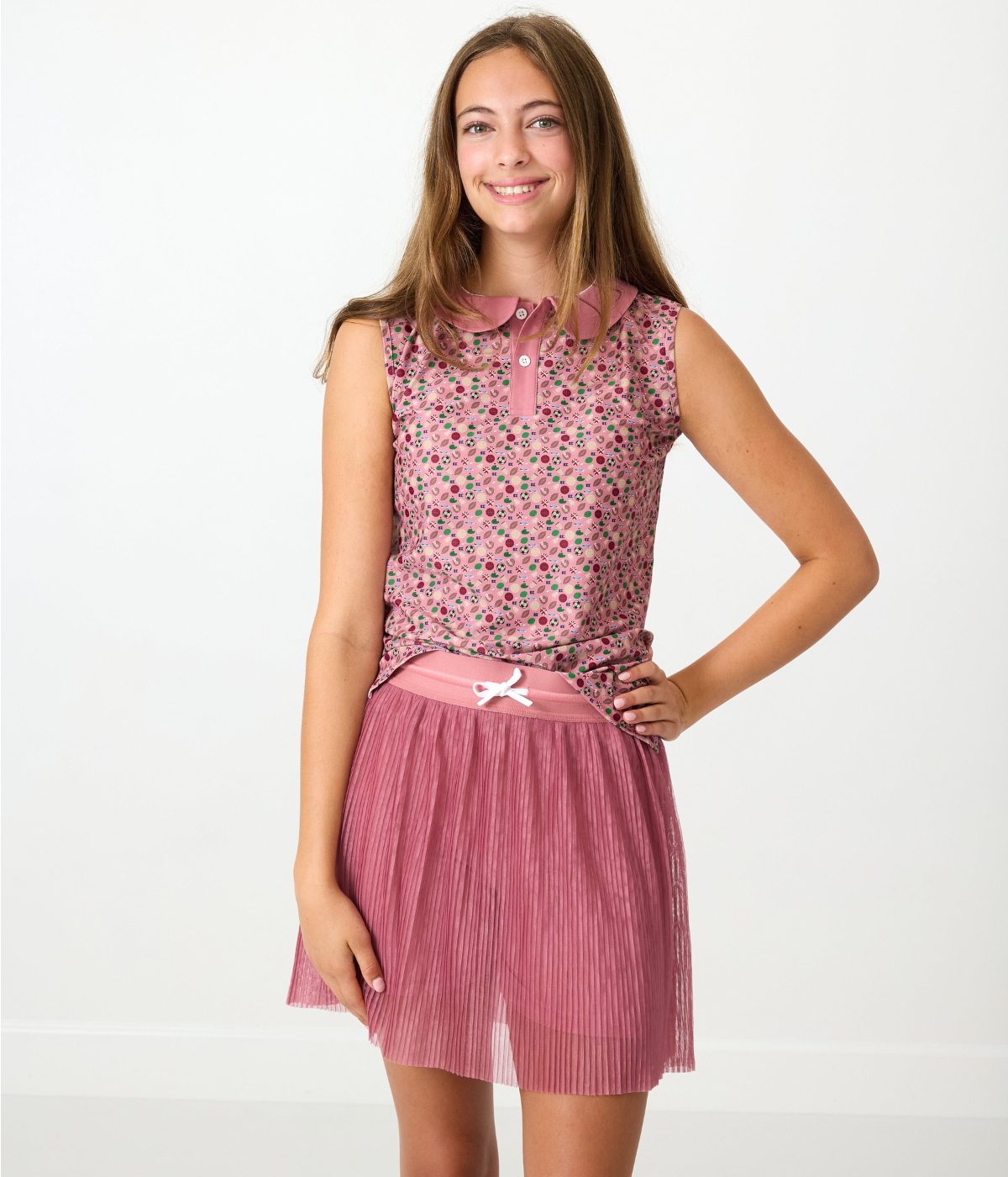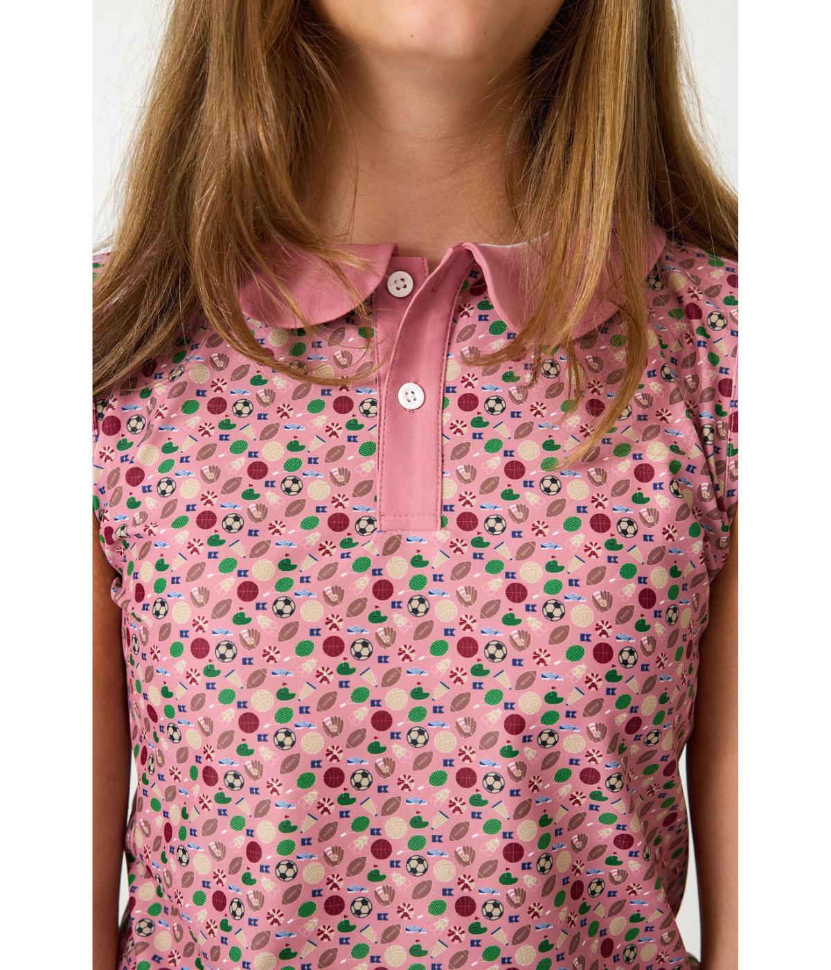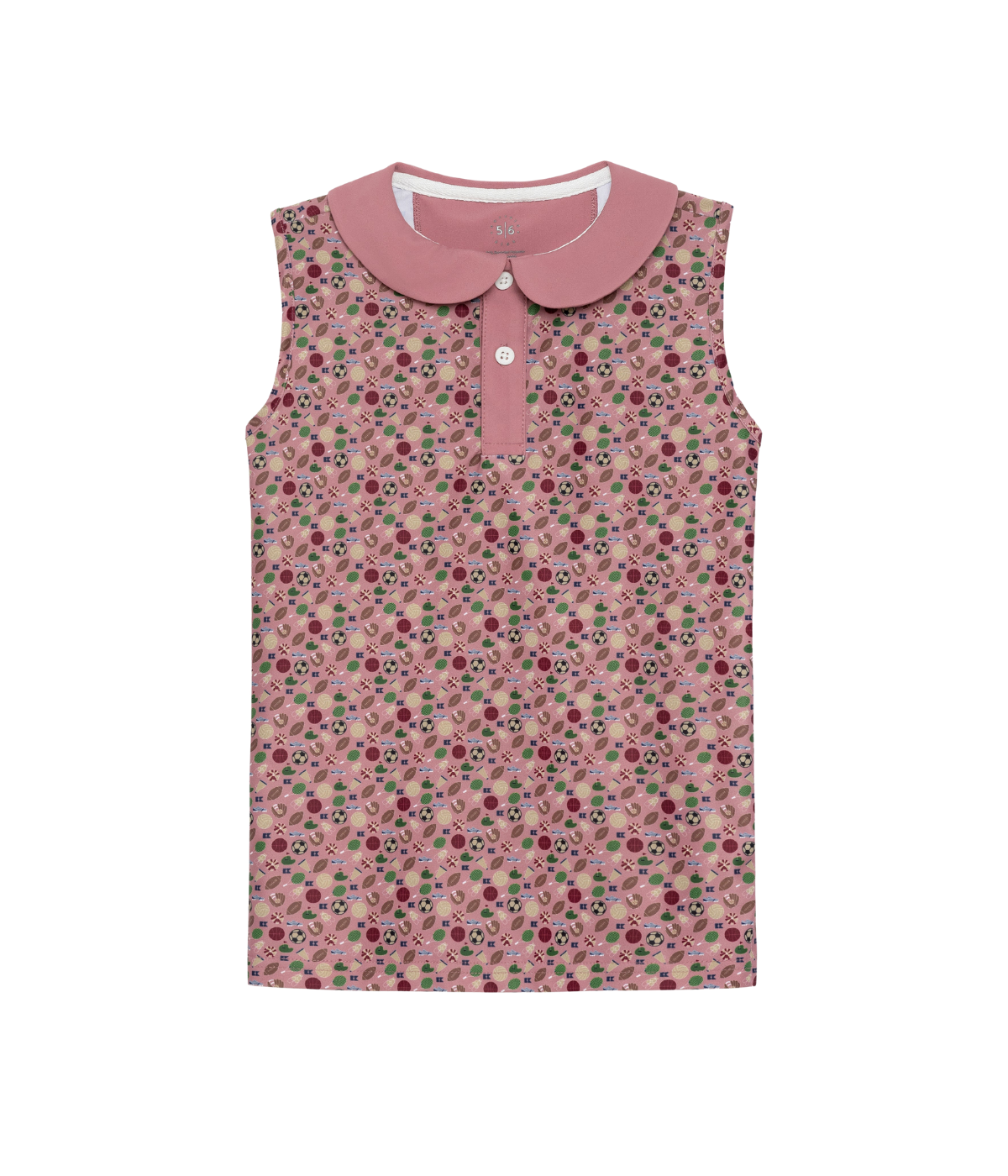 Sport meets sweet in our girls all star peter pan polo. featuring an allover retro sports print and a charming peter pan collar, this sleeveless top is perfect for game days and play days alike. made from lightweight, breathable performance fabric, it keeps her cool and comfortable while adding a playful pop to any outfit.