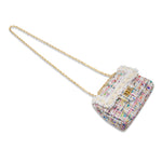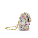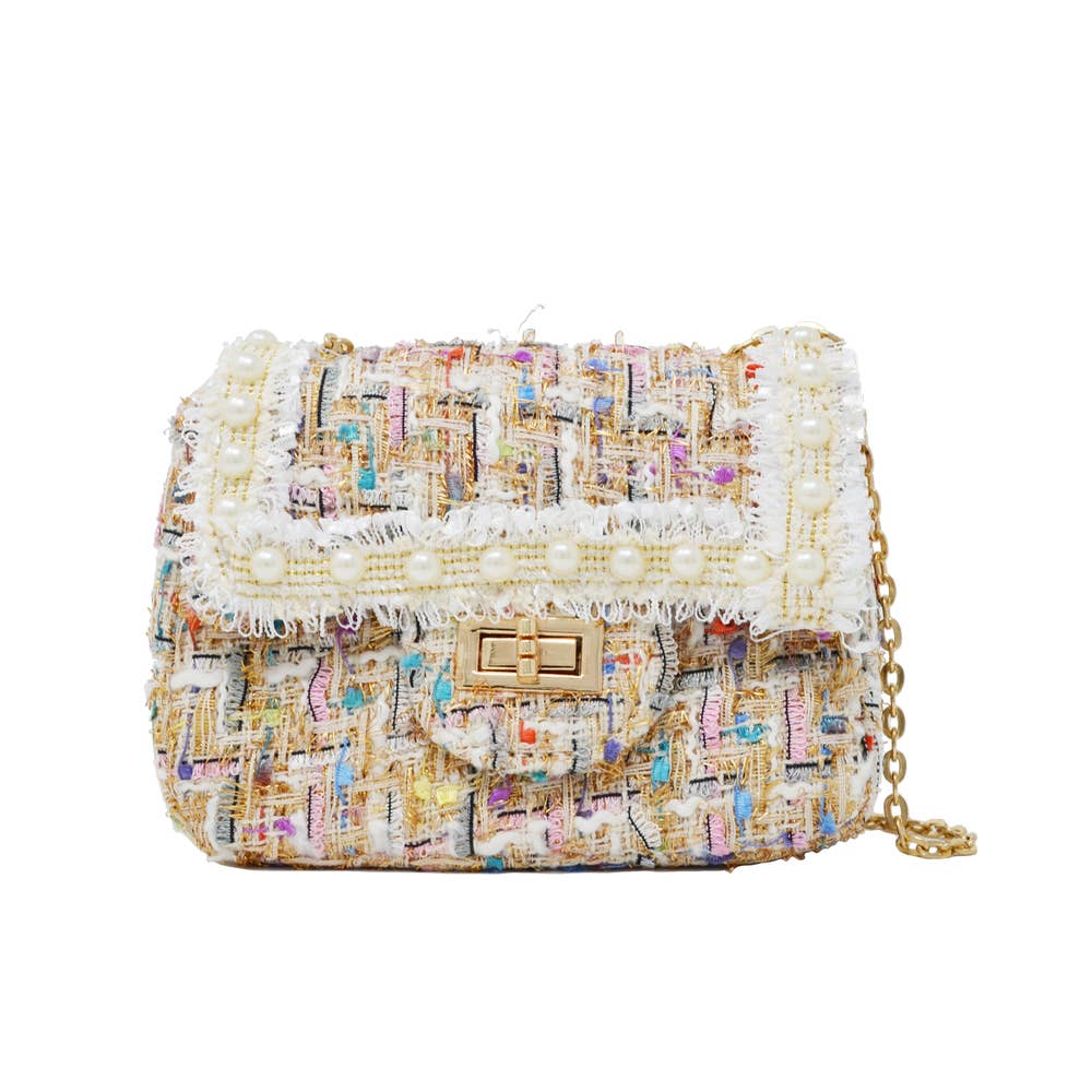 Shop our exquisite kids' handbag crafted from classic tweed fabric with chic pearl details and a convenient twist lock closure. Perfect for your little fashionista's special occasions or daily outings, this elegant handbag is designed to keep their treasures safe and secure. Its compact size is just right for small hands, making it the ideal accessory for any young fashion lover. Don't miss out on this stylish and timeless addition to your child's wardrobe!