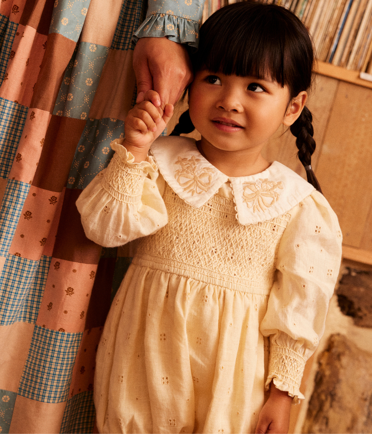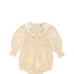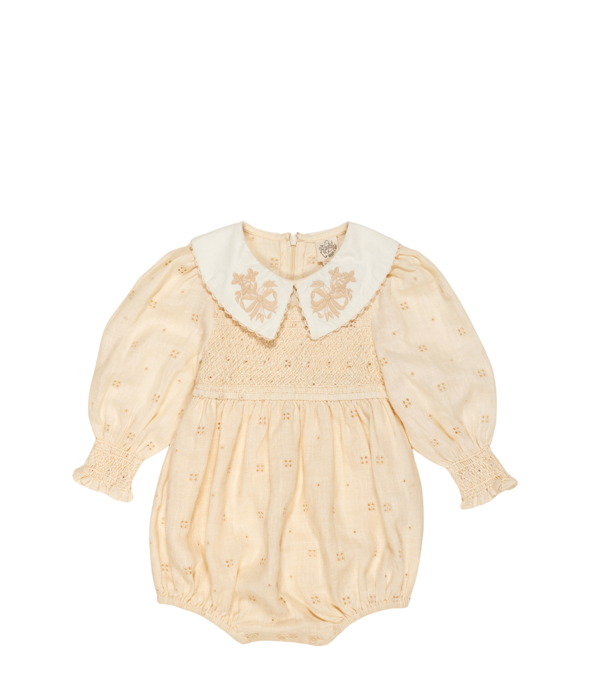The Cornelia romper, in broderie anglaise linen, features hand smocking, a contrast embroidered collar, and crochet trim. Perfect for festive occasions—pair with Apolina bonnets for a timeless look.