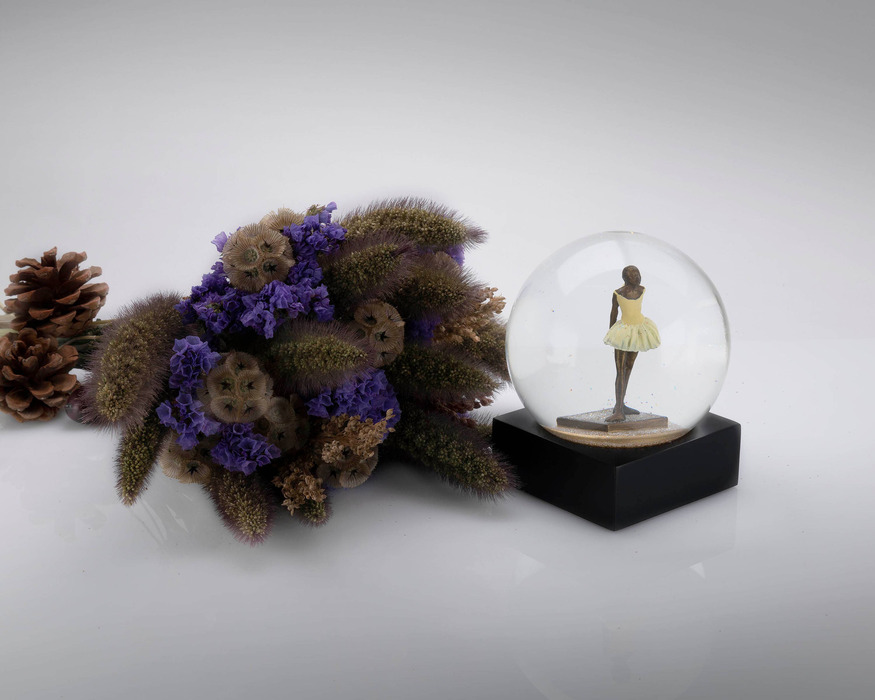 Young Marie van Goethem stood precisely so, with her chin jutting out slightly, her back hunched almost imperceptibly. Degas has portrayed her lithe beauty precisely, while she appears to be innocent of it all. You will see her looking up at you, with a determined smile and an impish sparkle in her eye. She seems poised to twirl off into a mischievous dance. Glass globe on our Iconic Square Black Base