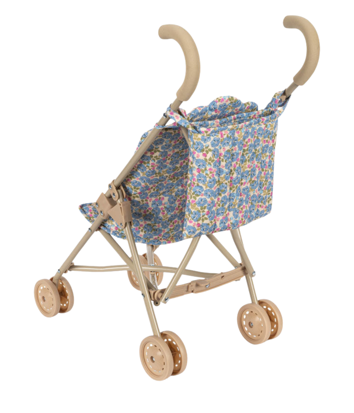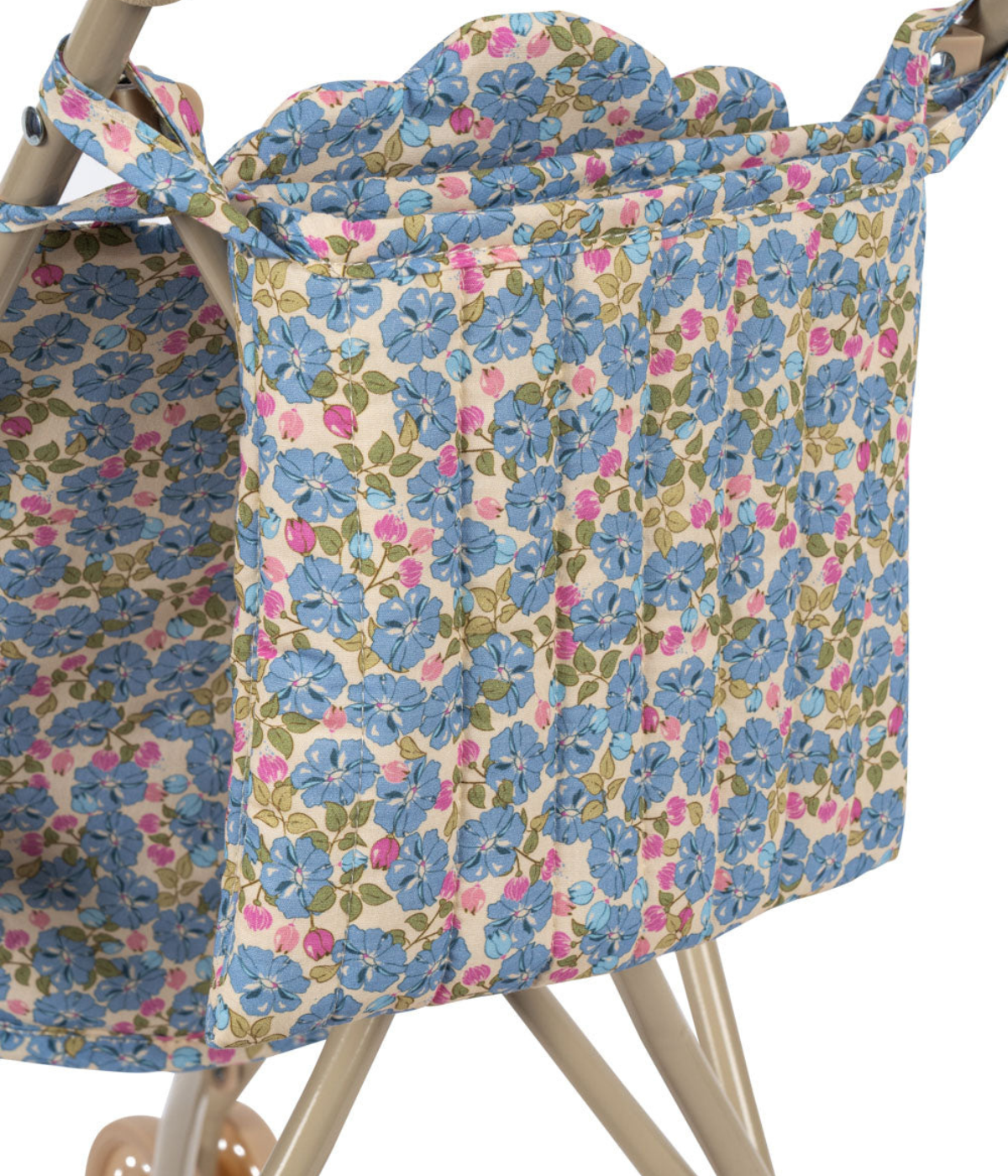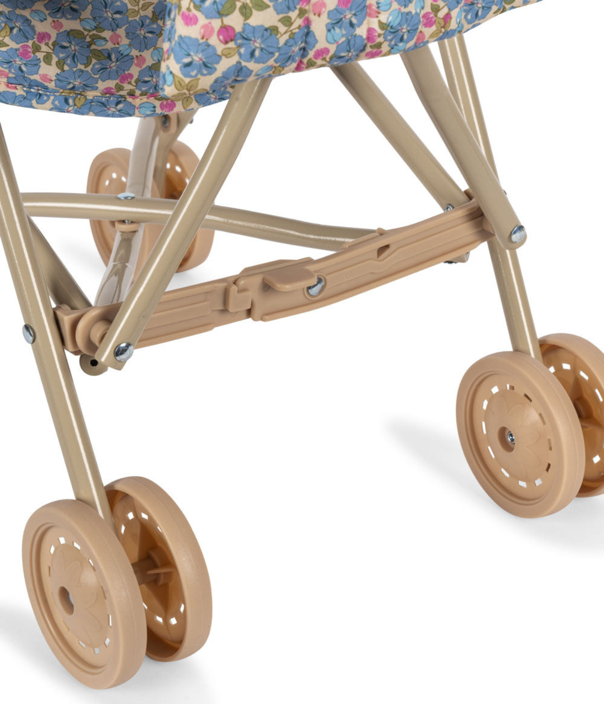 Doll stroller designed with a harness, carriage bag, and double wheels on all four legs for extra stability. Features removable fabric. Comes fully assembled and is easy to fold and store.