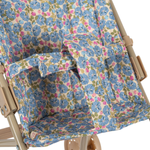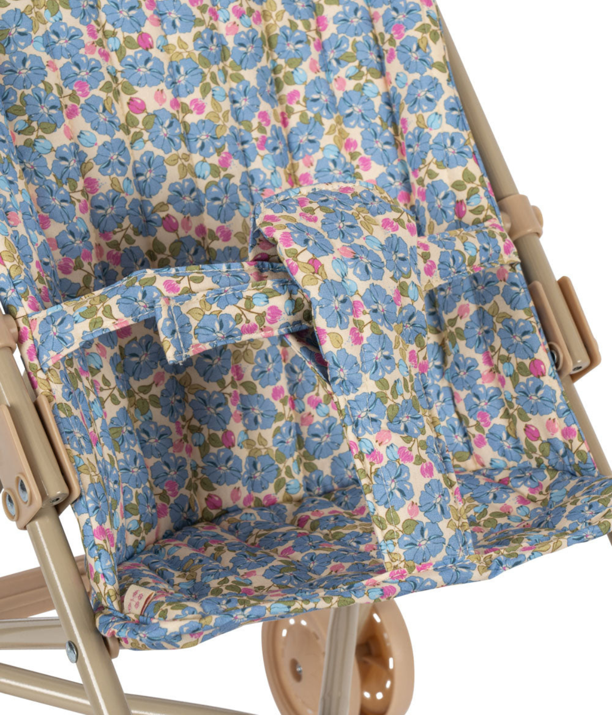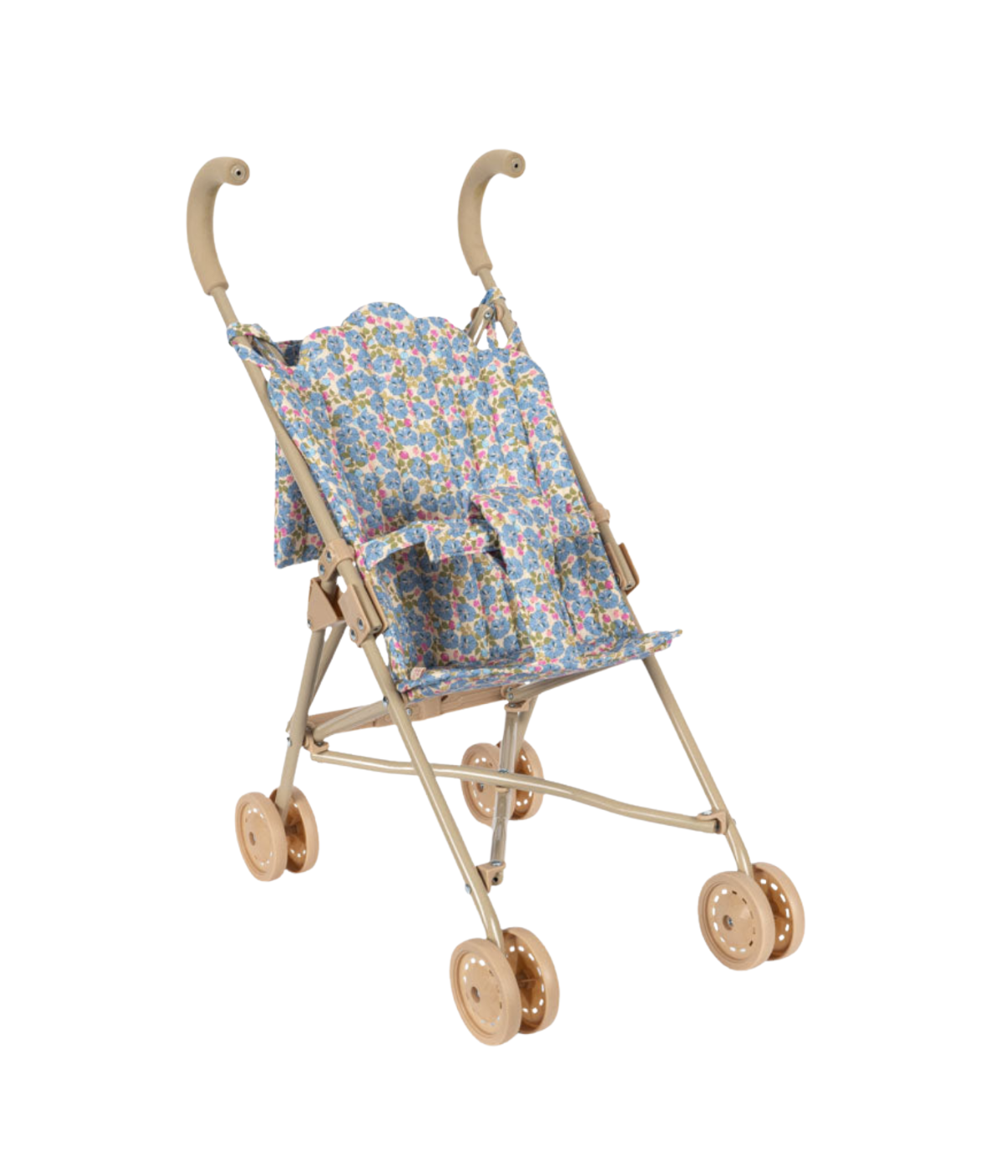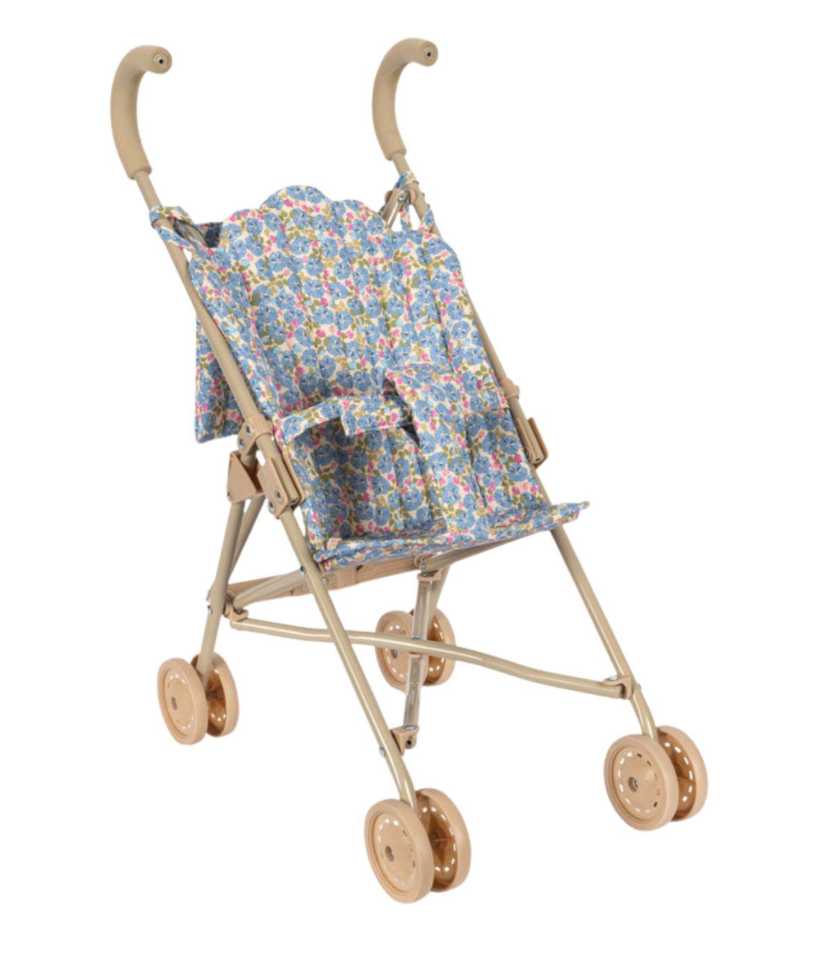 Doll stroller designed with a harness, carriage bag, and double wheels on all four legs for extra stability. Features removable fabric. Comes fully assembled and is easy to fold and store.