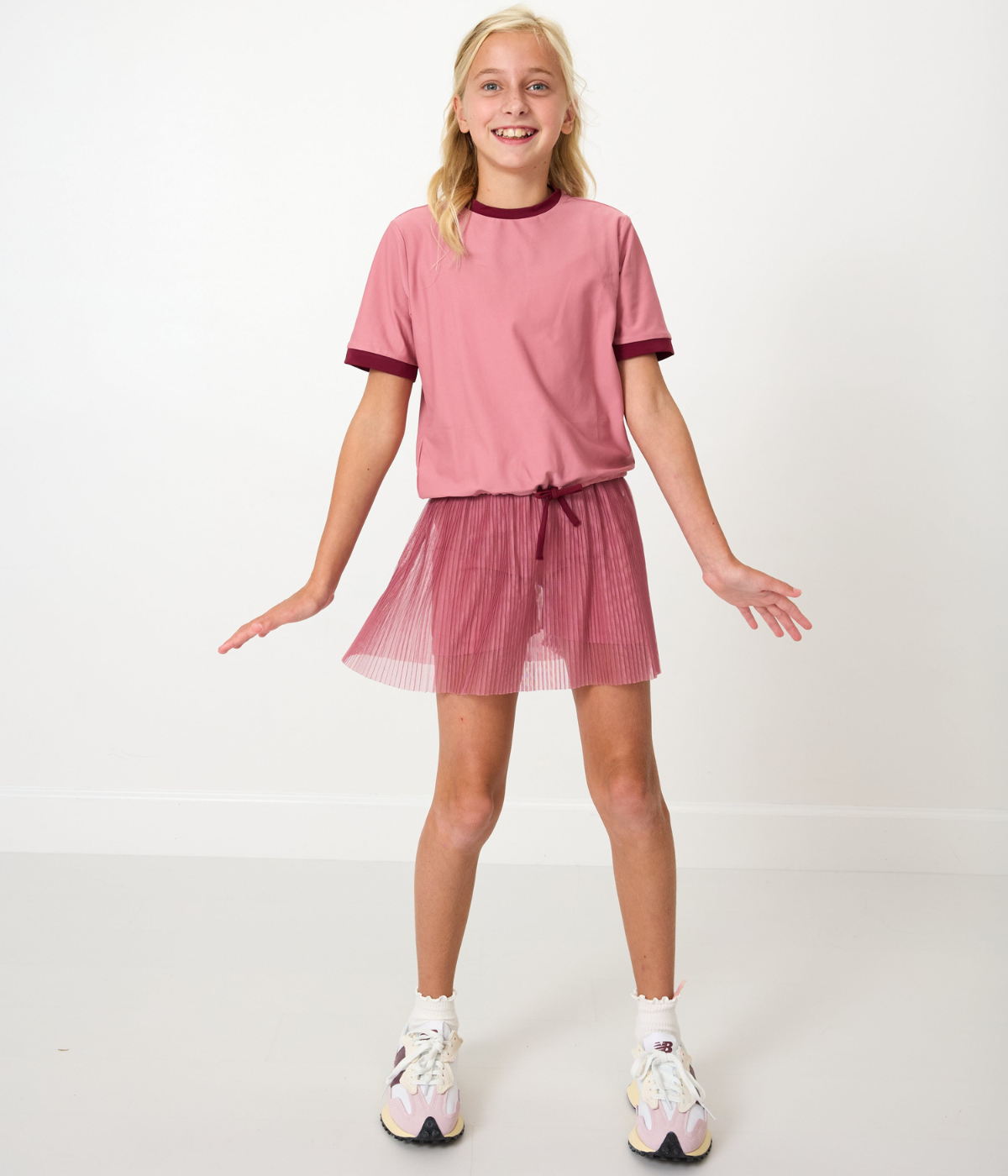 A girls tennis skirt that is made for fashion and twirling! inspired by a famous pop icons viral skirt, the waistband is a thick elastic, allowing it to stretch and move while looking snug and tailored. made with our anti-odor shorts underneath complete with a pocket for a tennis ball and/or phone.