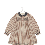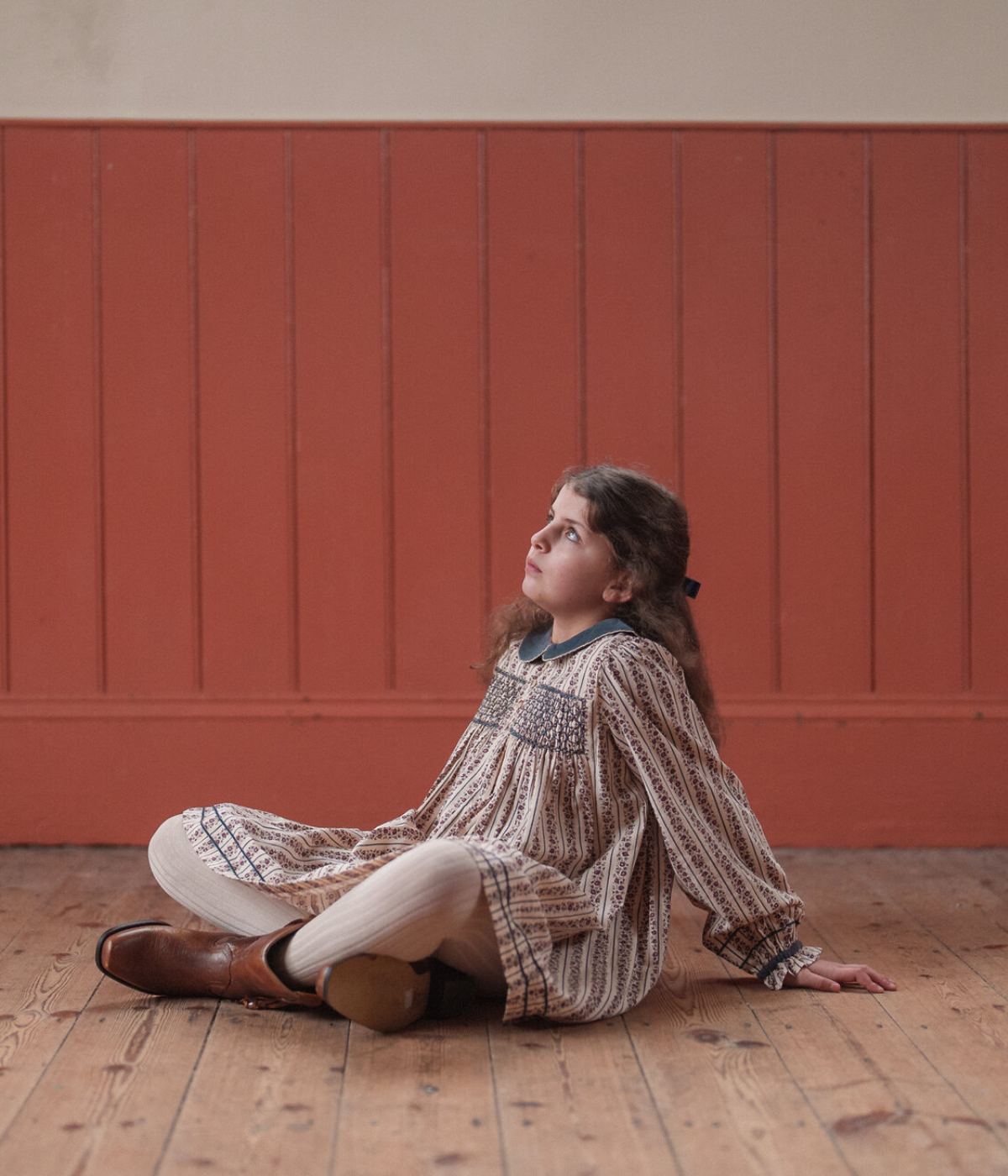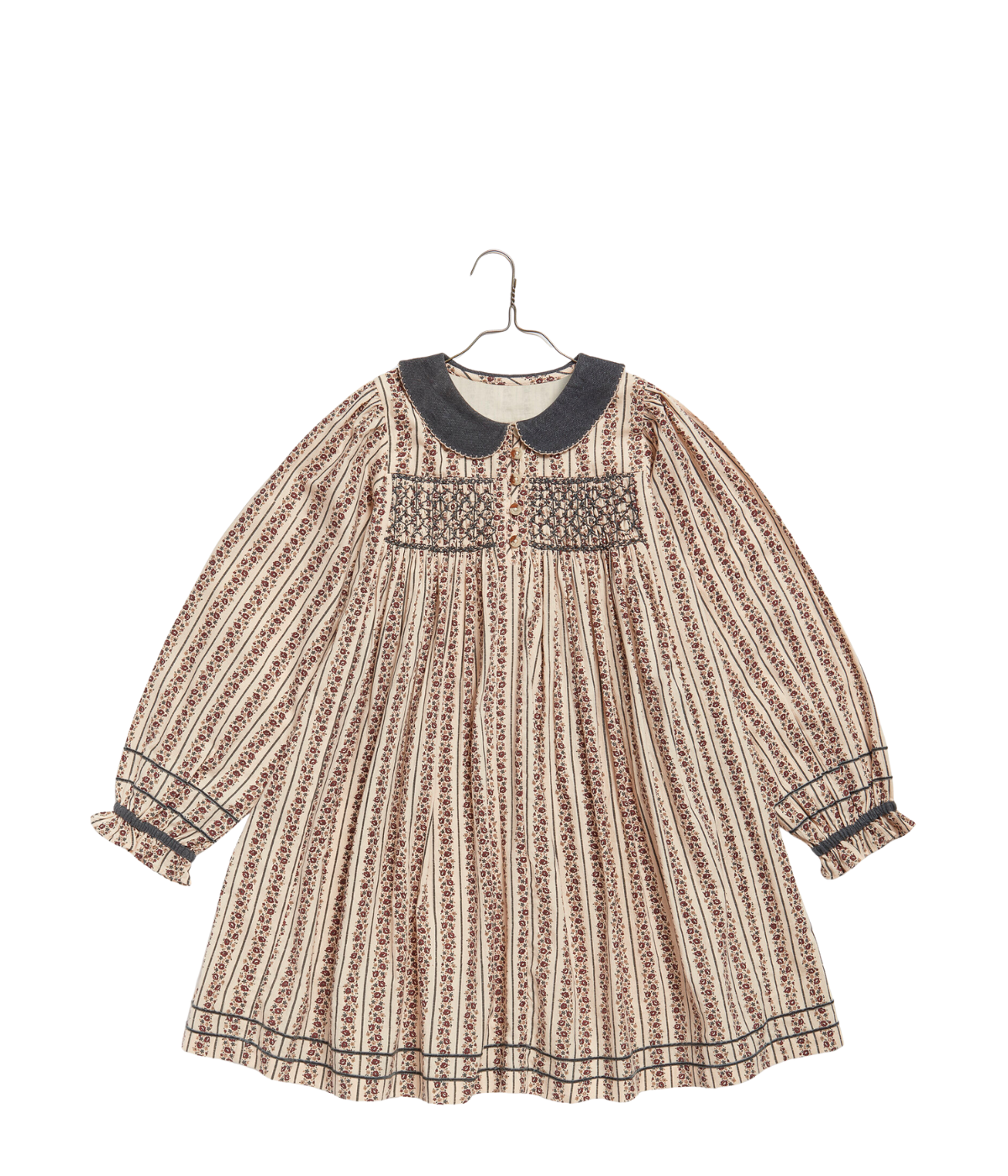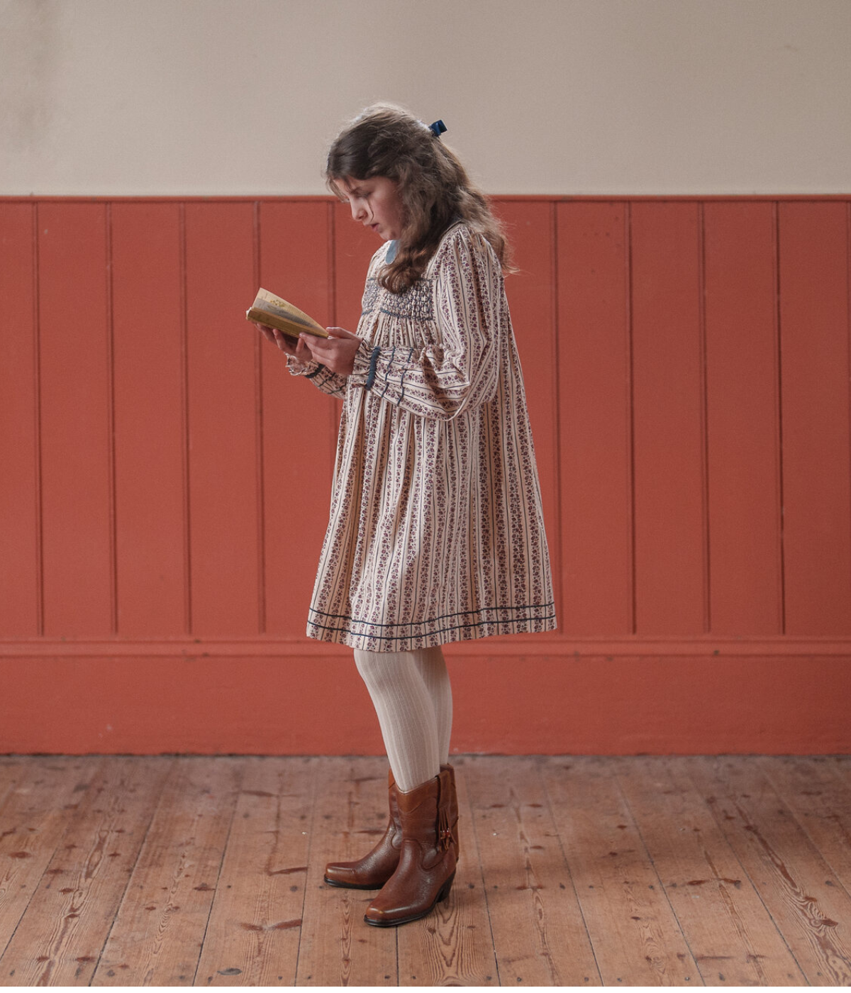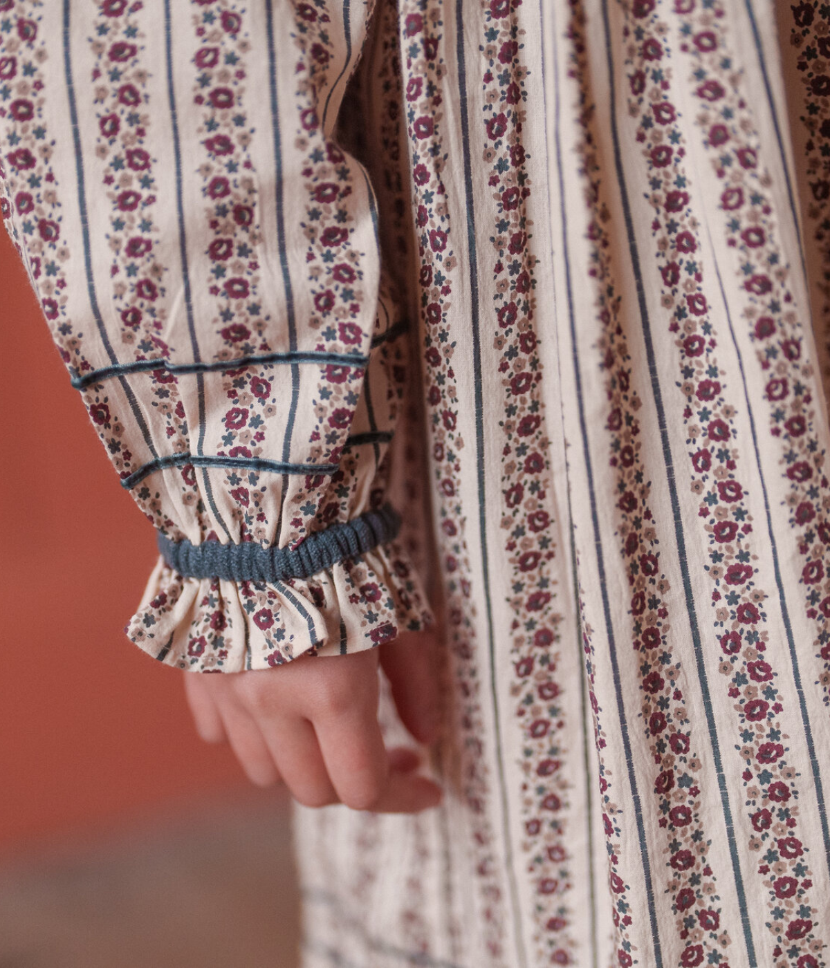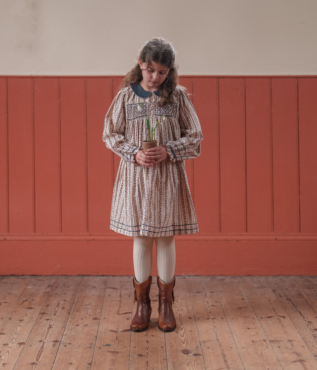 This beautiful vintage-inspired dress, is made in our organic, mallory floral print fabric. It has long, full sleeves finished with ruffle cuffs, a cotton velvet peter-pan collar with cotton trim stitching, and two rows of velvet ribbon to the sleeves and hem. The front button placket has a single row of buttons and loops, either side of which are beautiful, hand-smocked panels.