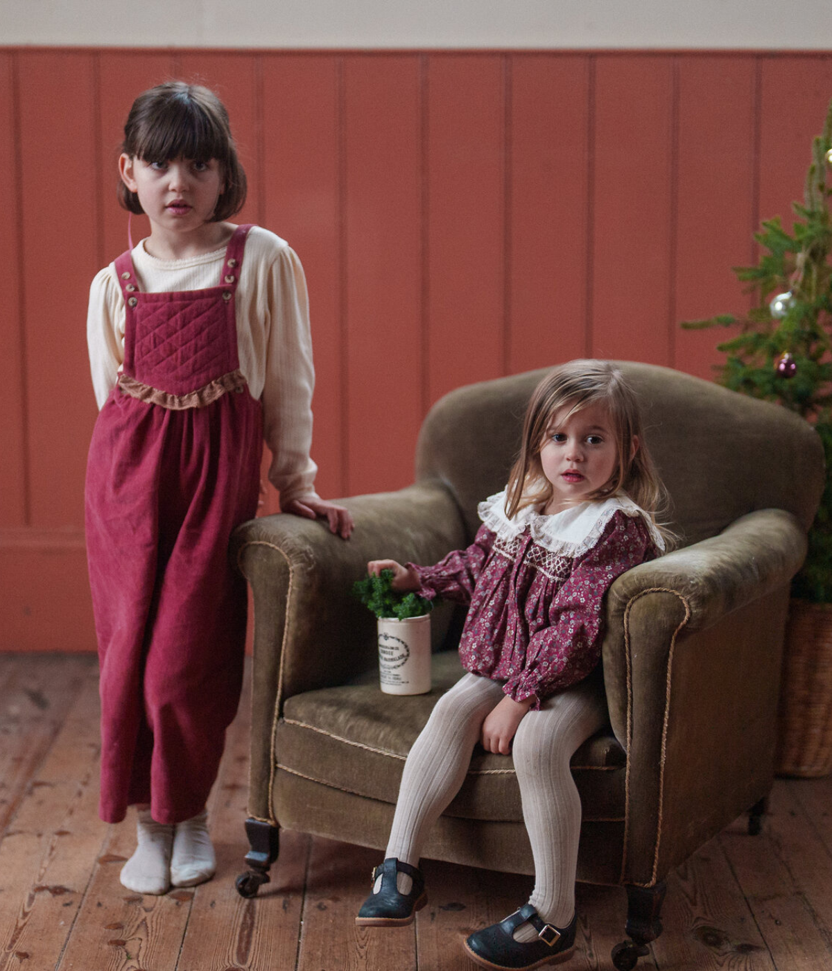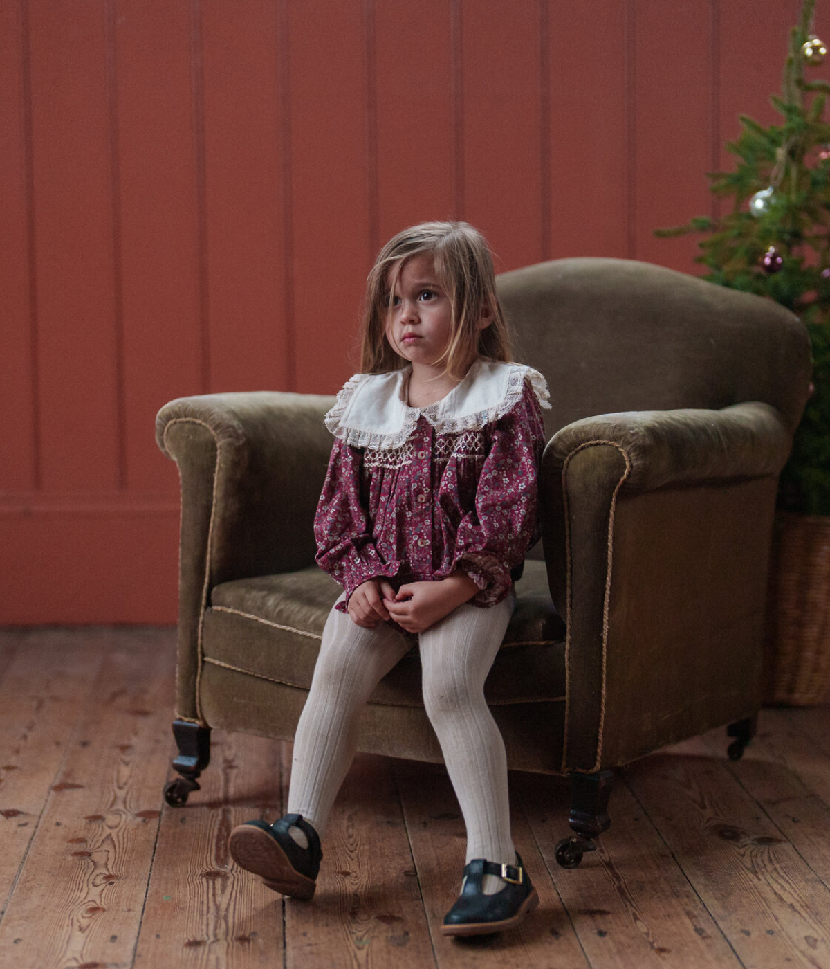 A lovely, vintage inspired romper made in our organic, clove floral fabric. This pretty, vintage inspired romper has a cotton sailor collar finished with gathered lace trim. To the chest there are hand-smocked panel and the full sleeves, are finished with frilly cuffs. We've added a press-stud opening for easy changes and buttons at the back.