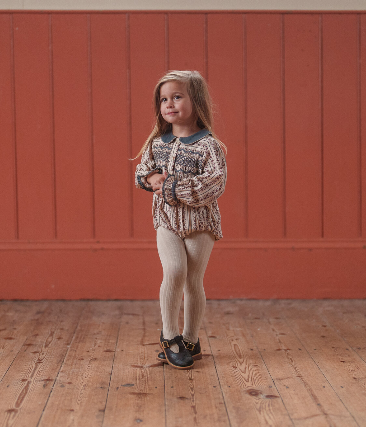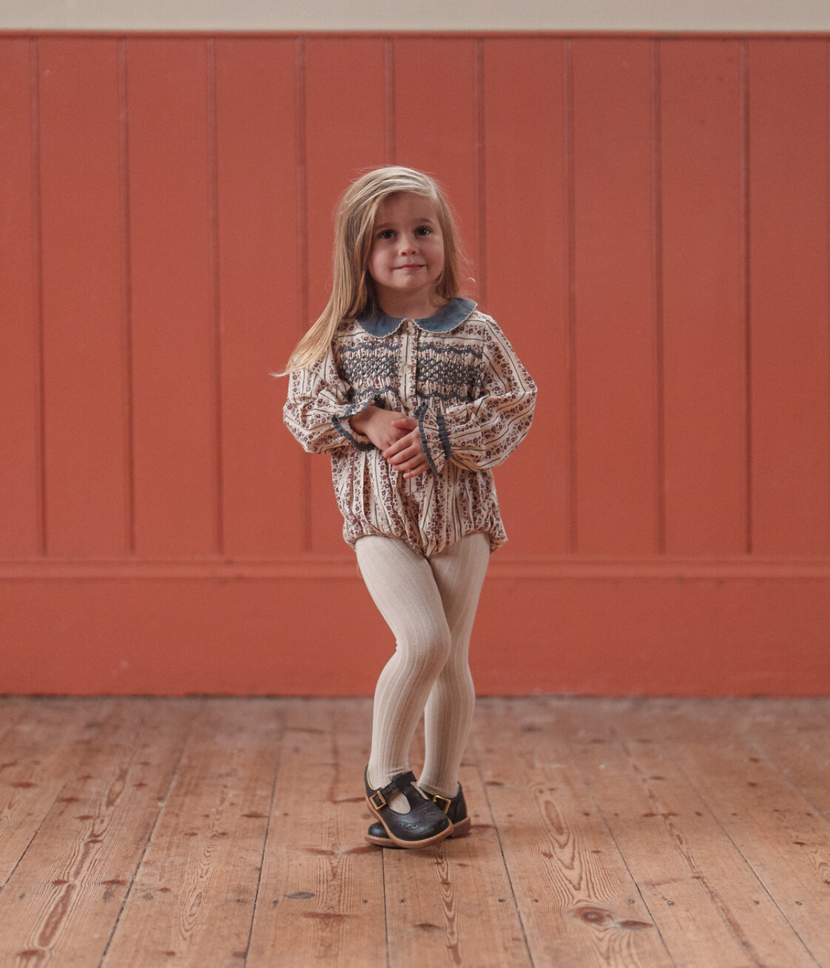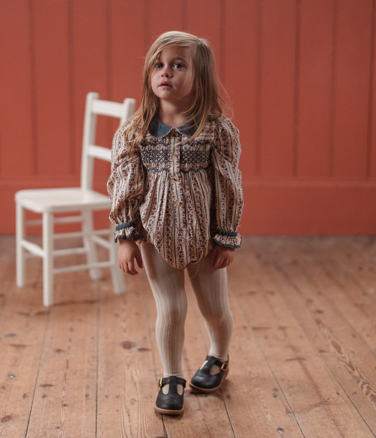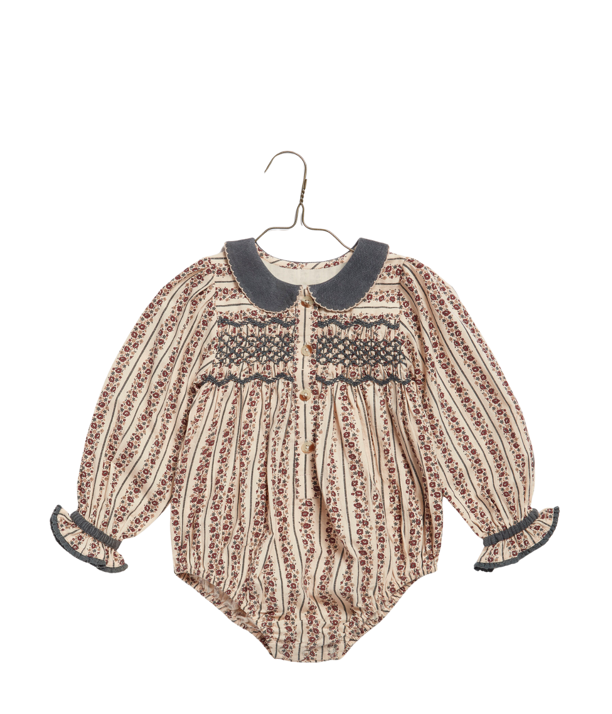A lovely, classic romper made in our organic, mallory floral print fabric. This pretty, vintage inspired romper has a velvet peter-pan collar with contrasting embroidery edging stitch. To the chest there are hand-smocked panels either side of the button placket. The romper has full sleeves with elasticated ruffle cuffs finished with contrasting trim. We've added a press-stud opening for easy changes and buttons at the back.