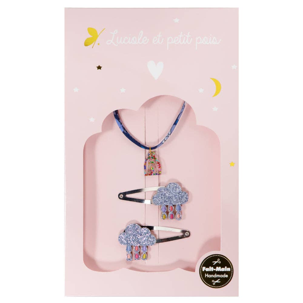 Offer a sweet touch in pink with this delicate gift set, including a sparkling Liberty Betsy Meadow Blue bracelet (multicolored rainbow bead) and cloud hair clips!