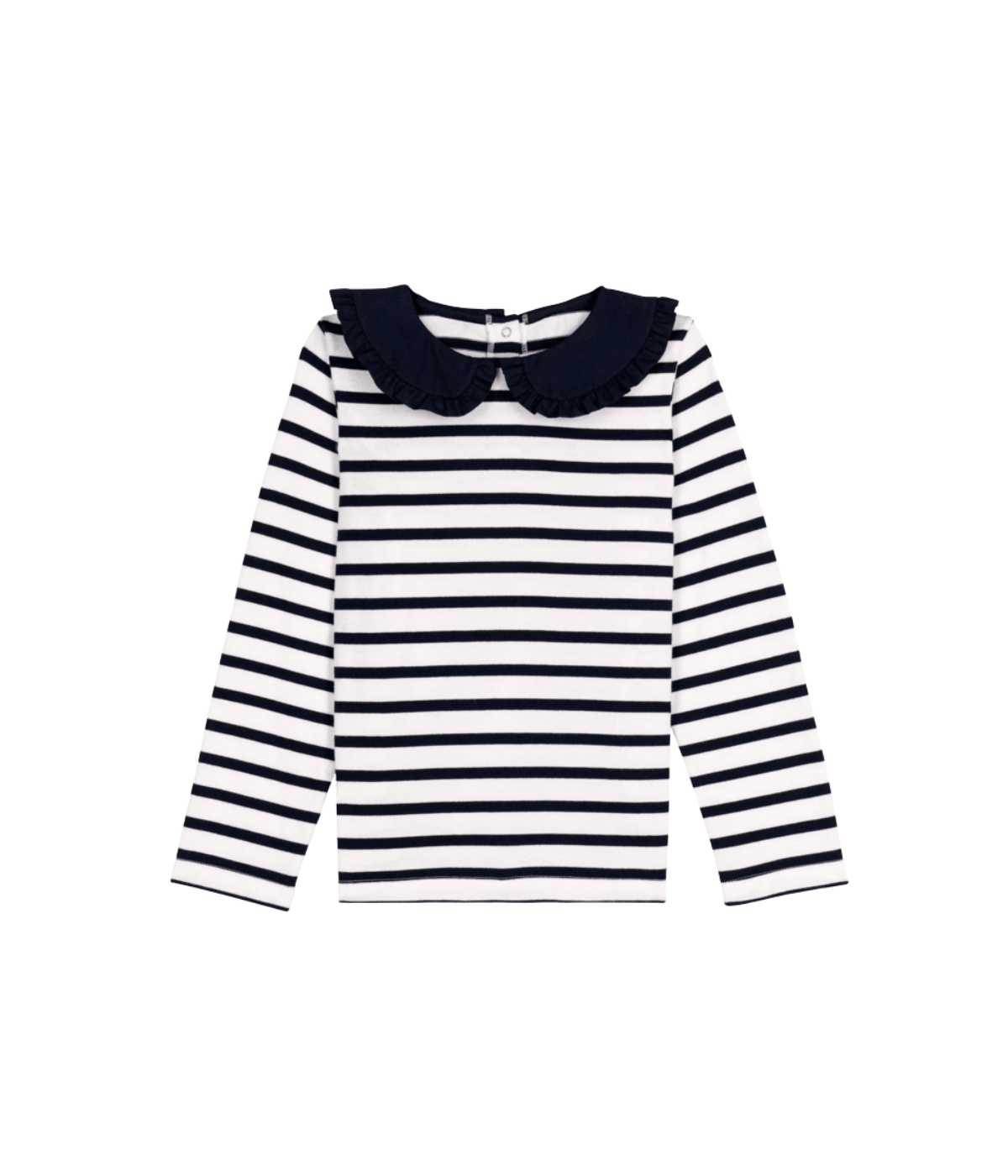 This playful long-sleeve stripe top in white and navy features a charming collar that adds a touch of classic style to any little girl’s wardrobe. Soft and comfortable, it’s perfect for everyday adventures or special occasions, combining cozy warmth with a fun, timeless look.