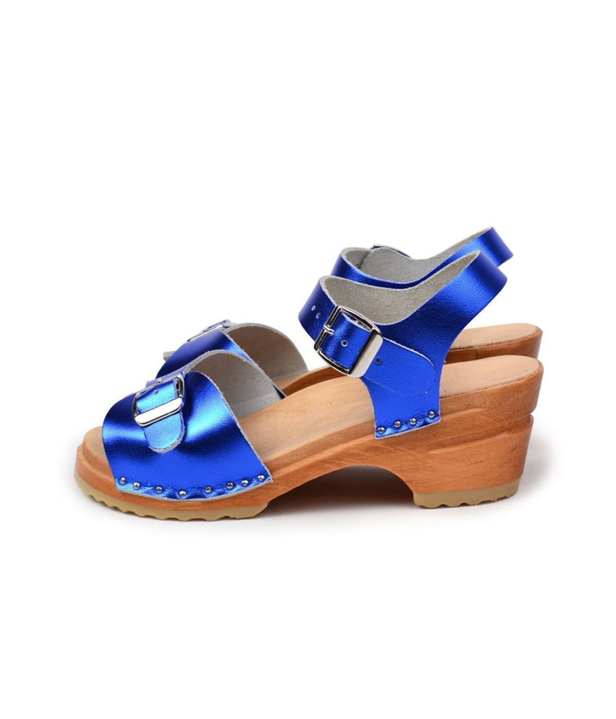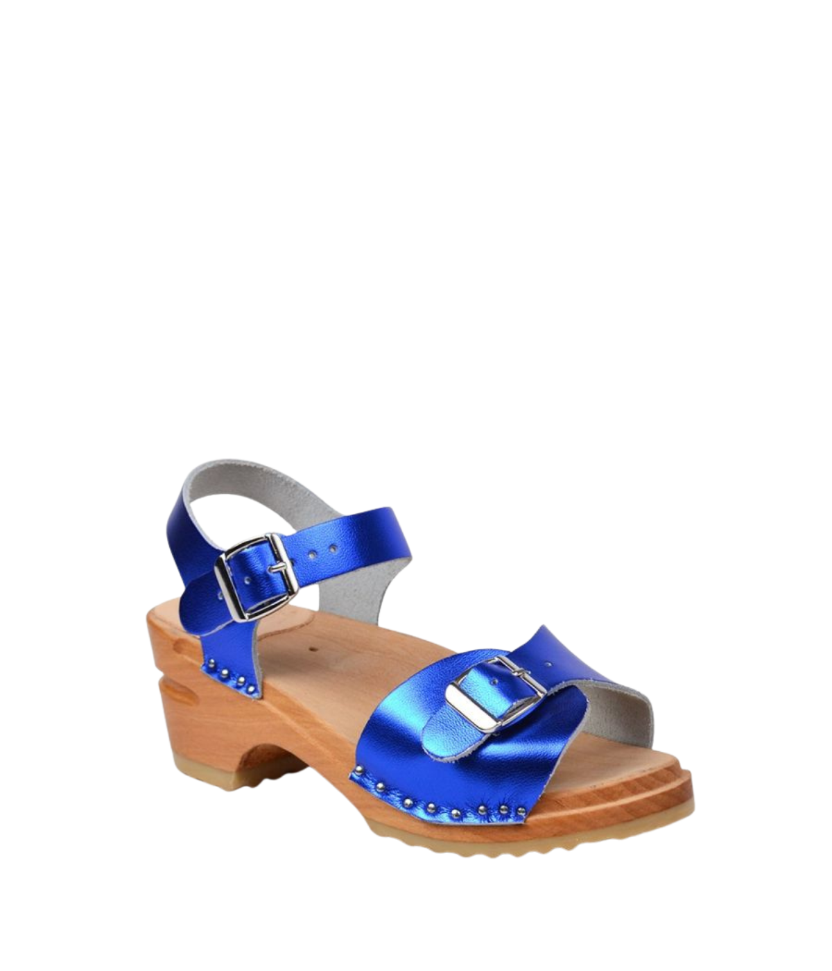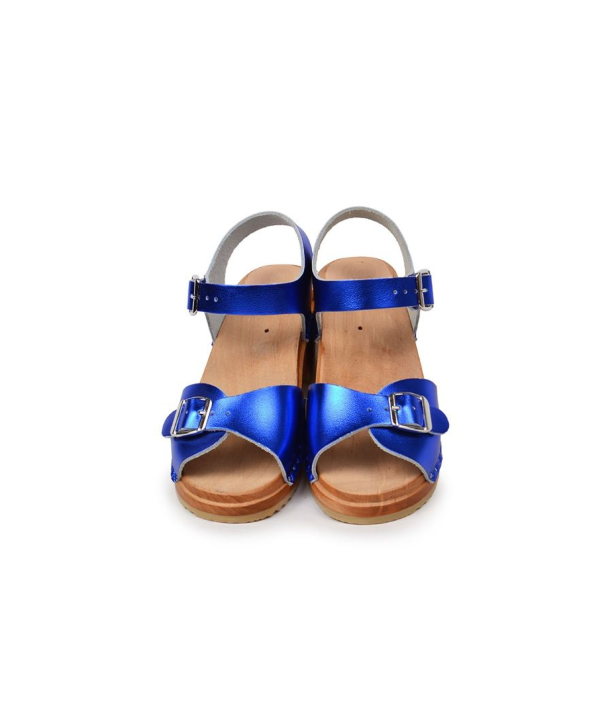 Kids clog sandal in blue metallic leather with an adjustable ankle strap and open toe, made on our varnished wooden bottoms.
