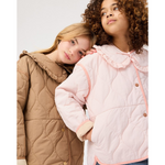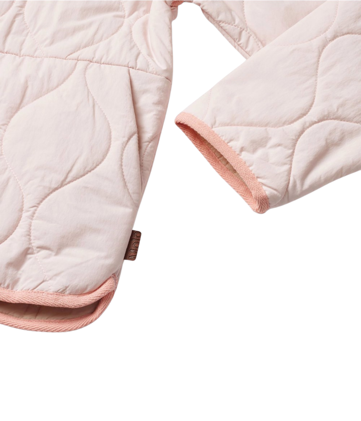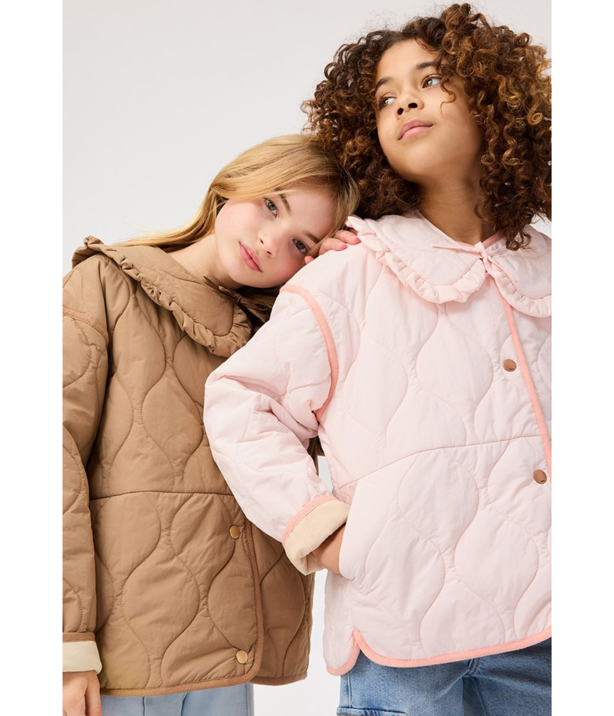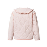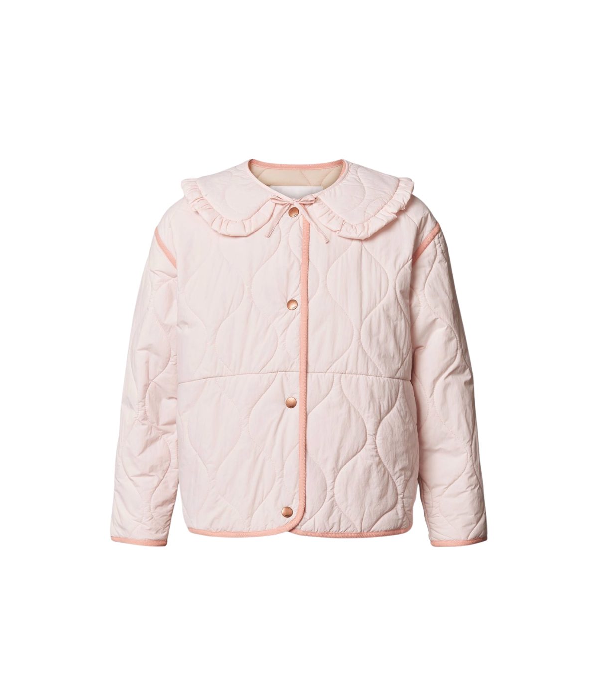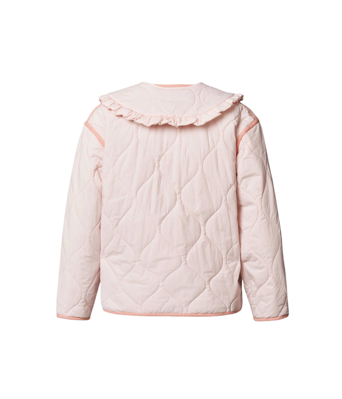 Pink water-resistant thermal jacket in recycled nylon with quilted pattern and detachable ruffle collar. The jacket has a regular fit, side pockets, button closure on the front, and matching edge tape for a stylish finish. This lightweight yet warm jacket offers quilted insulation that keeps you comfortable in chillier weather, while its flattering fit adds a touch of elegance to any outfit.
