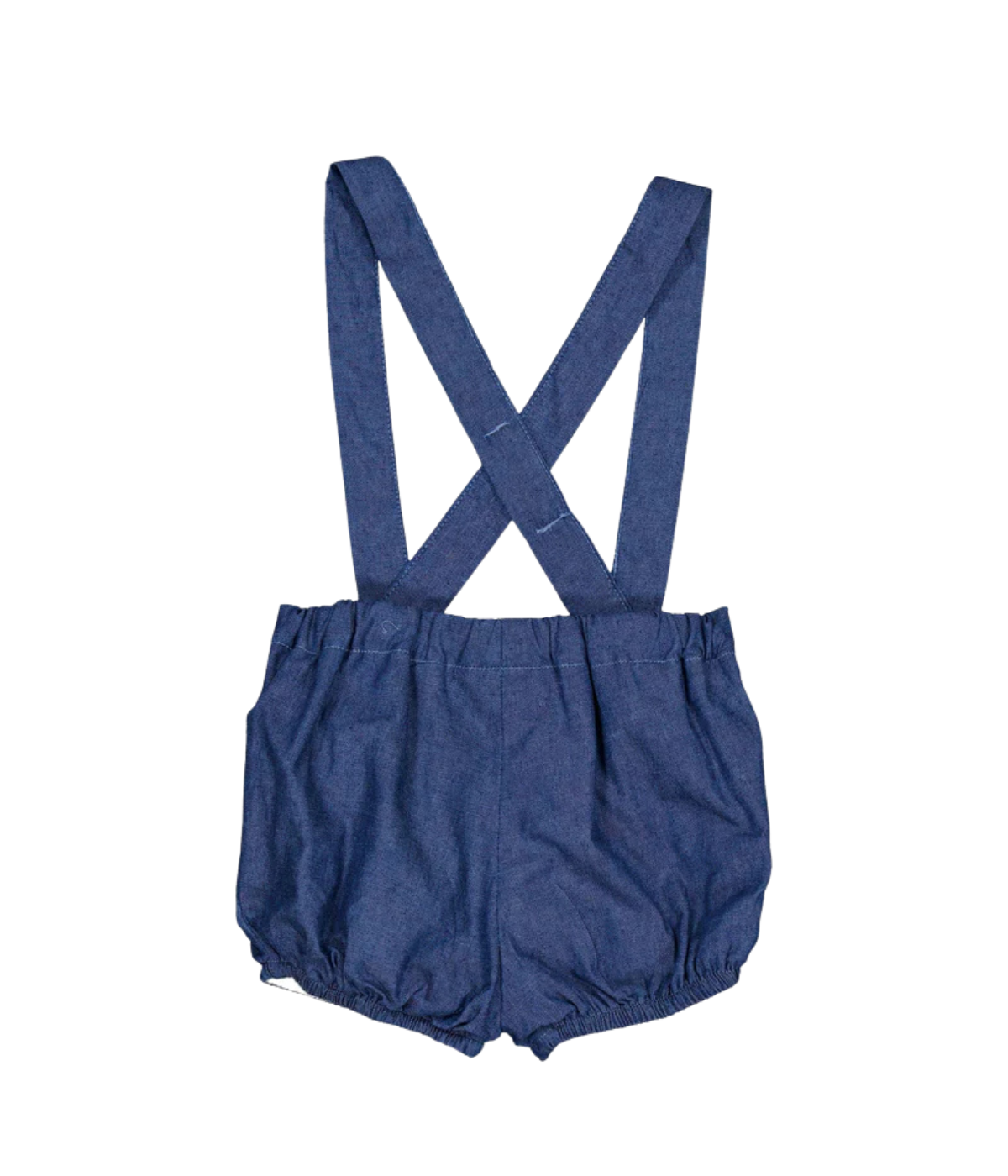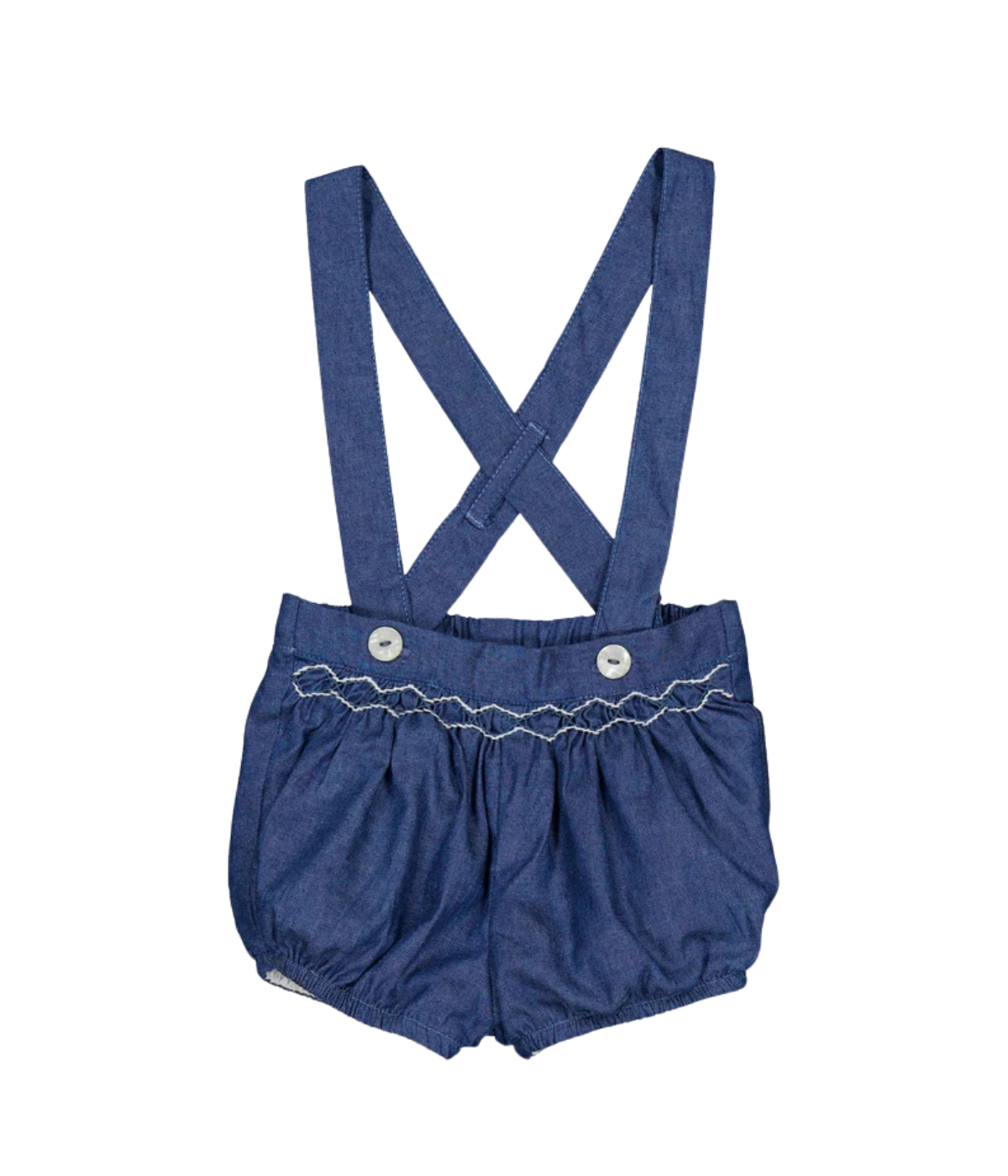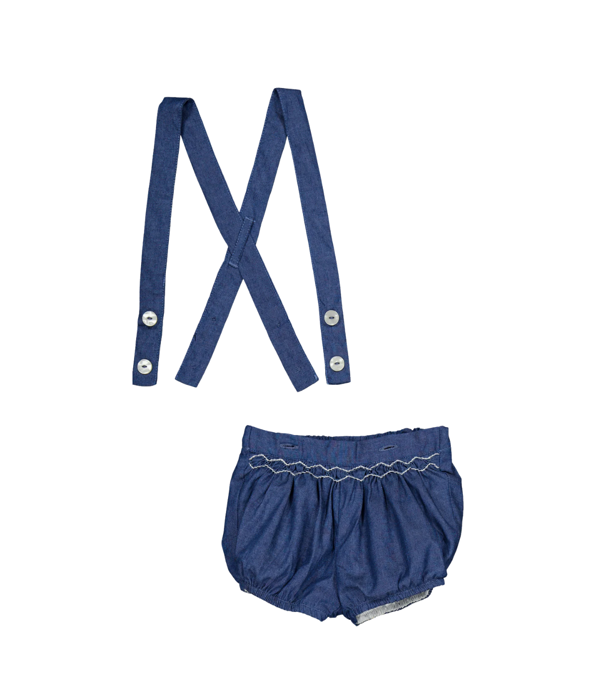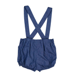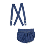 Baby bloomers, smocked waist and removable straps, in blue denim light herringbone