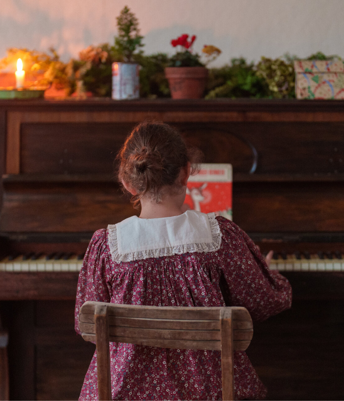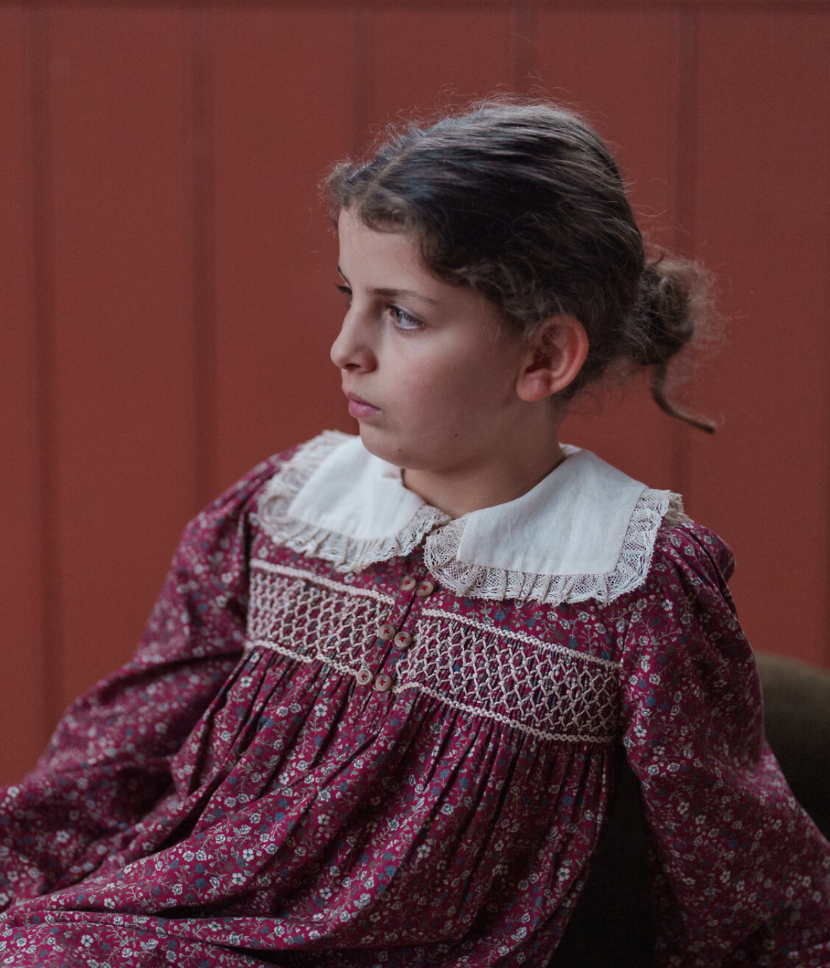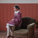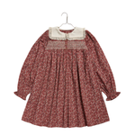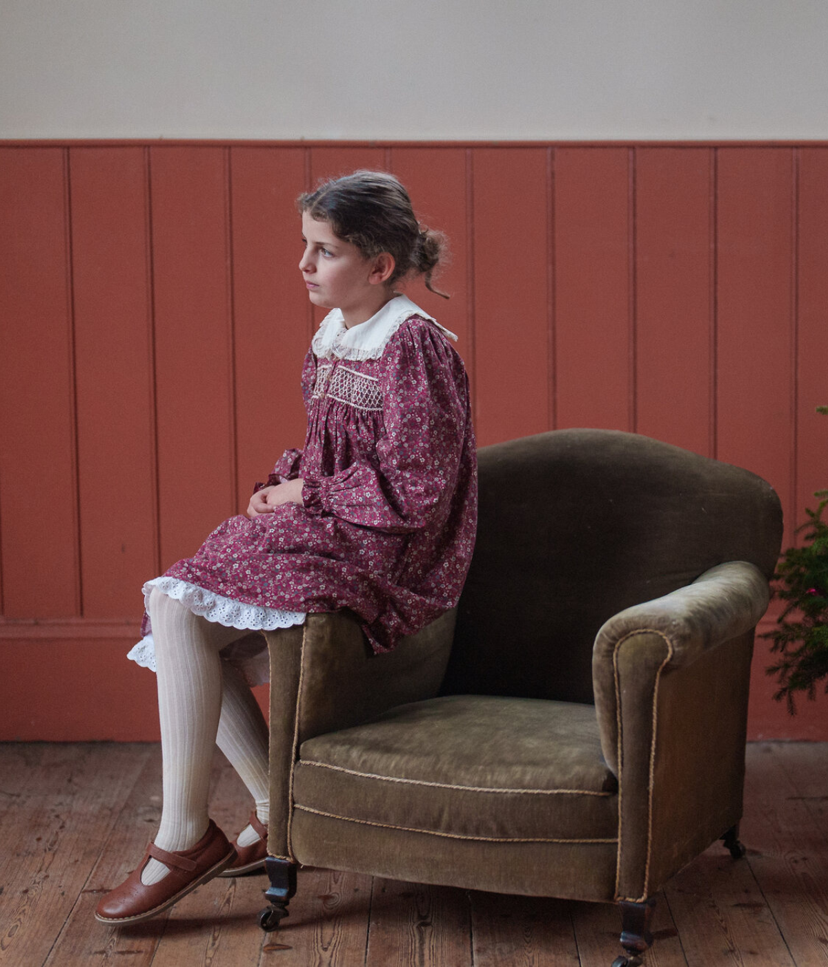 This beautiful vintage-inspired dress, is made in our organic clove floral print fabric. It has long, full sleeves finished with frilly cuffs, and a cotton sailor collar with gathered lace trim. The front button placket has a double row of buttons, either side of which are beautiful, hand-smocked panels
