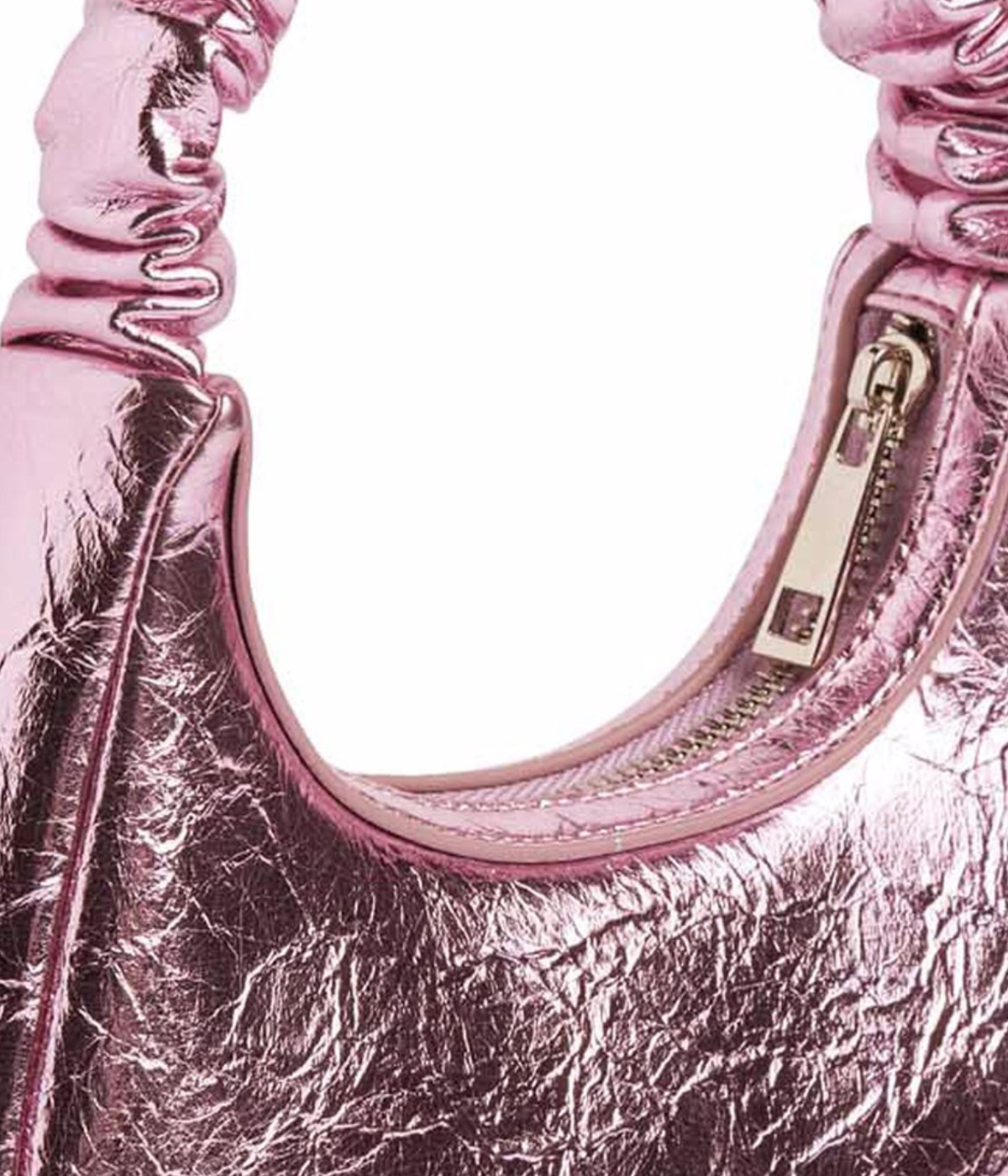 Cool metallic pink handbag with zip closure. The bag measures 25 cm in width and 13.5 cm in height.
