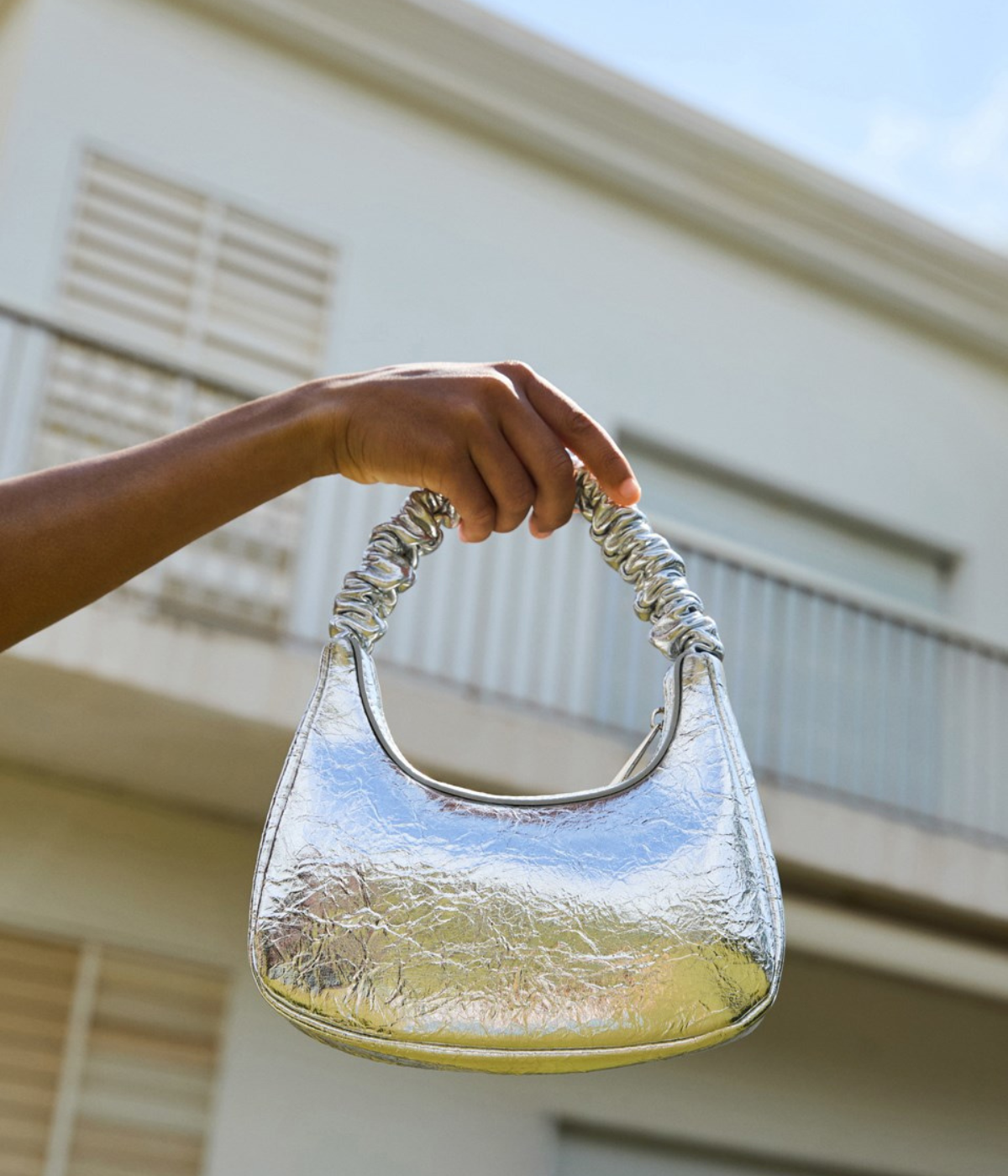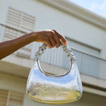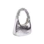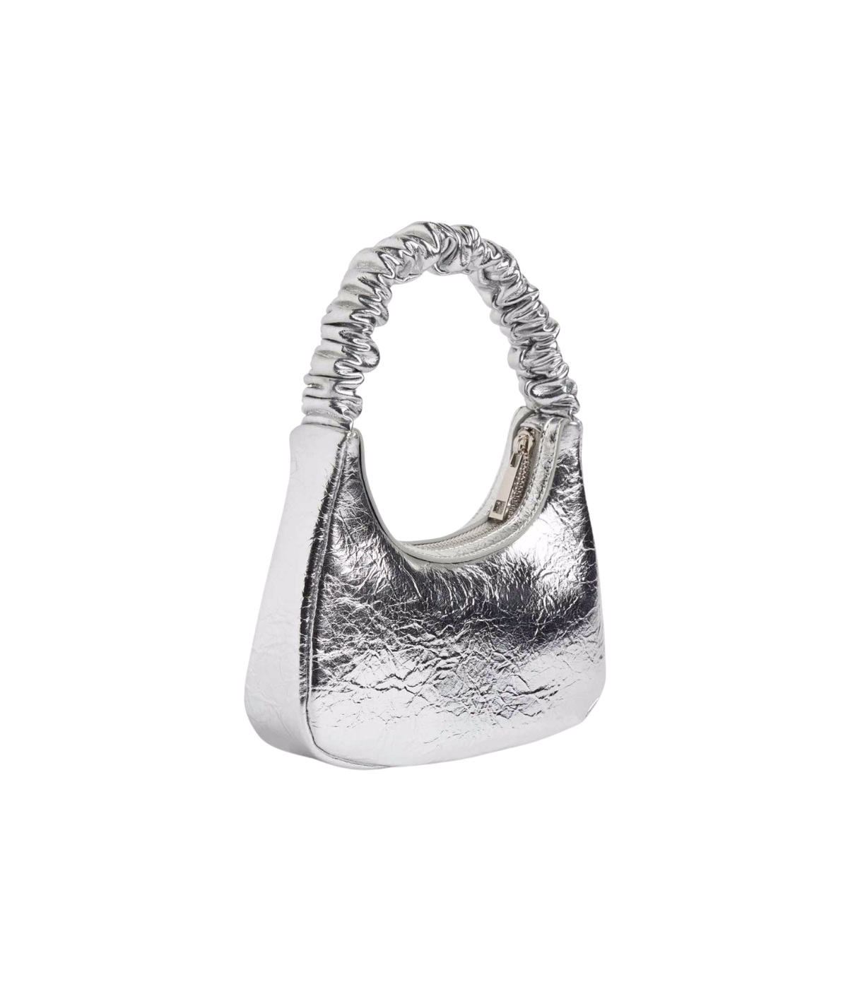 Cool metallic silver handbag with zip closure. The bag measures 25 cm in width and 13.5 cm in height.