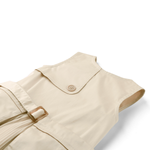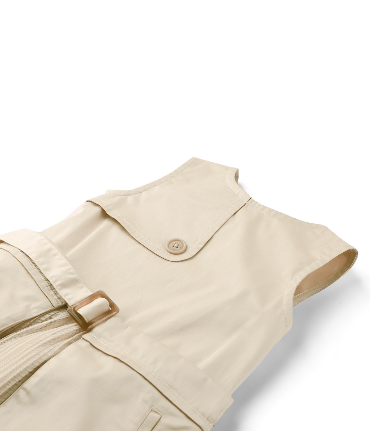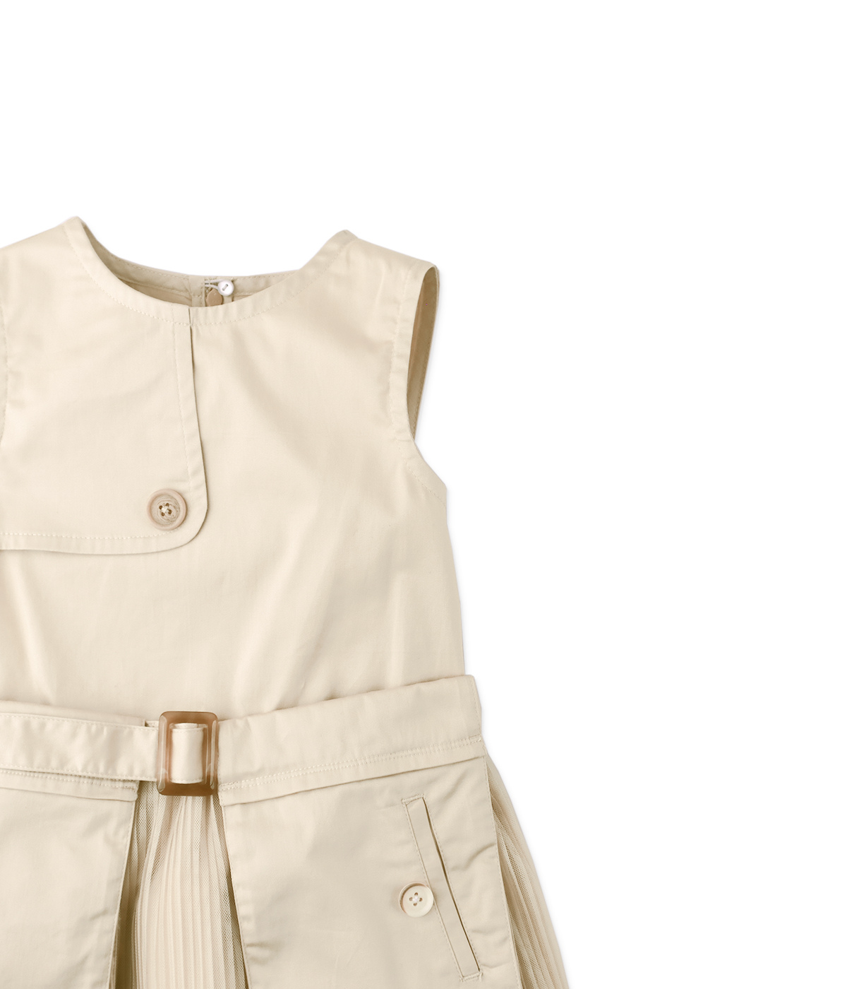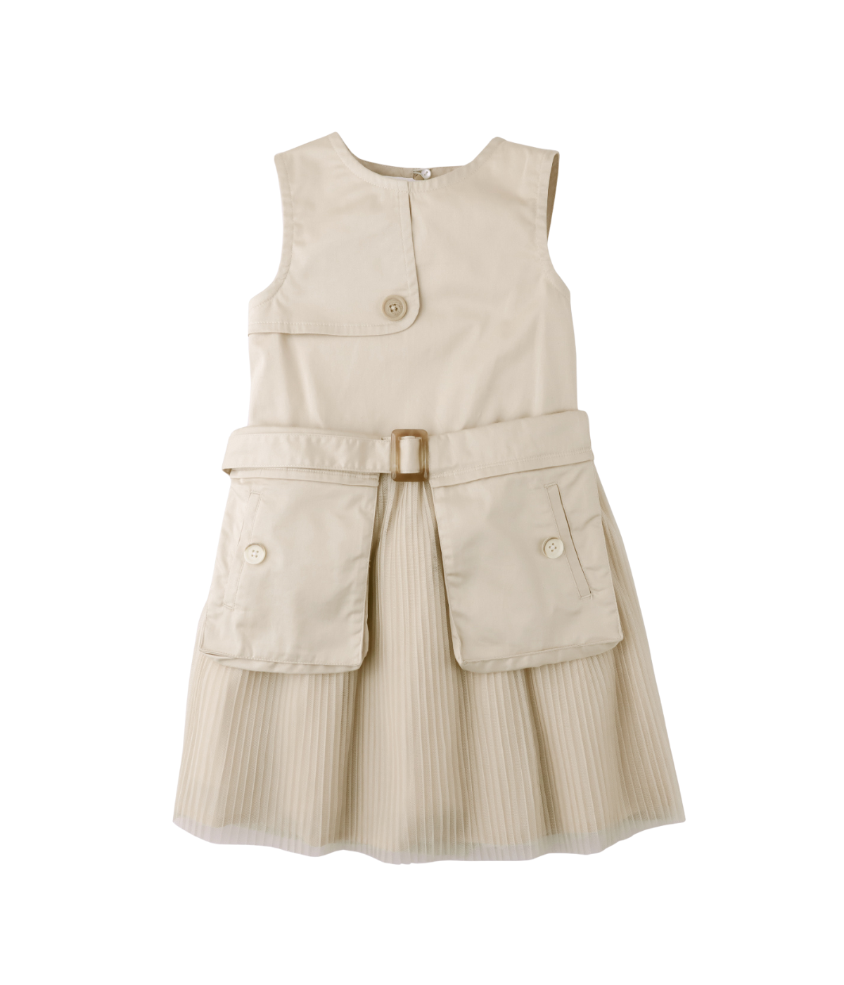 Girl Lucile Sleeveless Dress Beige With Pleated Skirt, Side Pockets, & Belt - Beige