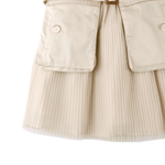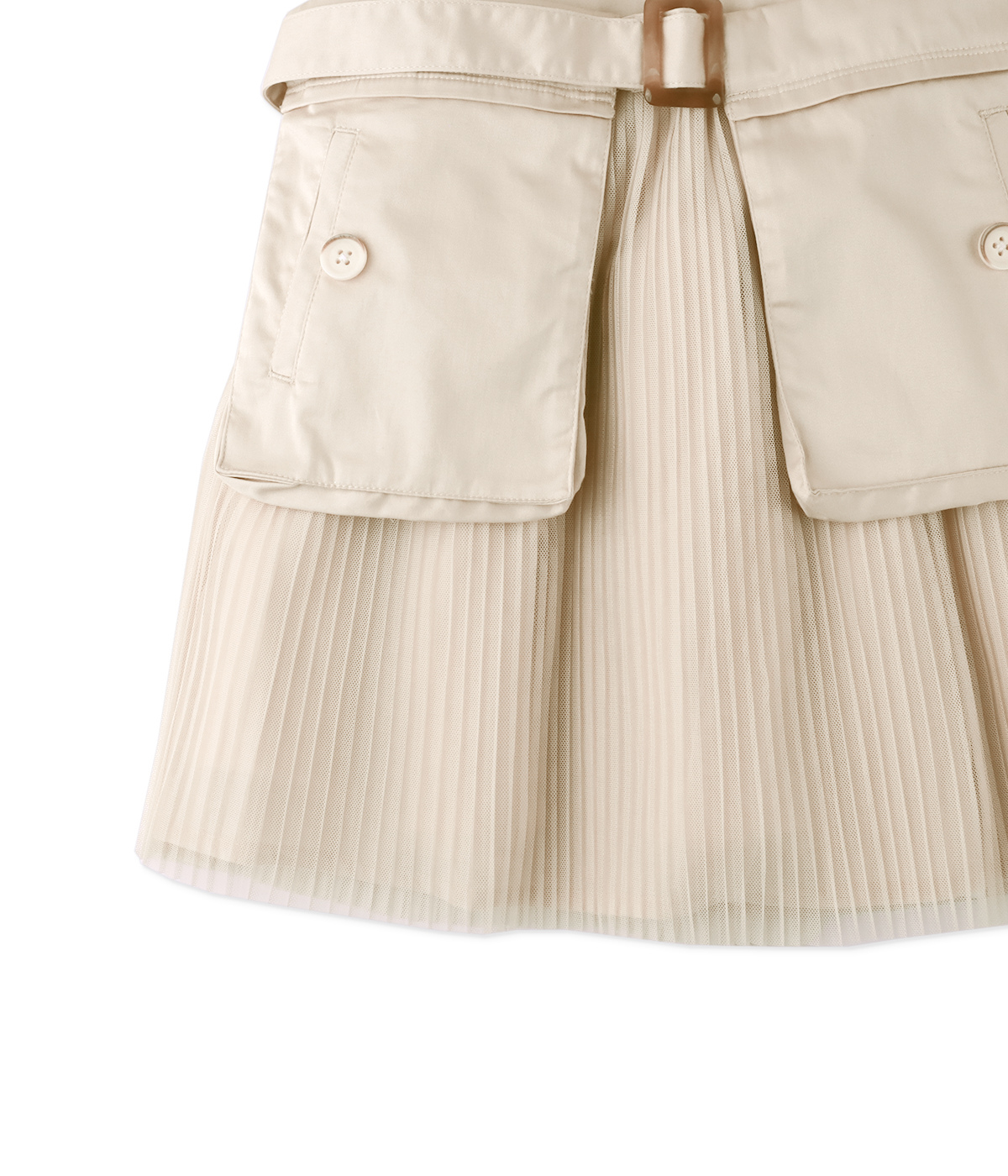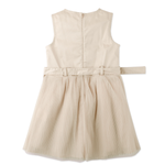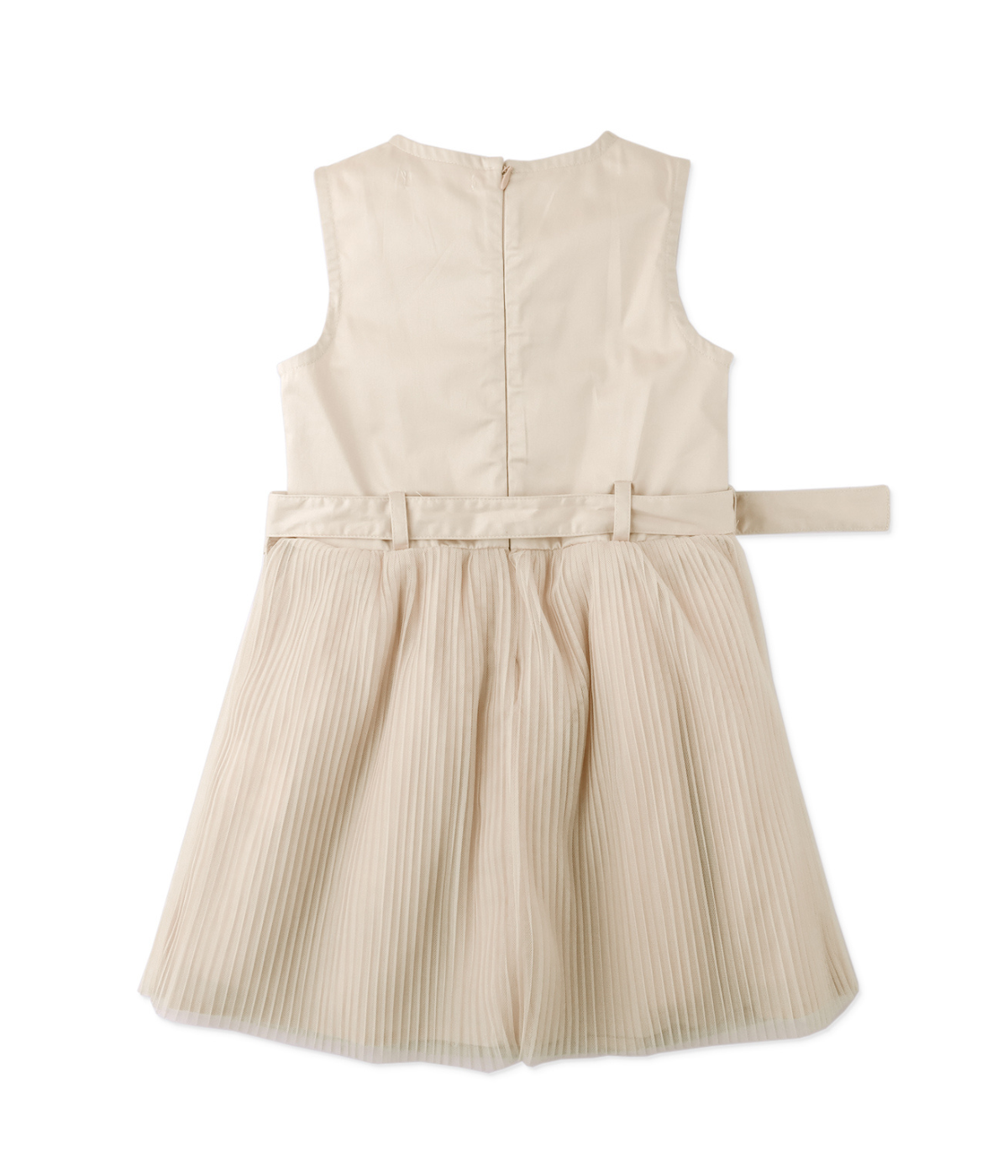 This charming sleeveless dress features a pleated tulle skirt, side pockets, and a belt, crafted from a soft cotton-nylon blend in an elegant beige hue, perfect for your little one's wardrobe.
