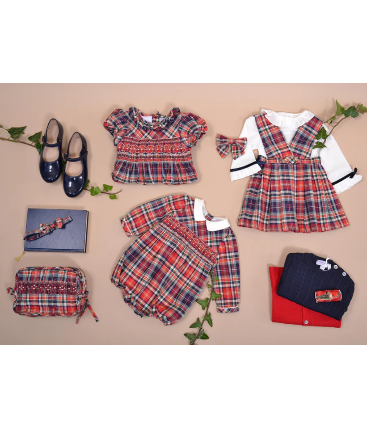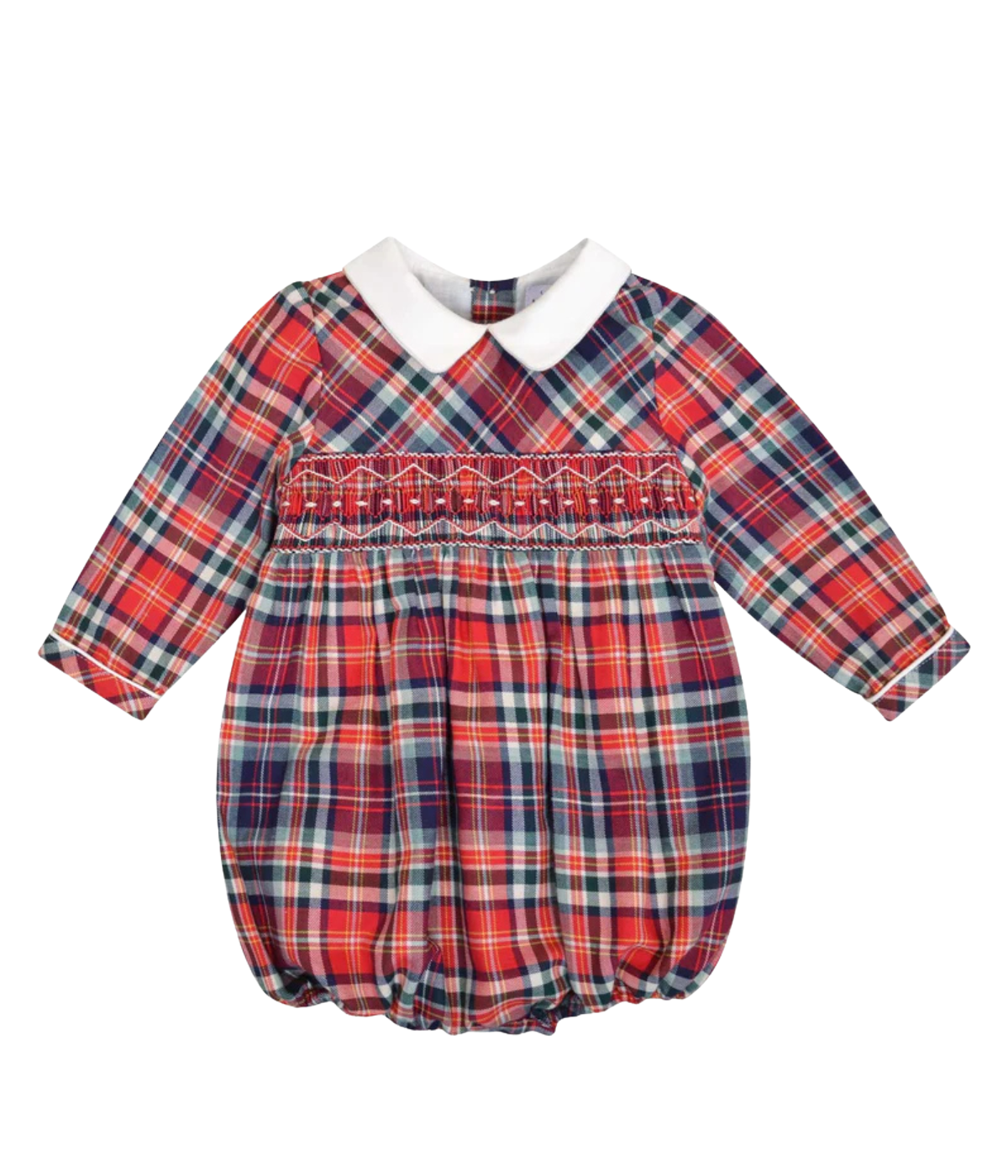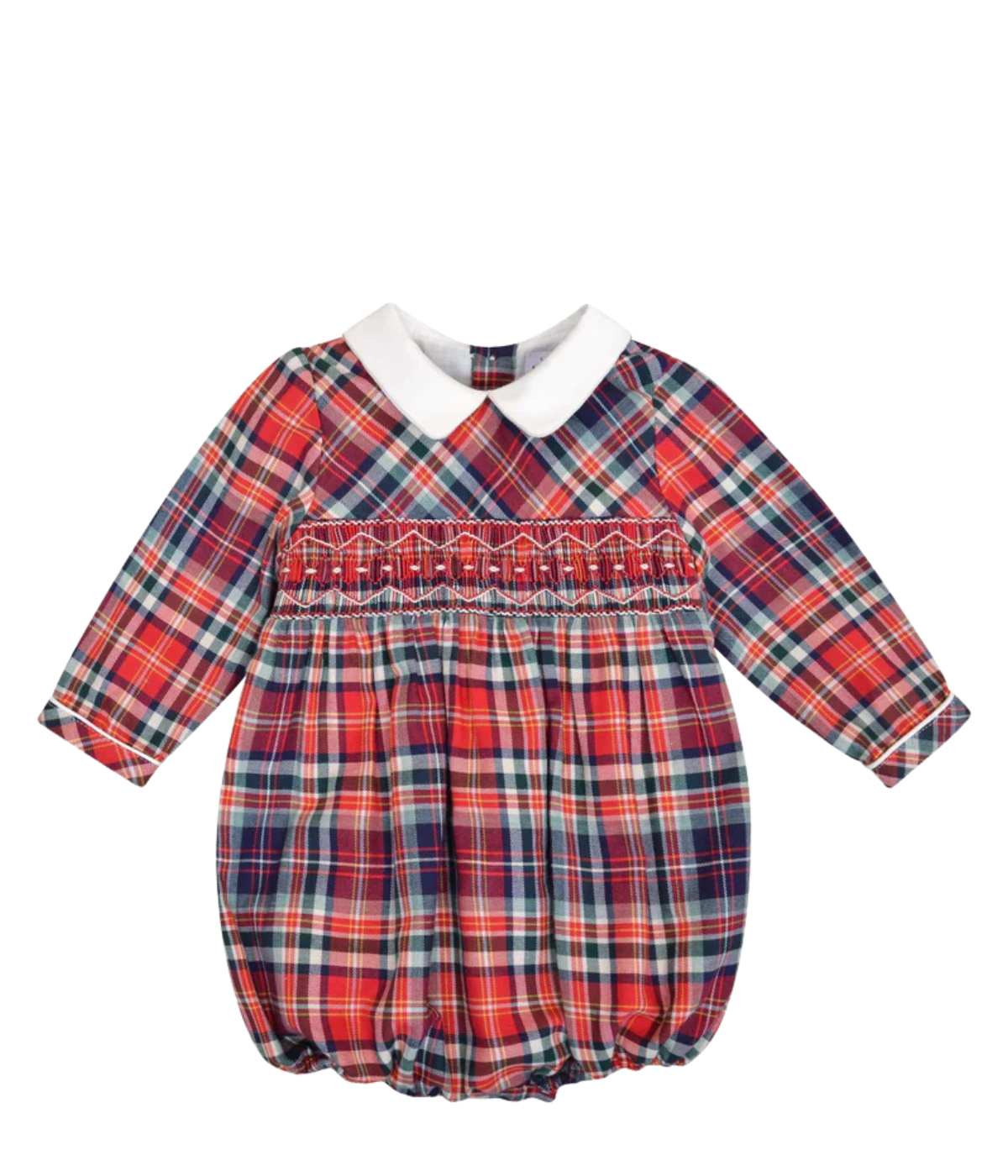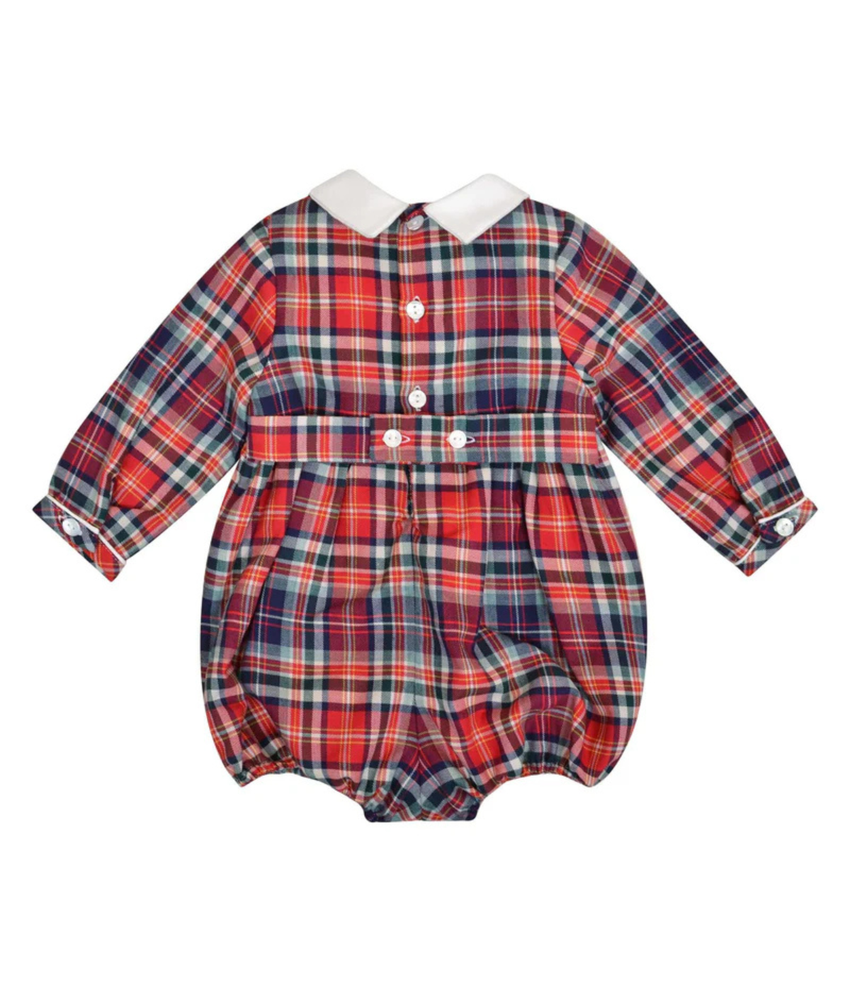 Mahé, Long-sleeved Baby Romper, Mac Milan Collar, Smocked Waist, in Red Tartan