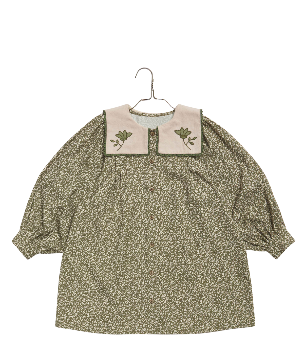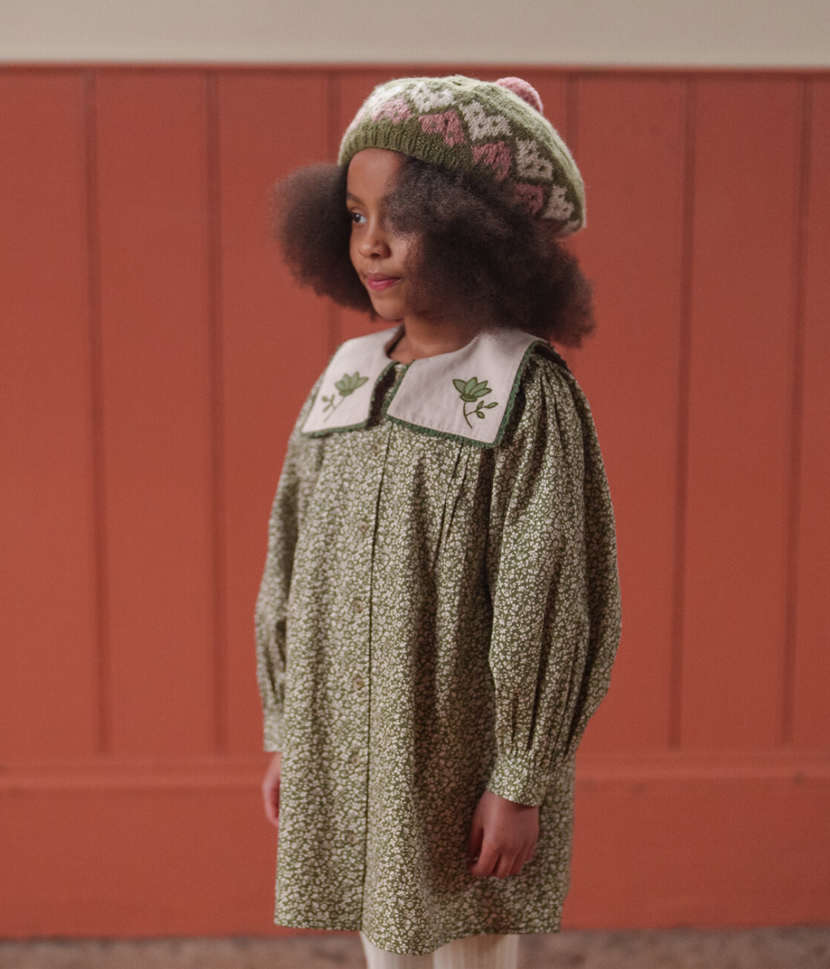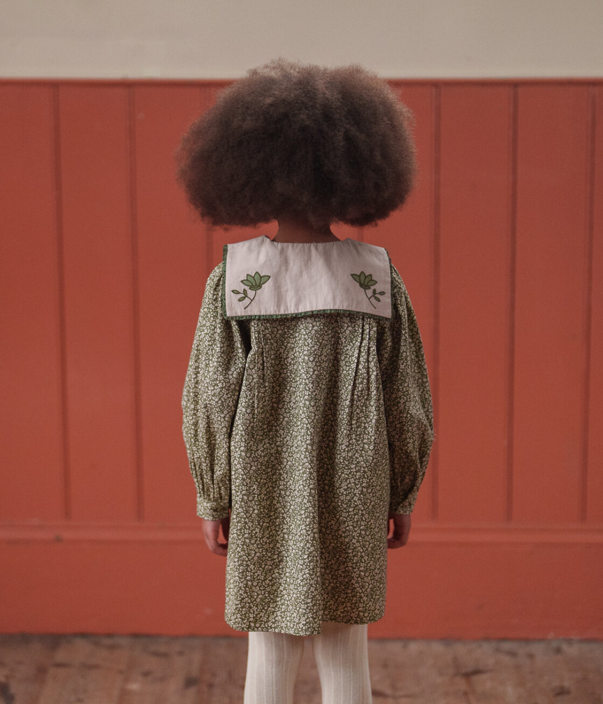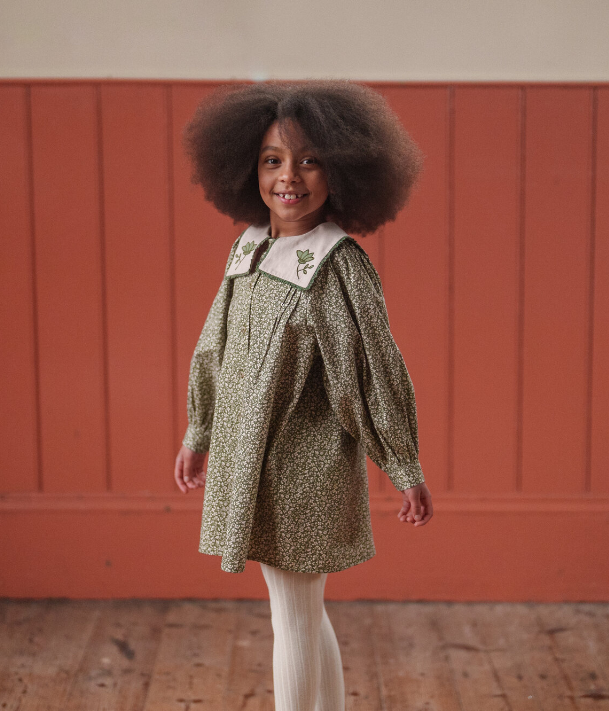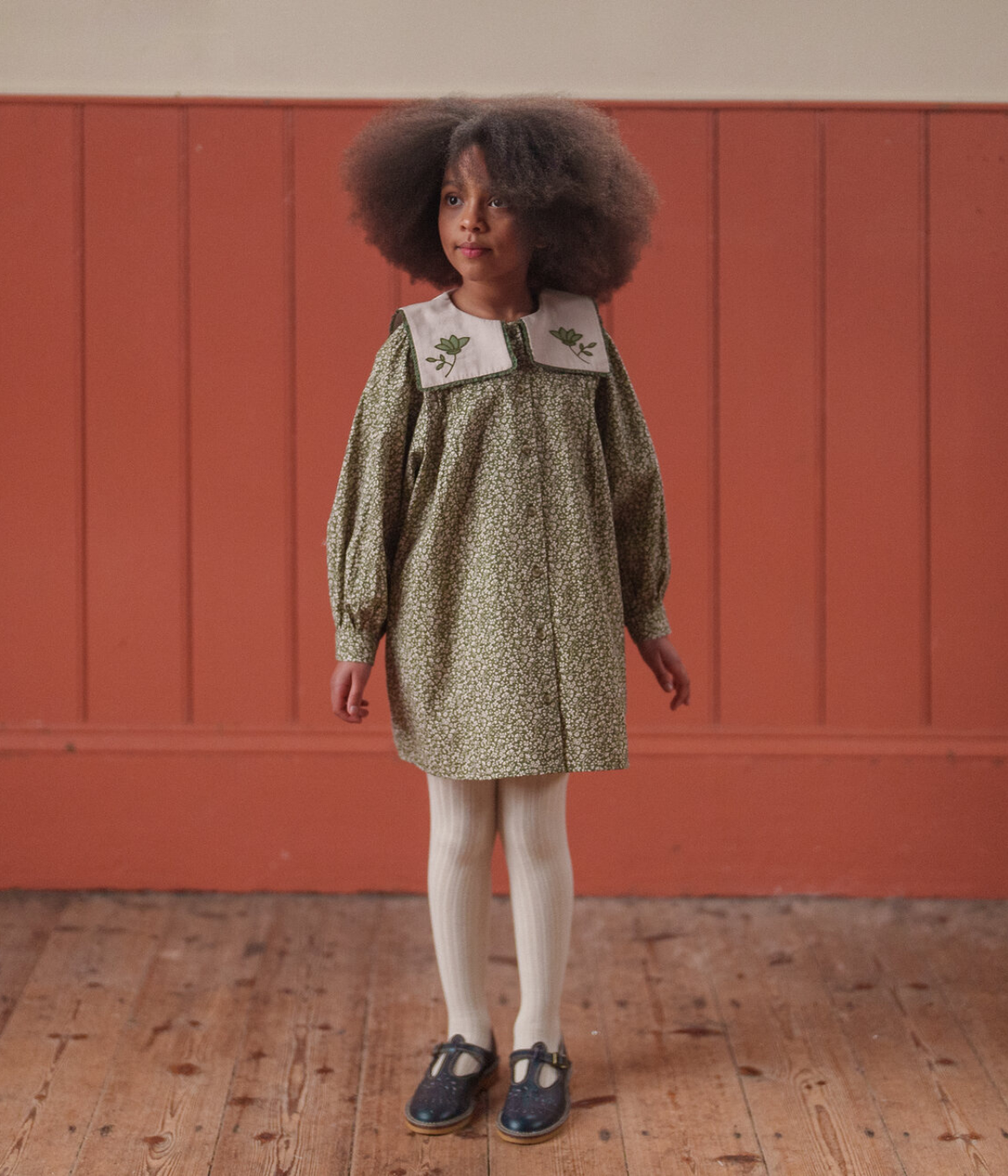 This beautiful Malia dress is made in our organic Combe floral fabric. The contrasting sailor collar has pretty, floral, appliqué motifs and gathered cotton crochet trim to the edge. The dress has tucks to the shoulders and full sleeves finished with neat little button-up cuffs. This dress fastens with buttons to the front.