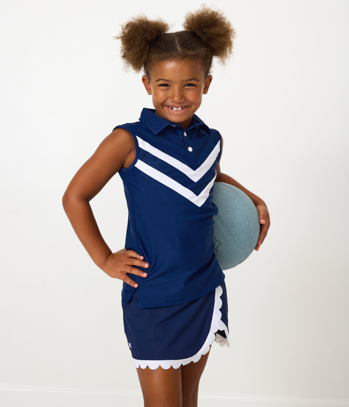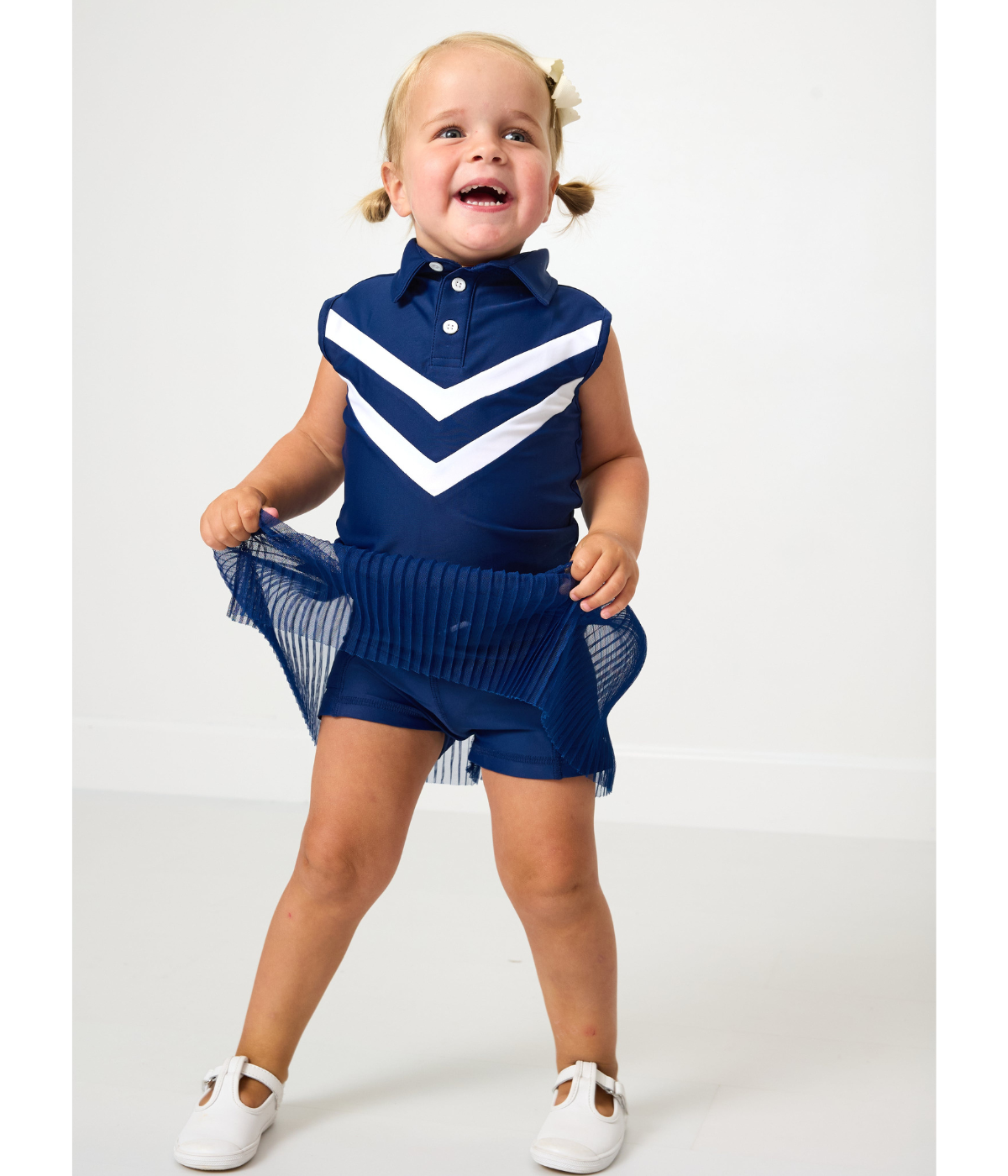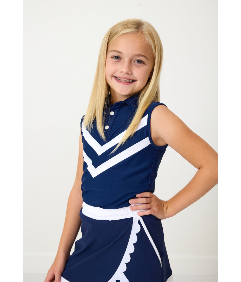 A throwback to classic cheer style, our girls cheer top brings retro spirit to the court and beyond. designed with bold v-stripe detailing and a polished collar, this sleeveless polo is made from breathable performance fabric that keeps her cool and confident. perfect for pairing with skorts or shorts, it’s an easy win for game day, practice, or just showing her team spirit.