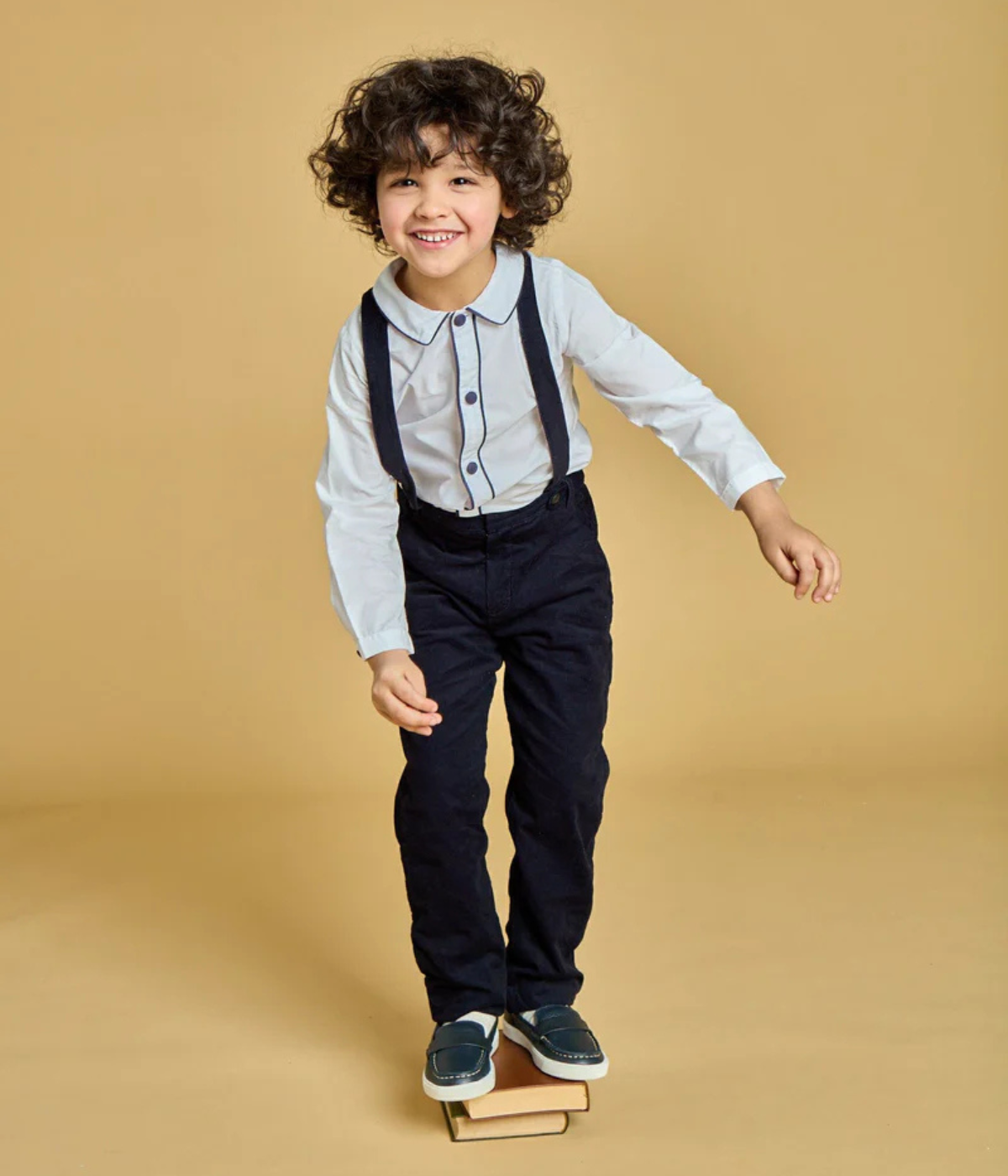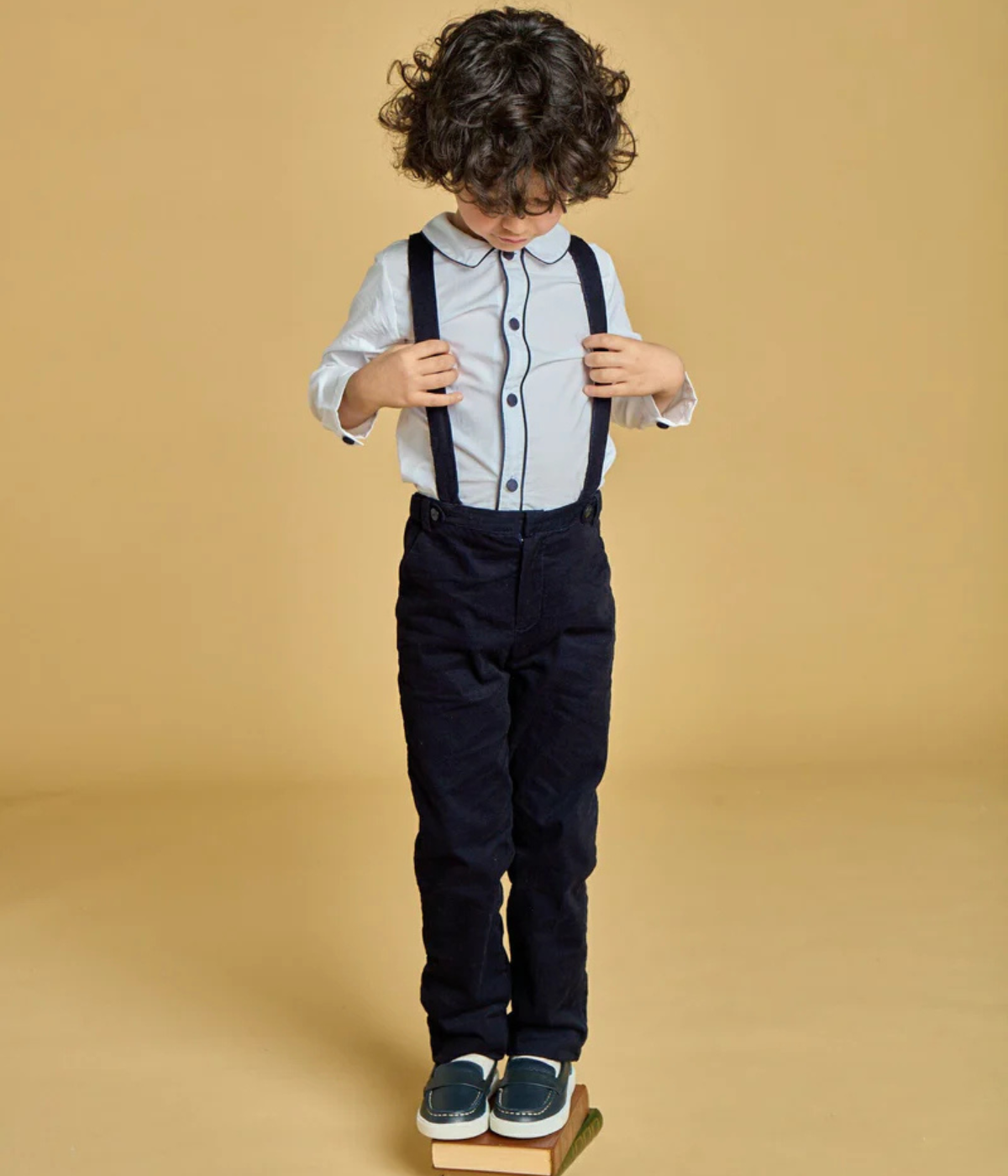 Noa is a white cotton poplin shirt with long sleeves. It is as elegant, lined with navy piping at the collar and facings. Its buttons are covered one by one by hand.