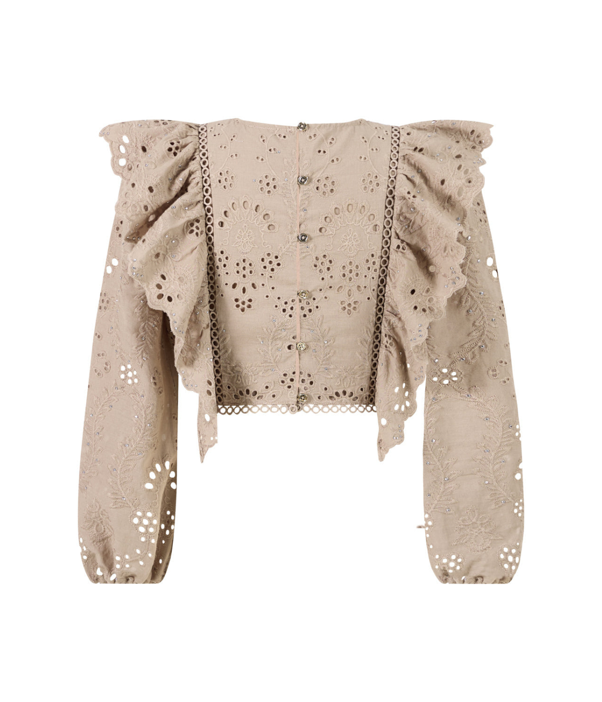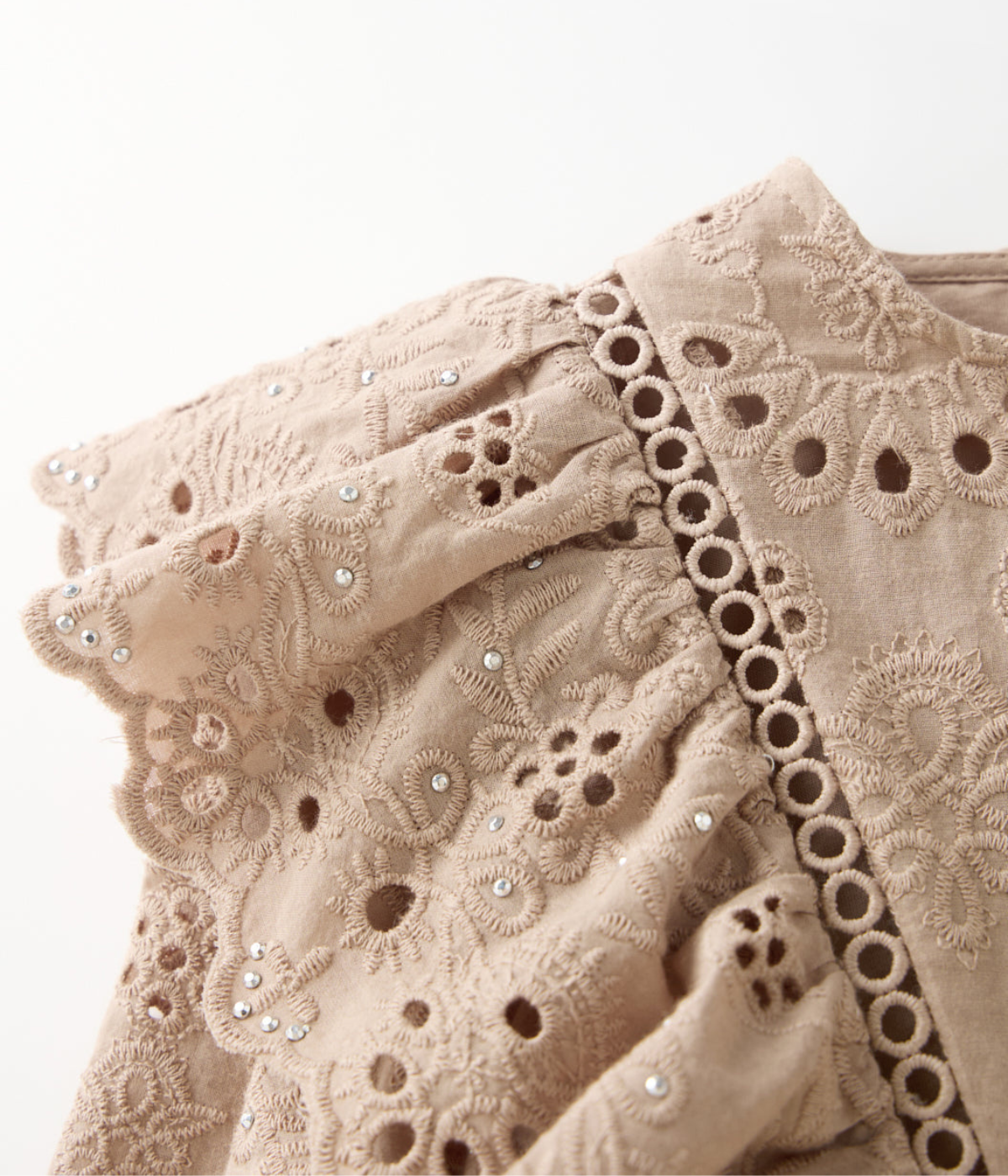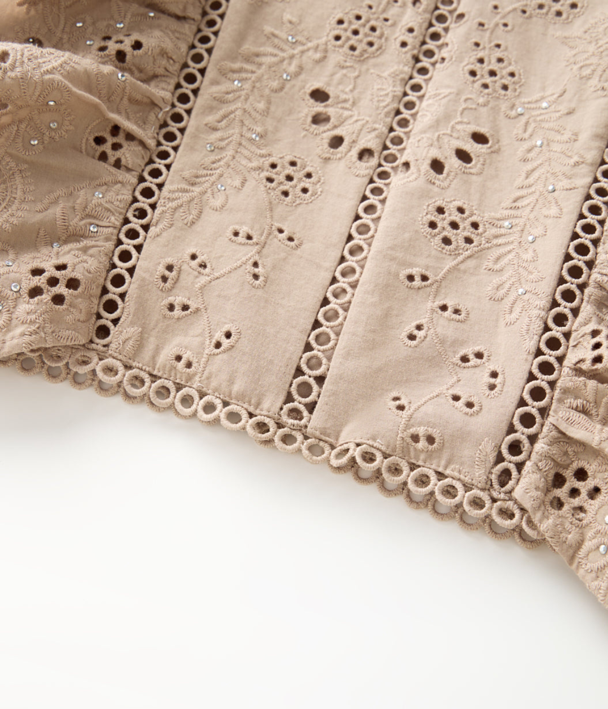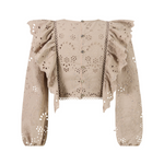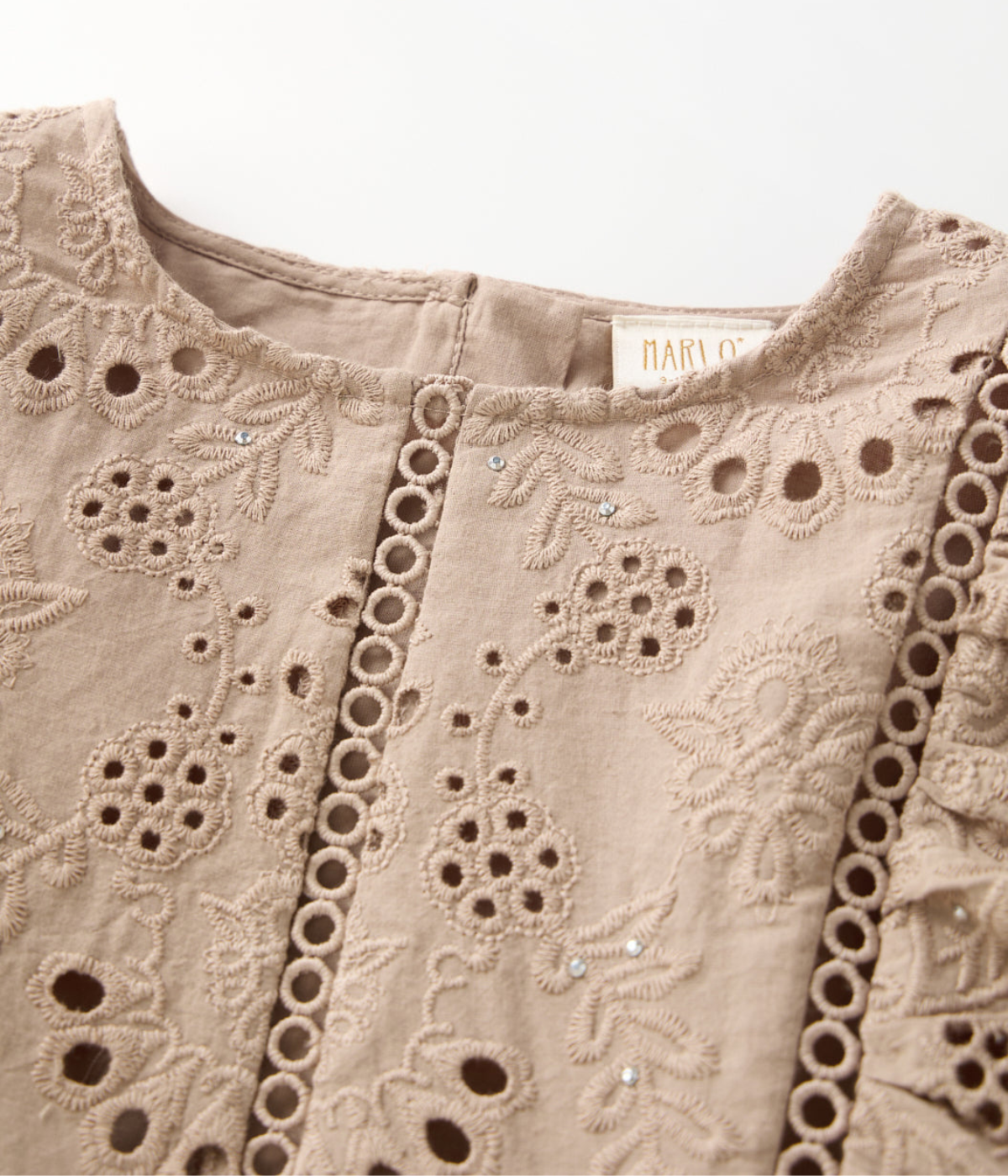 The Otillie Embroidered Top is effortlessly elegant with its intricate stitching and neutral taupe tone. Pair with the matching Otillie Pants or Otillie Skirt for a timeless and elevated look.