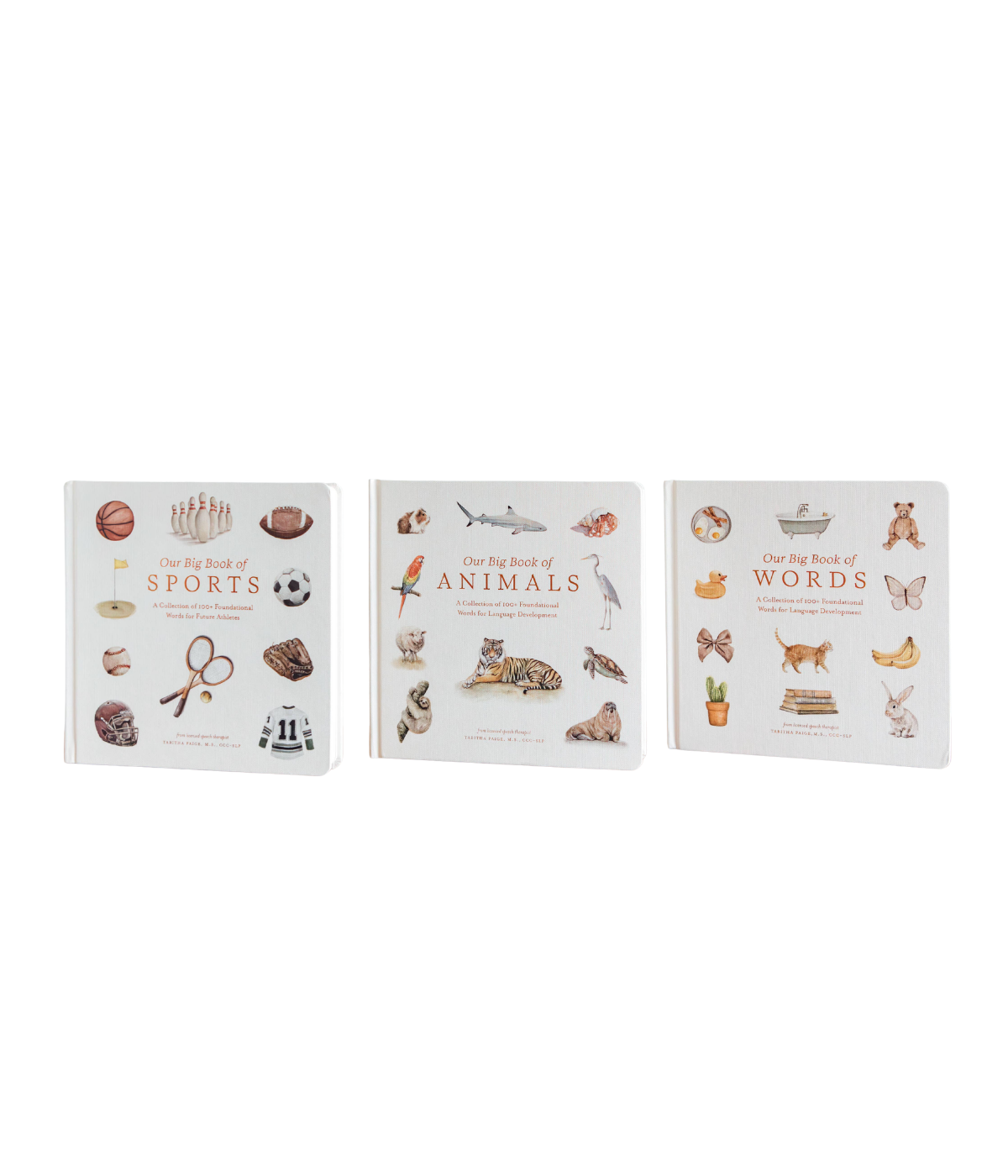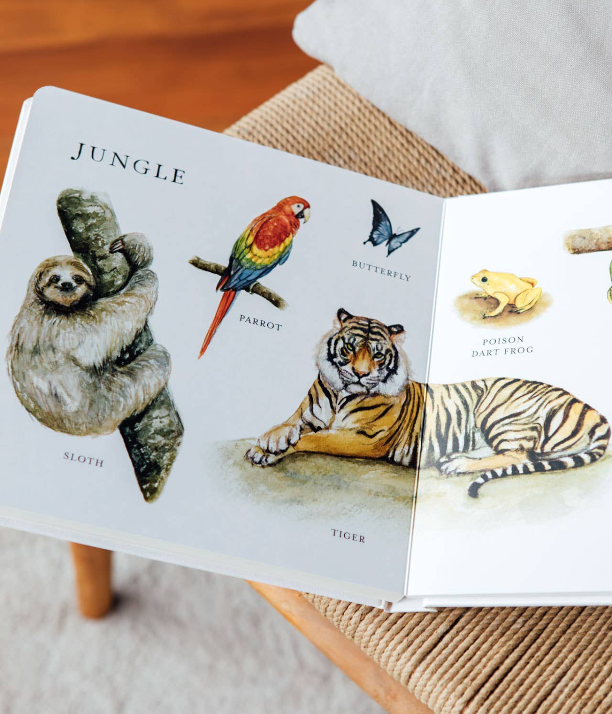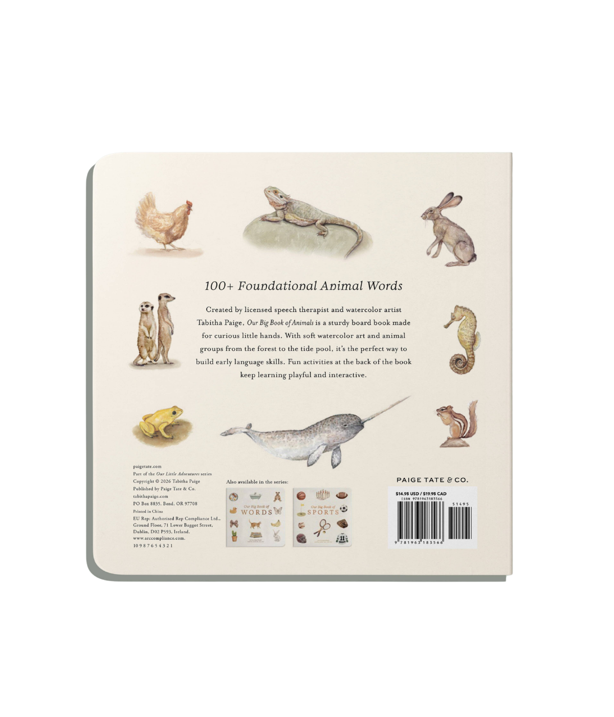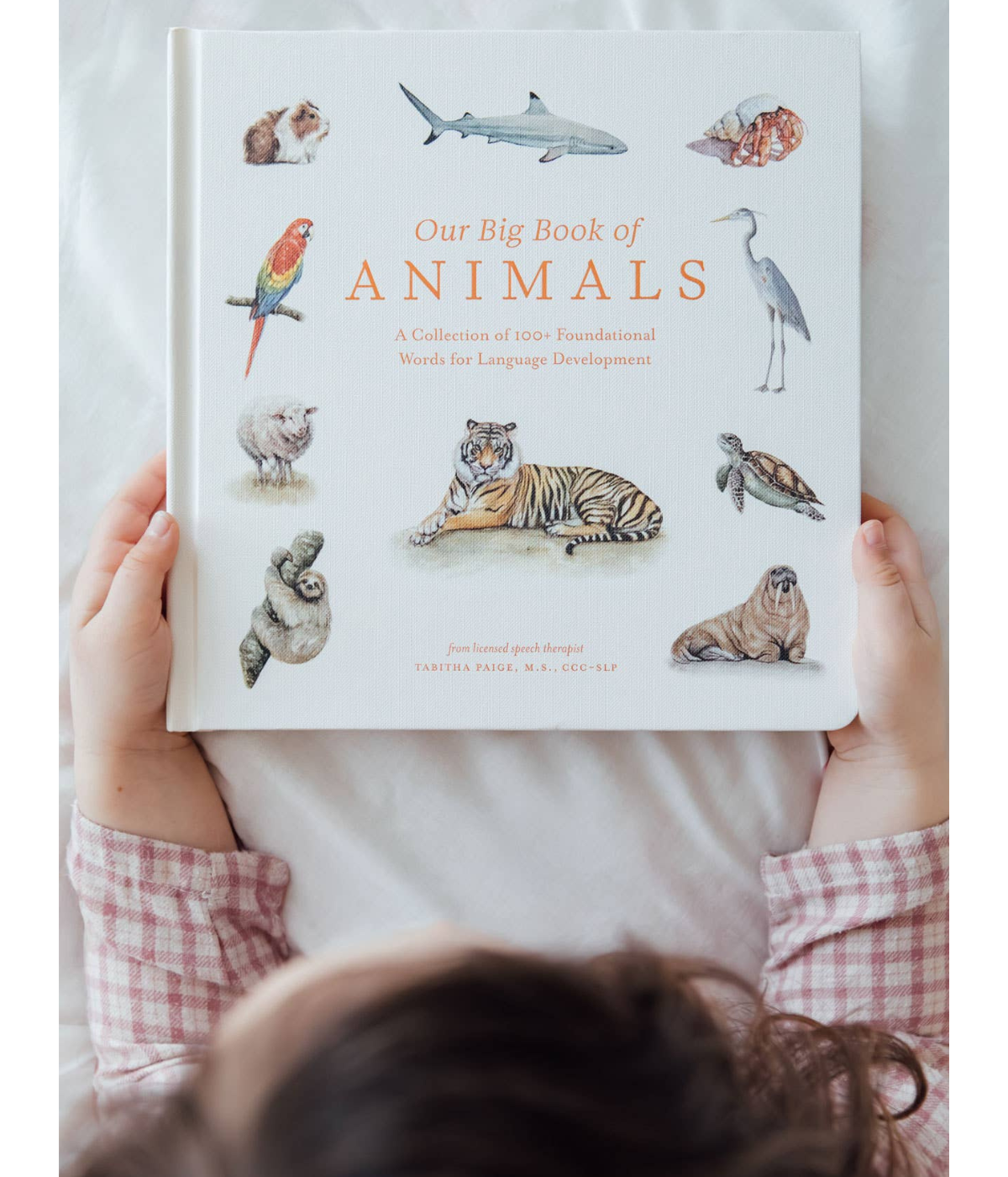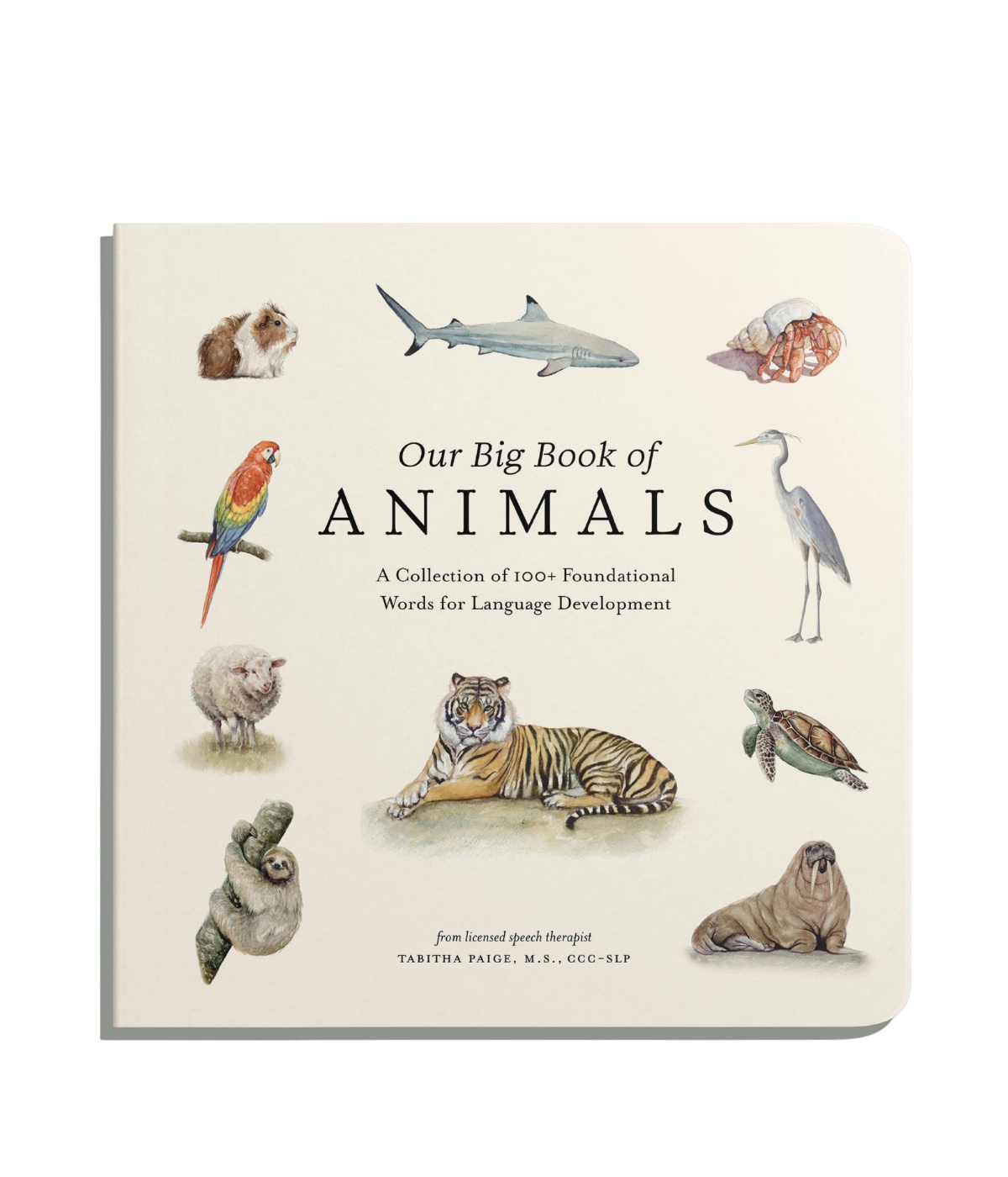 Designed by a professional watercolor artist and licensed speech therapist, Our Big Book of Animals includes charming watercolor illustrations and foundational first words that will help you build your child's vocabulary. The durable materials and small book size also make them perfect for your baby's little hands. The back of this first words book also includes a "seek and find" activity to help parents encourage their little ones to learn to identify the pictures on the page.