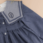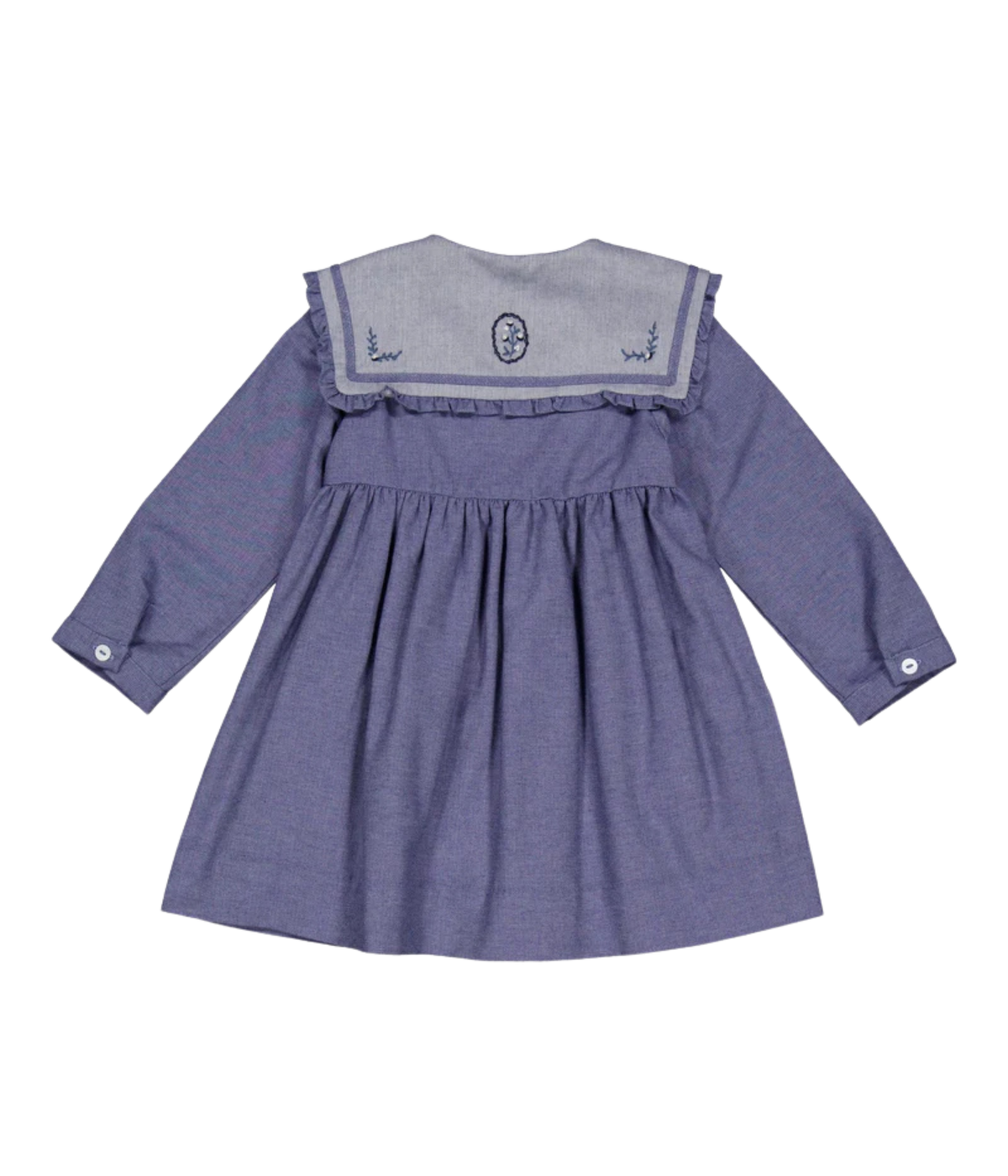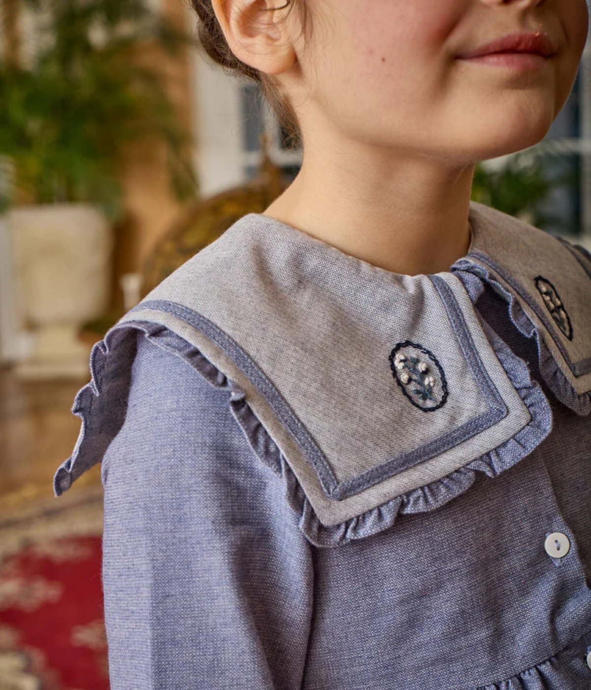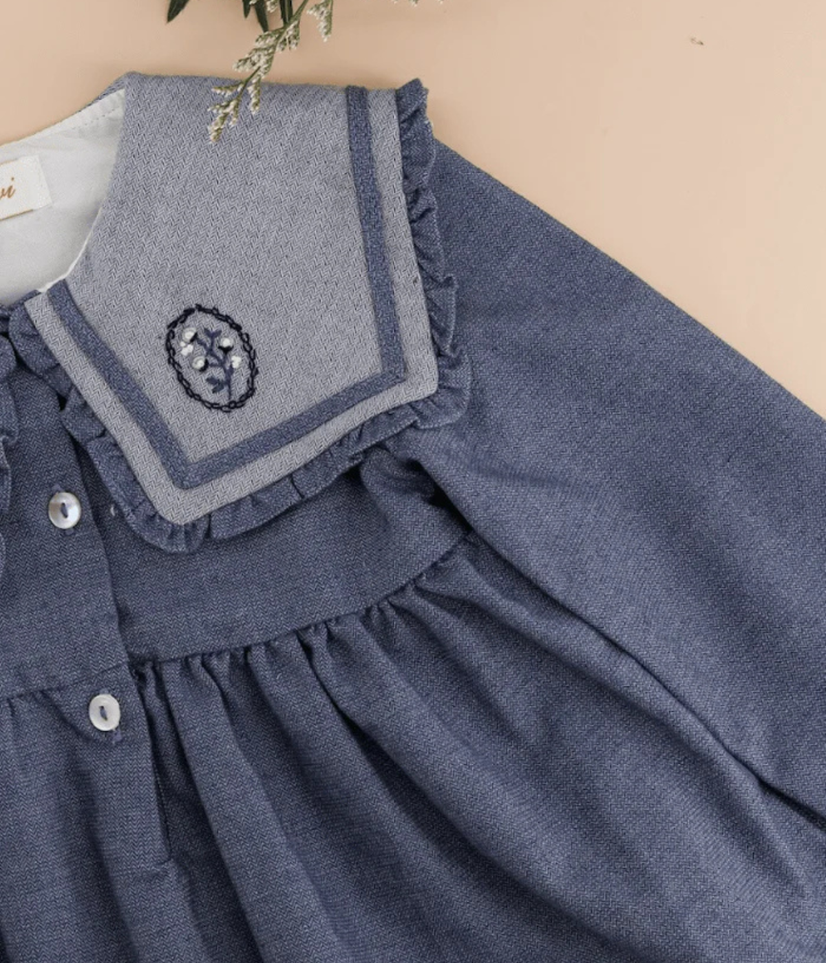 Long-sleeved straight dress, ruffled boat neck embroidered front and back, front opening, in blue denim light herringbone.