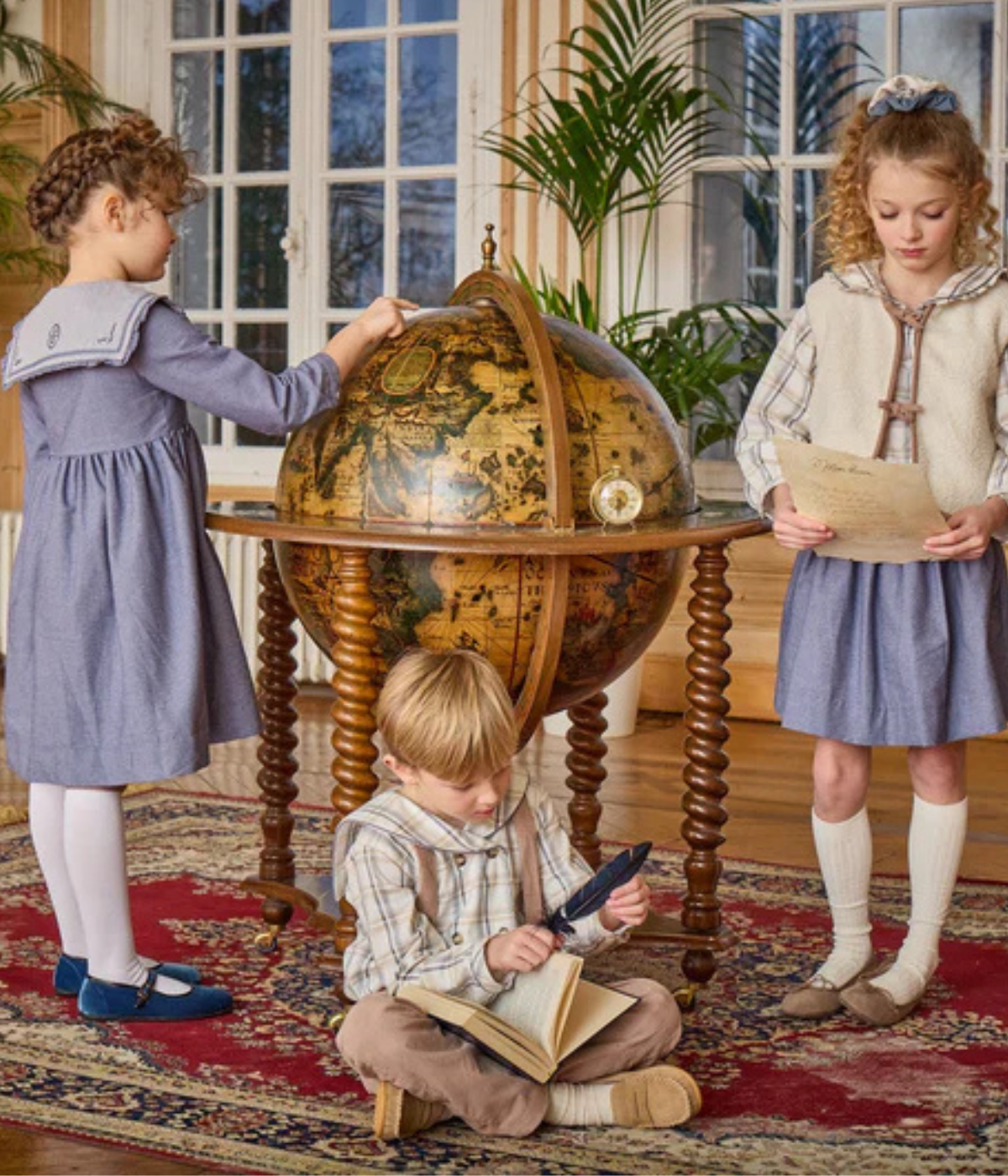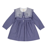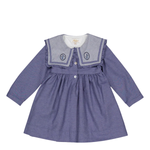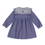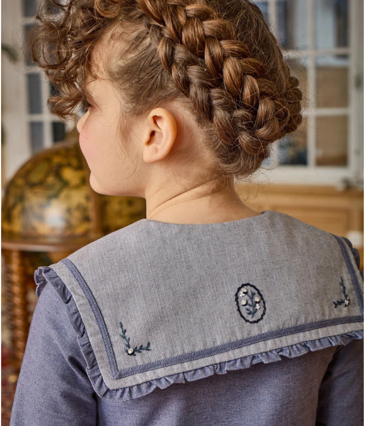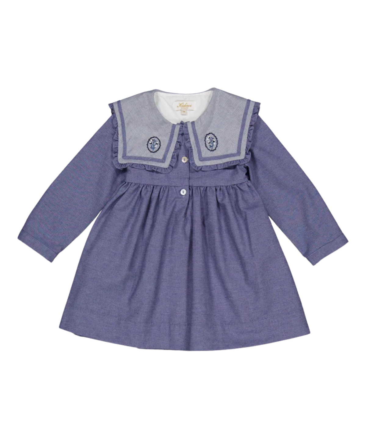 Long-sleeved straight dress, ruffled boat neck embroidered front and back, front opening, in blue denim light herringbone.