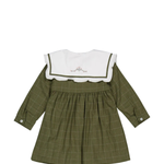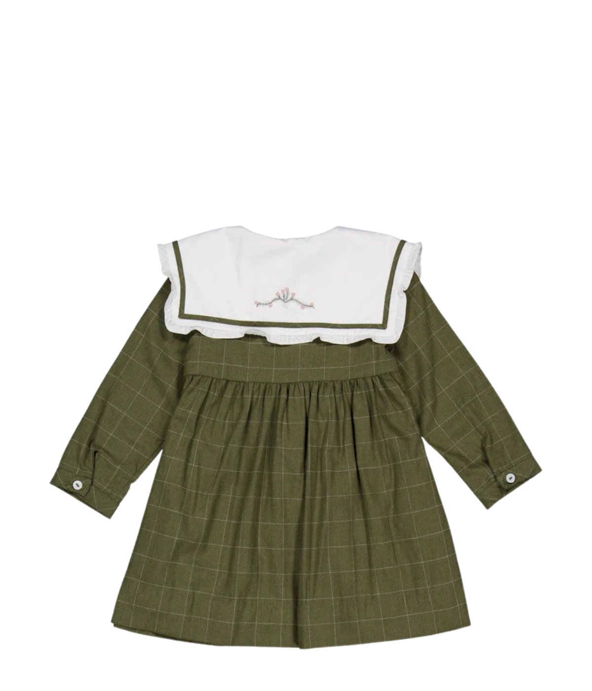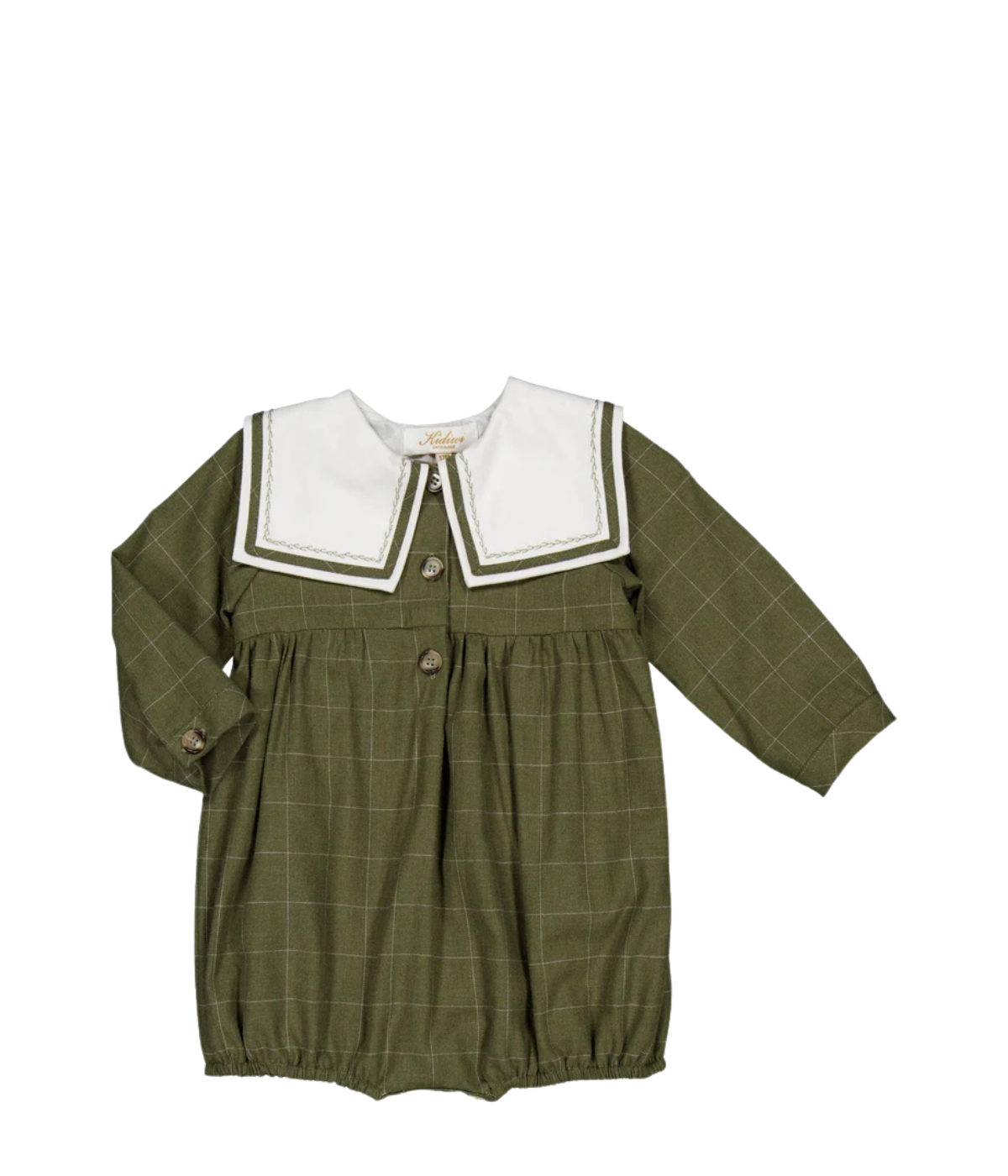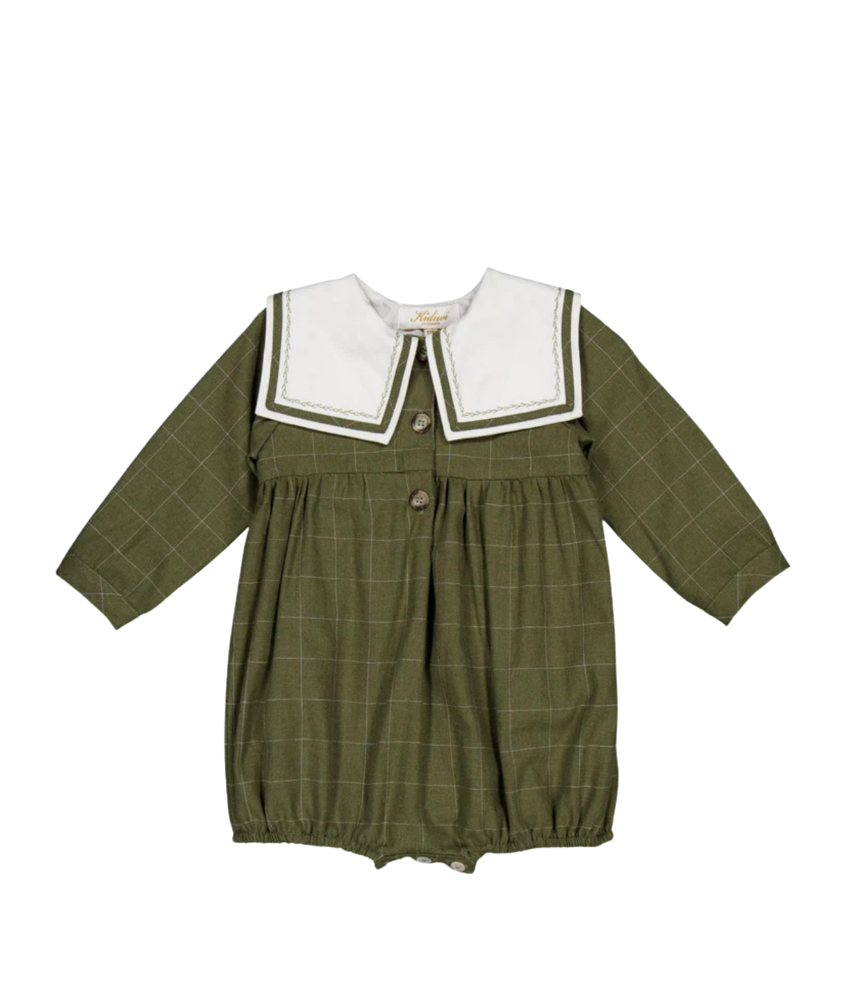 Crafted from 100% cotton in Kaki checks, this piece not only feels soft on your baby's skin but also offers durability. The embroidered sailor collar adds a touch of elegance, and there is also an opening at the front for added practicality.