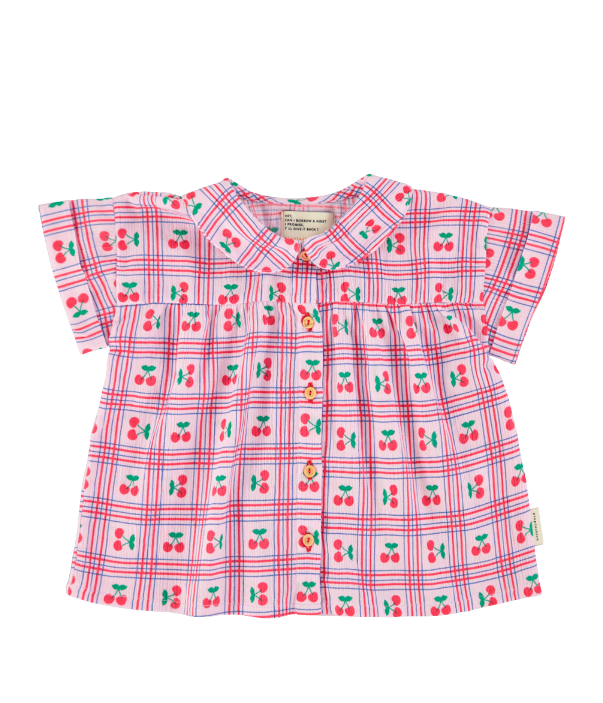 Peter Pan collar shirt with short sleeves. Wood buttons on front. Pleated effect.