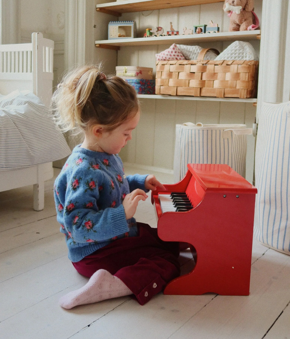 High gloss miniature piano with 18 keys. A small wooden holder for notes is included with the piano.