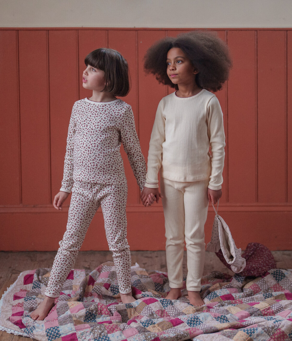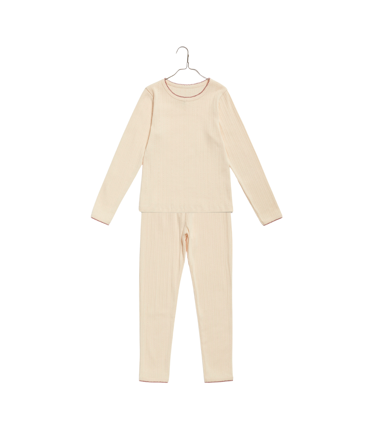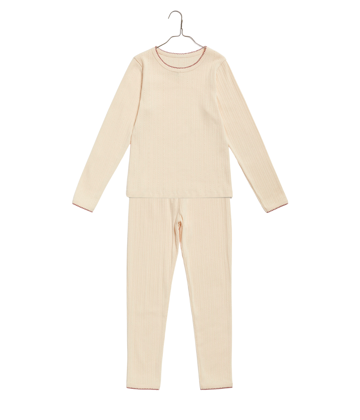 Snug fitting, organic pointelle pyjamas made in our organic, pointelle jersey fabric.