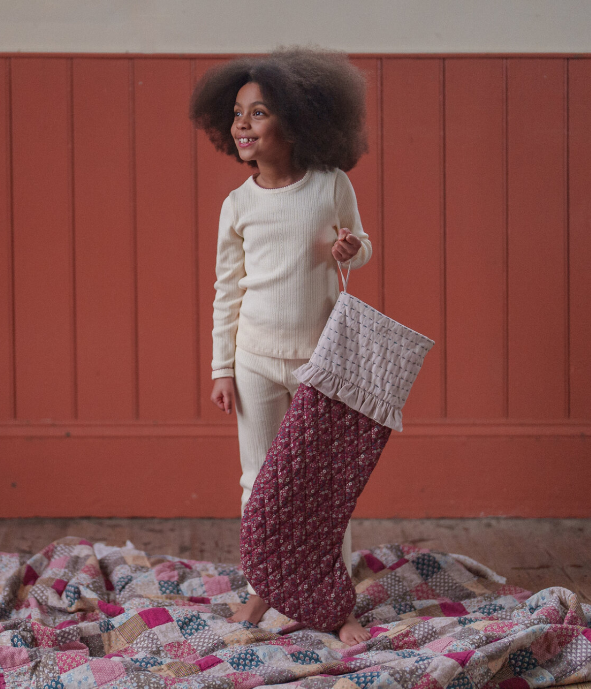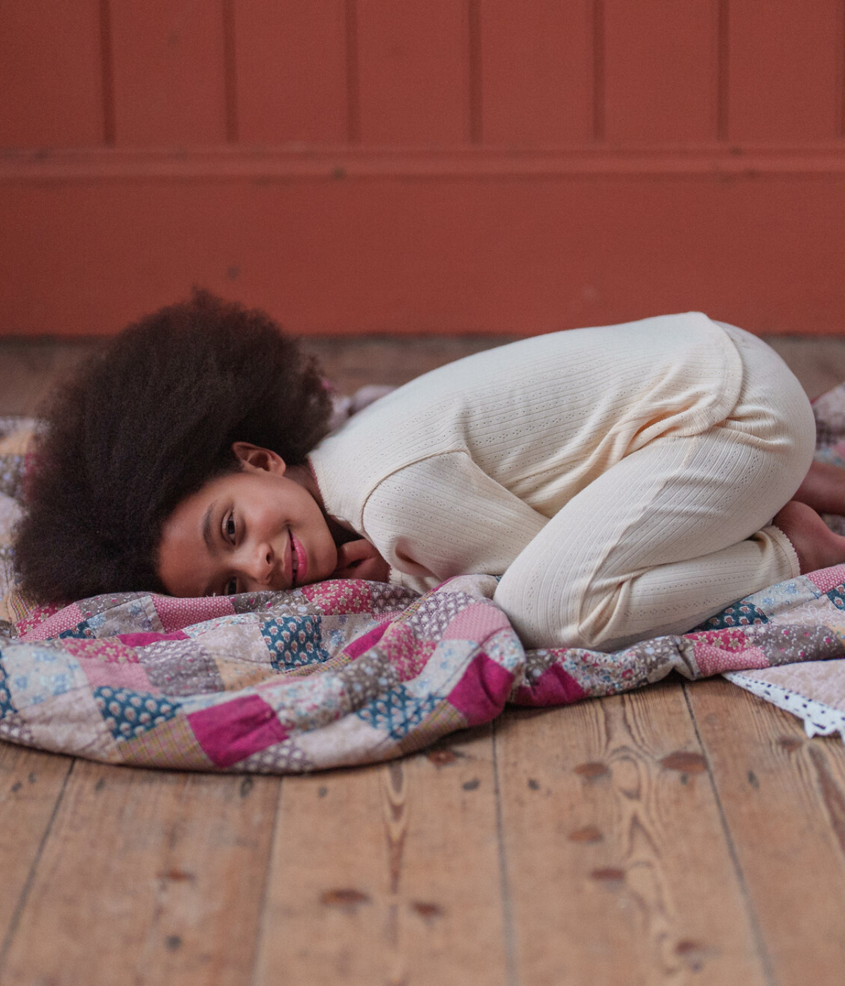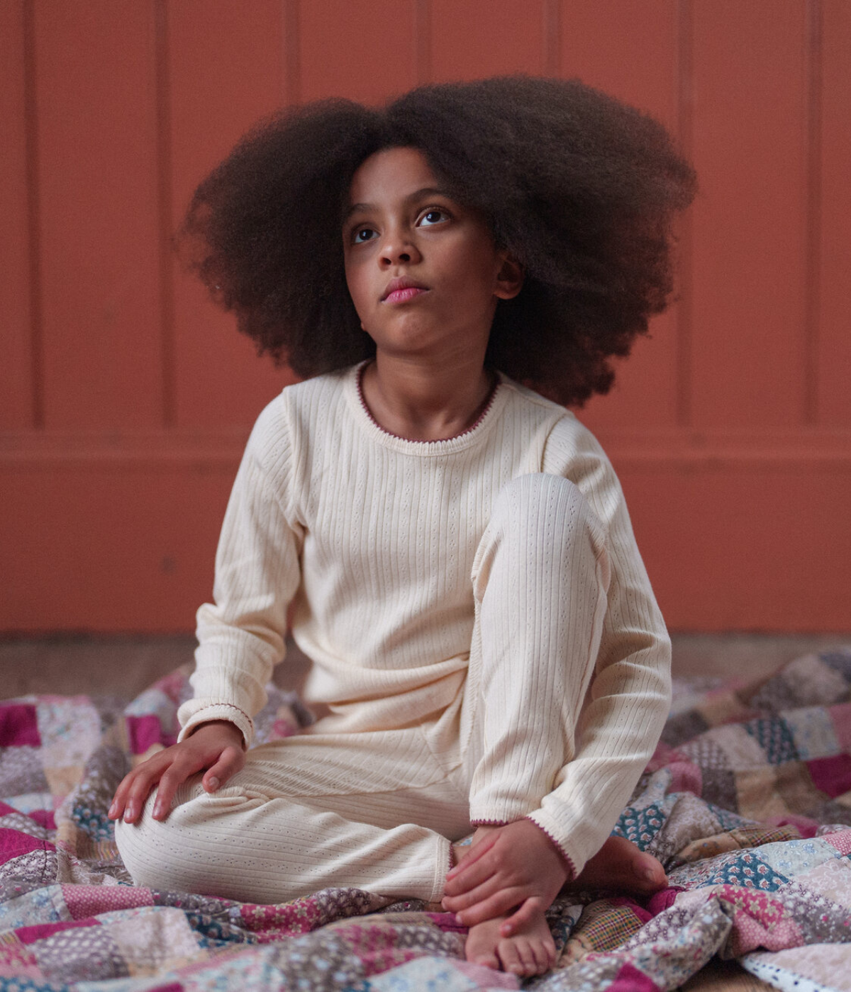 Snug fitting, organic pointelle pyjamas made in our organic, pointelle jersey fabric.